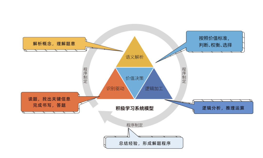 经过不懈地努力,宋老师建立了“积极学习系统理论”。该理论认为,每个学生都有一套自发形成的学习操作系统,由识别驱动、语义解析、逻辑加工、价值决策和程序定制五个模块构成,是学习知识、技能和形成个人价值观的底层支撑载体。