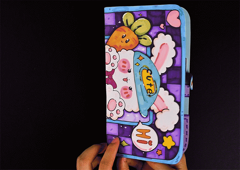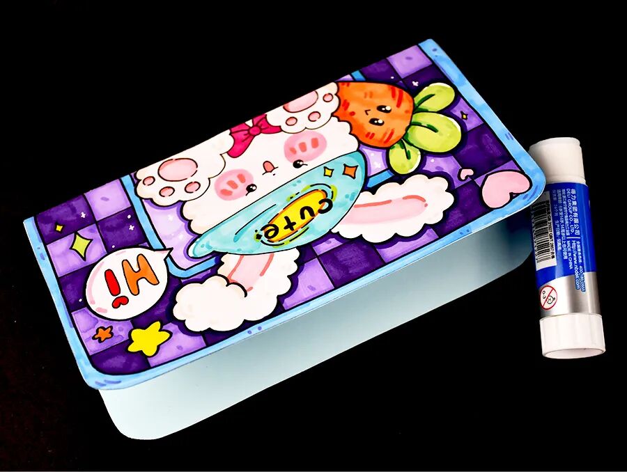 1.将纸张对折,表现出文具盒能开合的特点,并为文具盒设计图案和搭配色彩,使文具盒更加美观、富有个性。