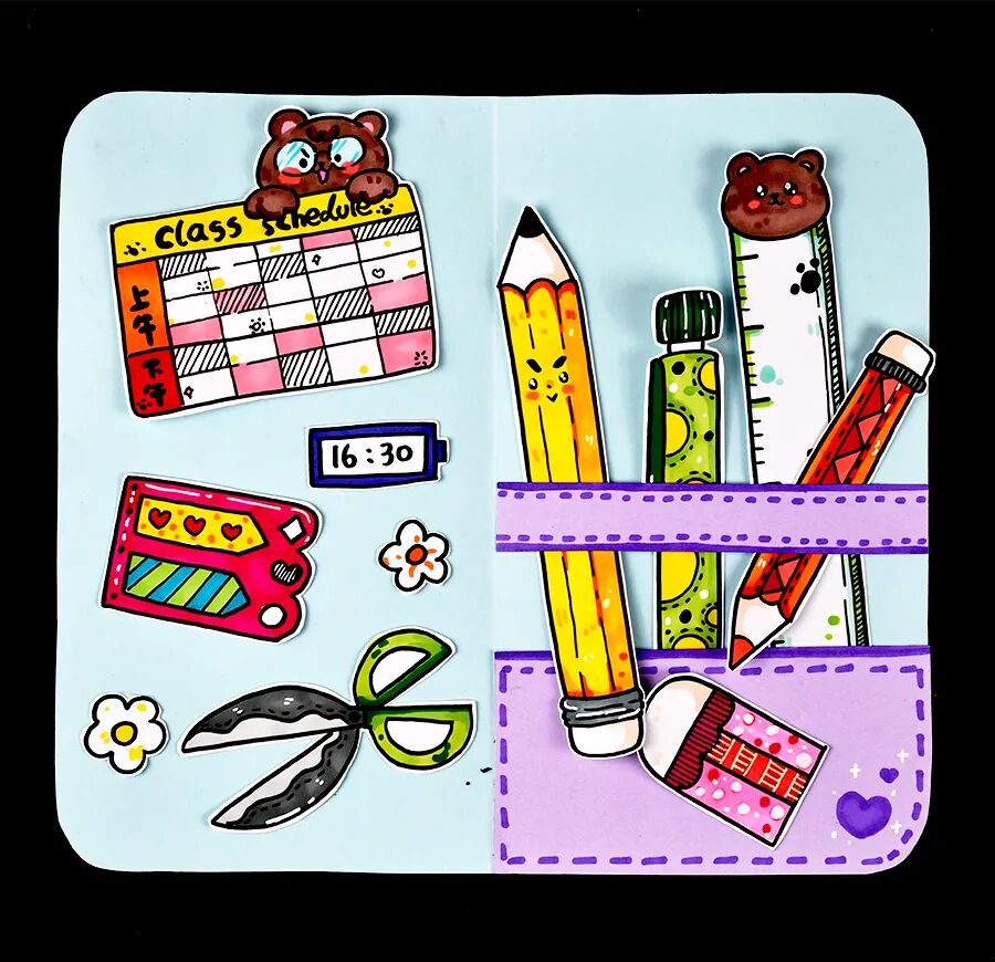 当我们打开文具盒,会发现里面藏有哪些神秘的文具呢?圆珠笔、铅笔、橡皮擦、尺子、剪刀、你藏着的有趣的小物件……其实,文具盒中的世界是非常丰富的,它涵盖了我们日常学习和工作所需的各种工具。让我们激发自己的想象力,不受限制地思考文具盒中可以容纳哪些文具,将这些生动的、充满创意的文具用水彩笔画出来,并逐一剪下来,粘贴在我们之前制作的文具盒内。这样,文具盒就不仅仅是一个简单的存放工具,它更是展现我们想象力和创造力的小舞台。