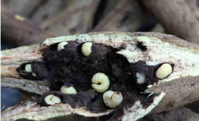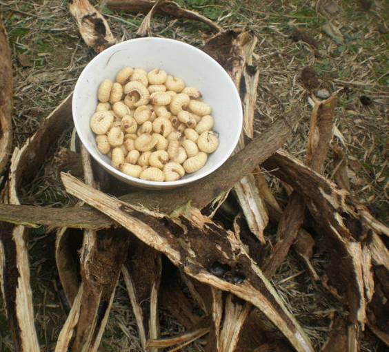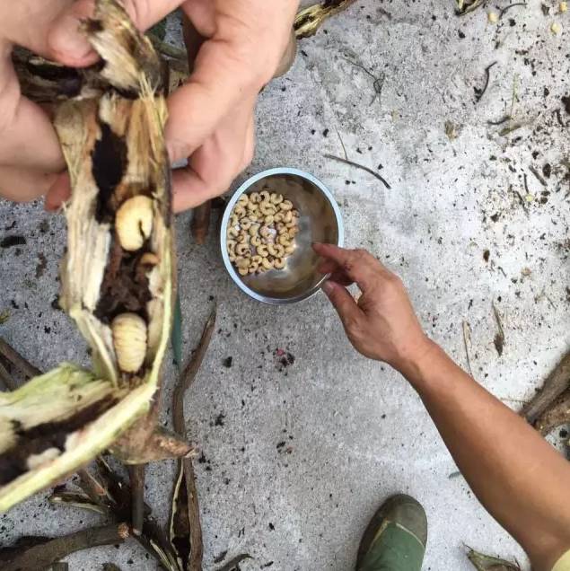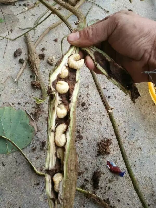 此时,你只需要拿一把锋利的刀把葛麻藤划开或直接把葛麻藤掰开,一只只白嫩的葛藤虫就暴露出来了。