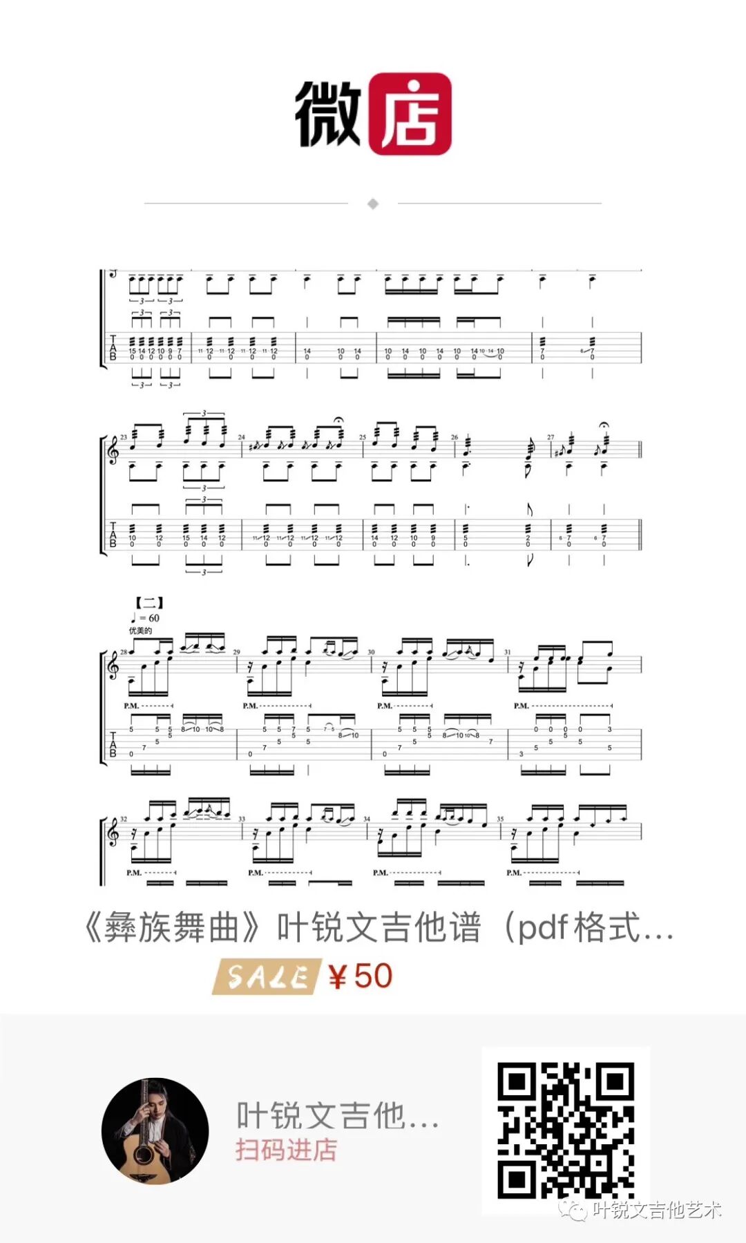 叶锐文民谣吉他版的《彝族舞曲》是在殷飚教授版的基础上加以修改而成,需要曲谱的朋友可以长按下方的二维码或阅读原文购买