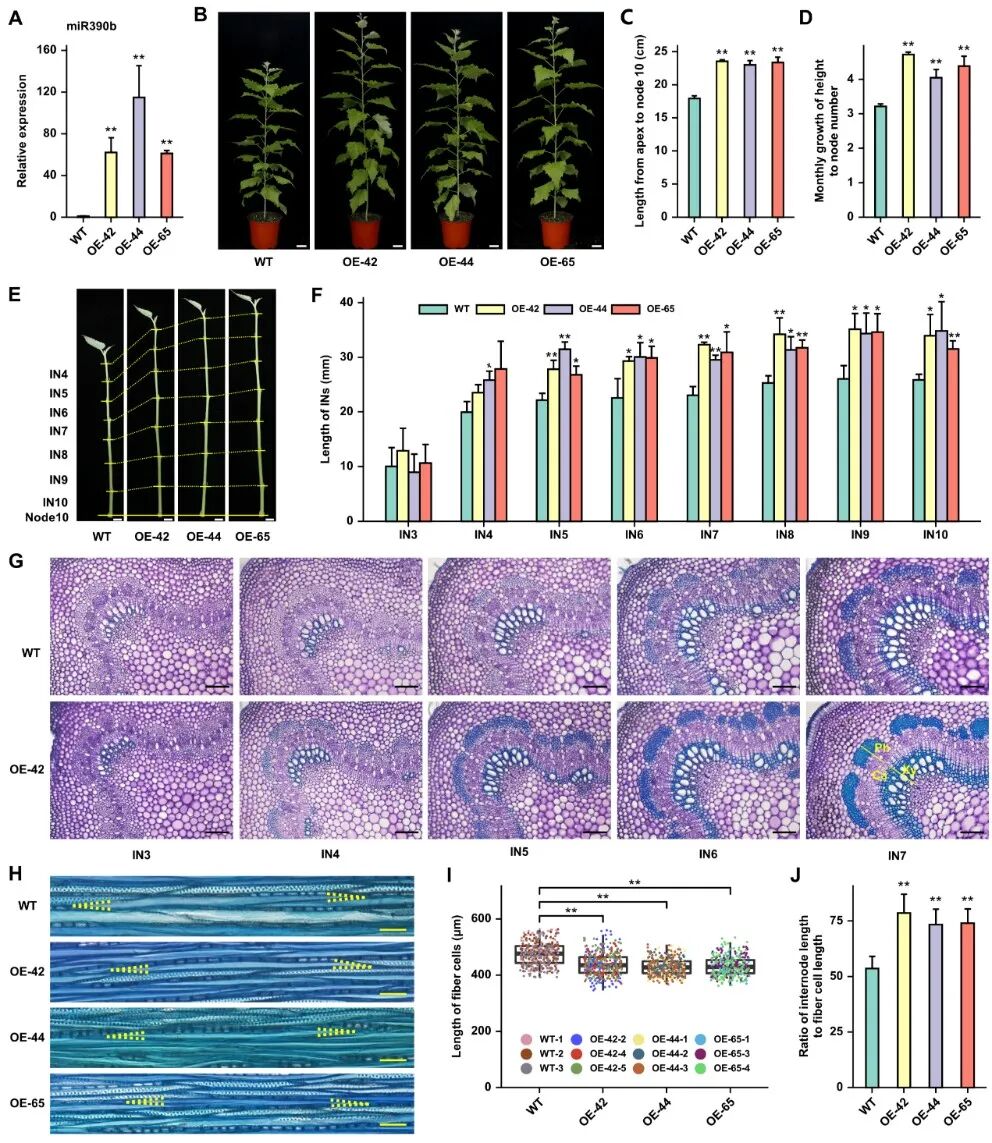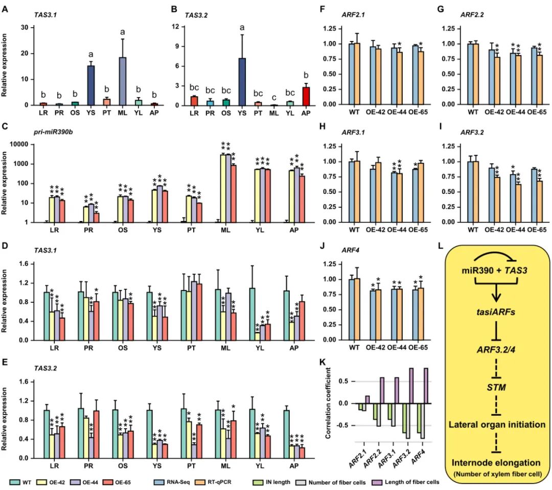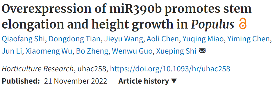 『点击免费订阅《园艺研究》电子刊』 杨树(Populus)是在世界范围内广泛种植的速生用材树种,也是城市绿化和生态建设中常见的优良树种,具有重要的经济价值和生态价值。然而,传统的杨树品种选育主要依靠杂交育种和多倍体育种,育种周期较长,严重制约了杨树新品种的创制。随着杨树遗传转化技术的不断完善以及杨属多个树种全基因组测序的完成,通过基因工程技术定向培育优质高产的杨树新品种,是加快我国林木良种化进程,解决木材需求,推动现代林业产业发展的重要手段和有效方法。 2022年11月,Horticulture Research在线发表了华中农业大学园艺林学学院植物维管生物学实验室题为 Overexpression of miR390b promotes stem elongation and height growth in Populus 杨树高的研究论文。这项工作发现miR390b可通过miR390-TAS3-ARFs模块调控杨树茎伸长和高生长,该研究为揭示树木高生长的调控机制提供了重要参考,也为树木遗传改良与丰产速生提供了理论依据。 图1 miR390b过表达促进杨树茎伸长 图2 miR390-TAS3-ARFs途径基因表达水平及ARF和生长数据相关性分析 该研究以杨树为材料,通过茎初生生长、次生生长转变和次生生长等不同发育阶段的小RNA测序分析,挖掘到多个可能参与调控杨树茎发育的microRNA候选基因,其中miR390在初生生长过程中具有较高表达。通过miR390b在杨树中的遗传转化发现,过表达miR390b使杨树茎节间长度、木质部纵向的纤维细胞数目和株高均显著增加;基因表达分析和烟草瞬时转化实验表明,TAS3.1与TAS3.2为miR390的靶基因,可被miR390直接剪切;miR390-TAS3通路下游基因ARF2.2、ARF3.2和ARF4均在miR390b过表达植株的茎尖组织中表达量下调,其中ARF3.2和ARF4表达量与过表达植株的木纤维细胞长度呈正相关,与木纤维细胞数量和节间长度呈负相关。该研究结果揭示了miR390b通过miR390-TAS3-ARFs模块调控杨树茎伸长和高生长,这在其它植物中鲜有报道。 华中农业大学园艺林学学院植物维管生物学课题组史巧芳博士为第一作者,施雪萍副教授为通讯作者。园艺植物生物学教育部重点实验室郑波教授、郭文武教授和伍小萌副教授参与了研究工作,李峰教授和杜克兵副教授分别为本研究馈赠了pMS4v2质粒和黑杨材料。本研究得到了国家自然科学基金(32171821、31770639)、神农架林区林业科学研究院科技计划项目(SAF202107)和中央高校基本科研业务费专项资金资助项目(2662022YLYJ009)的资助。