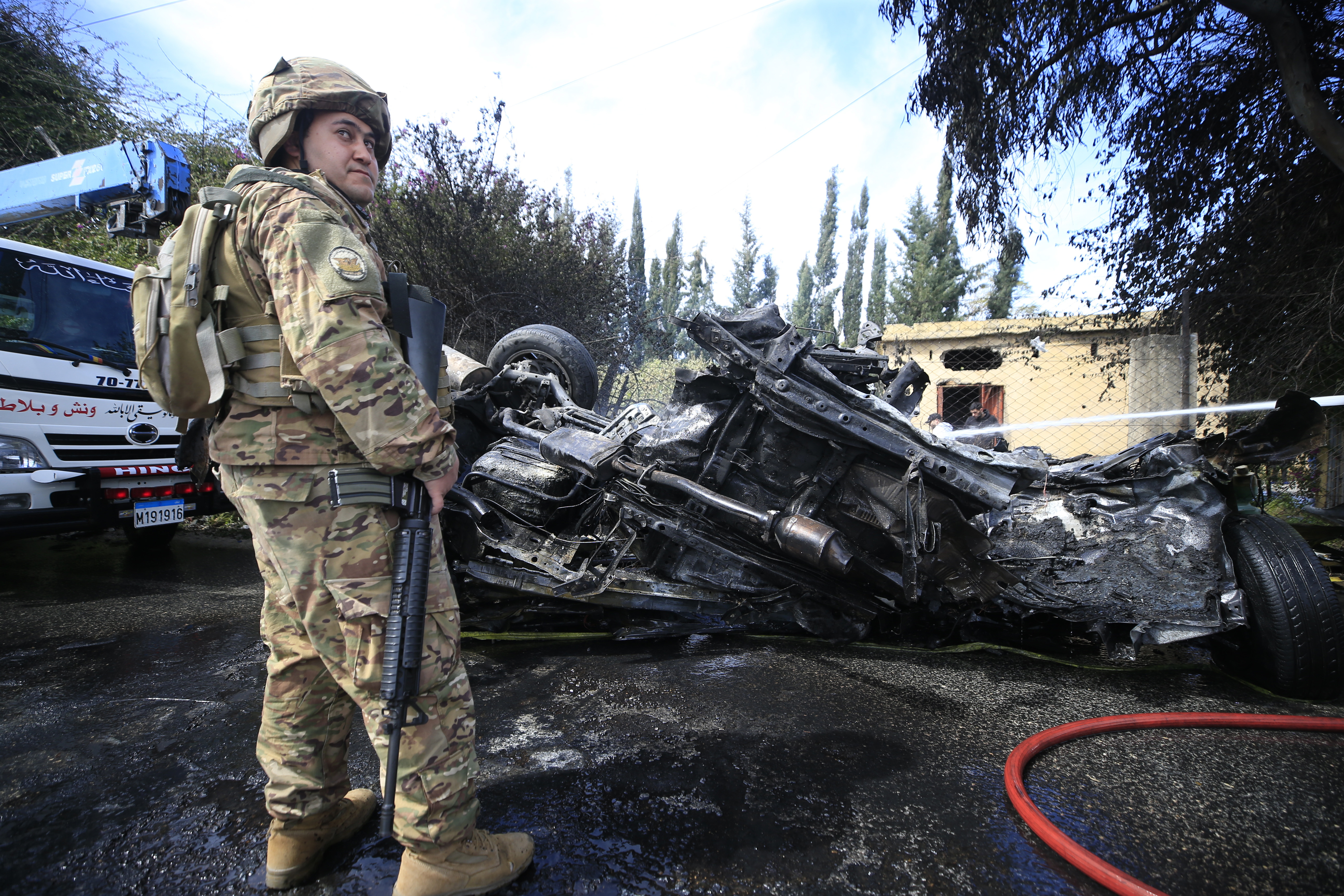 当地时间2024年3月13日,黎巴嫩南部城市提尔,以军袭击后,黎巴嫩士兵在遭袭汽车旁站岗。图/IC photo