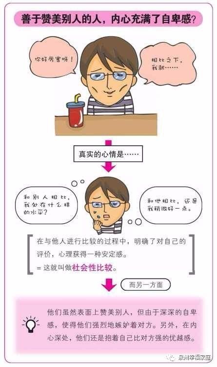 人在和他人作比较的过程中,会进行自我评价,而明确了自己的社会性评价后,人的心理就会安定下来。对比较的结果,总是对对方进行赞美的人,很可能是对自己缺乏自信、心中怀有自卑感的人。他们具有过分在意别人眼光的倾向。对比较的结果,他们自己可以说出自卑的评价,如果别人作出否定自己的评价,则会激起他们的对抗意识,而且会和对方一直比较下去。在他们心里,其实很想听到别人说“还是你更厉害”之类的赞美之词。