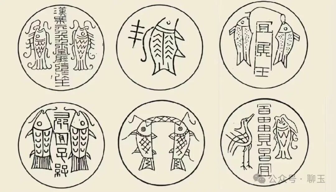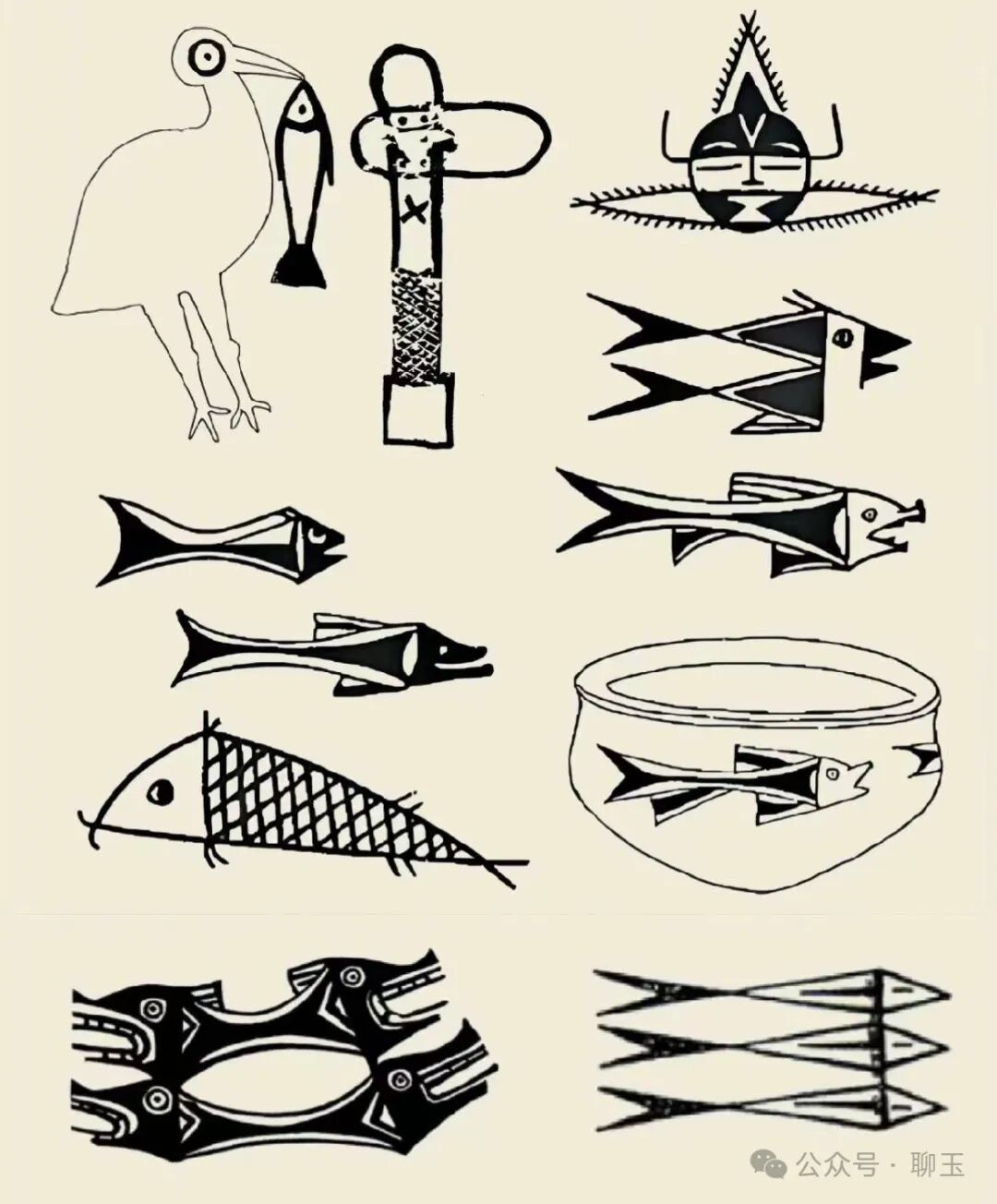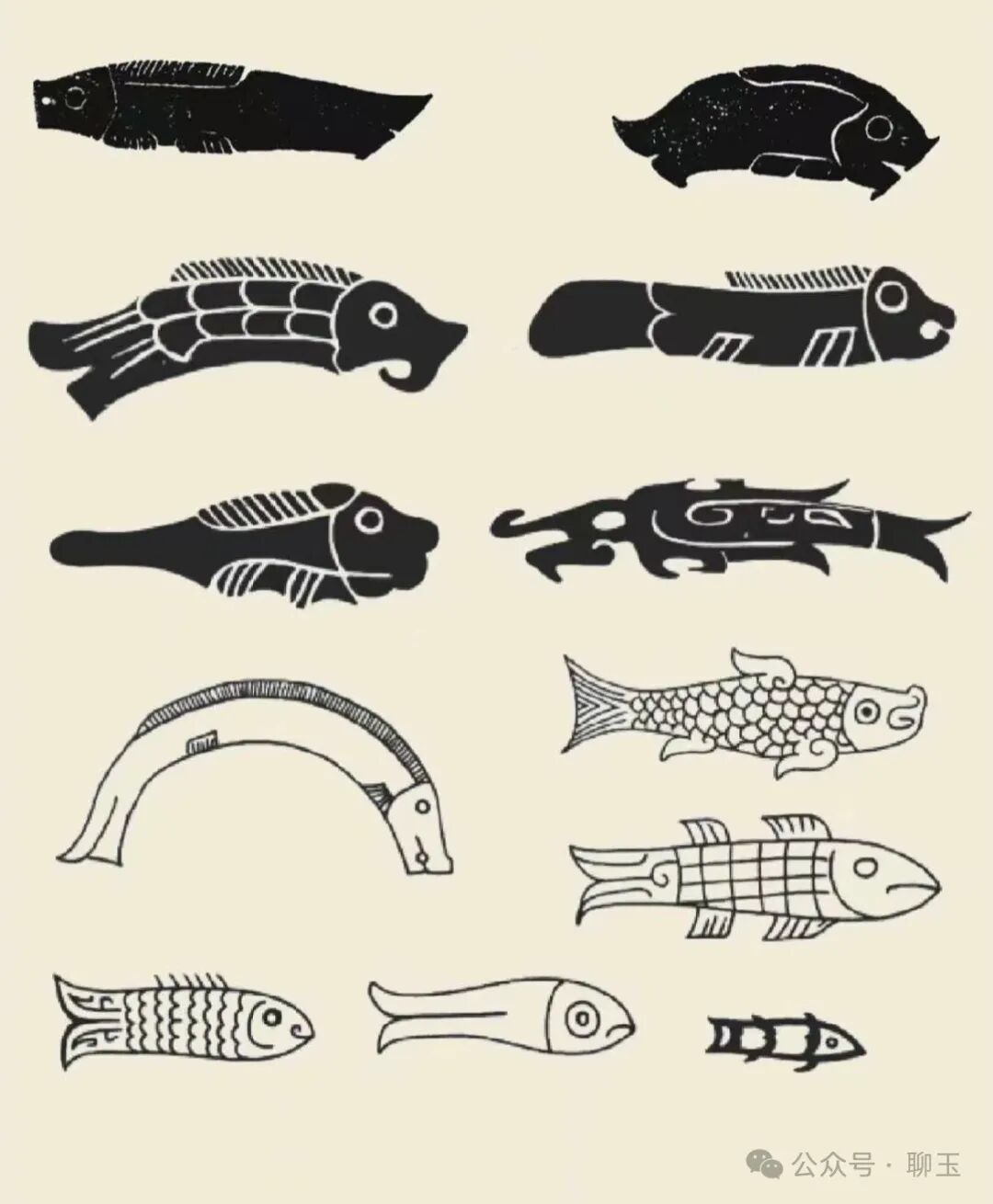 在仰韶文化遗址出土的陶器上,就有自然写实的游鱼图案,随后经过局部的变形,头部、身体、鱼鳍、鱼尾等部位开始向几何形变化,最终演变成由三角形和直线构成的几何形图案。