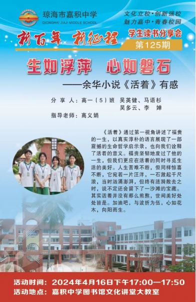 (第一百二十五期) 书籍是全世界的营养品,生活里没有书籍就好像没有阳光;智慧里没有书籍就好像鸟儿没有翅膀。 ——莎士比亚 读书,使人胸襟开阔,豁达晓畅;读书,使人目光远大,志存高远;读书,使人增长见识,谈吐不凡;读书,使人心旷神怡,如沐春风。为了让同学们体验阅读带来的快乐,我校高一(5)班全体同学在图书馆文化讲堂大教室开展《活着》读书分享会。 扫码关注我们 查看更多精彩内容![]()