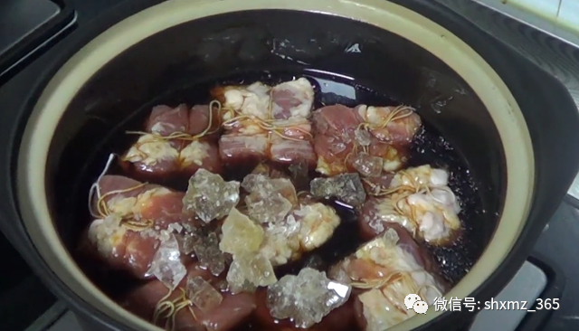 再加85克冰糖,15克生抽提鲜,10克红烧酱油,2克草菇老抽,有了这两种酱油的加入,不需要熬糖色了。