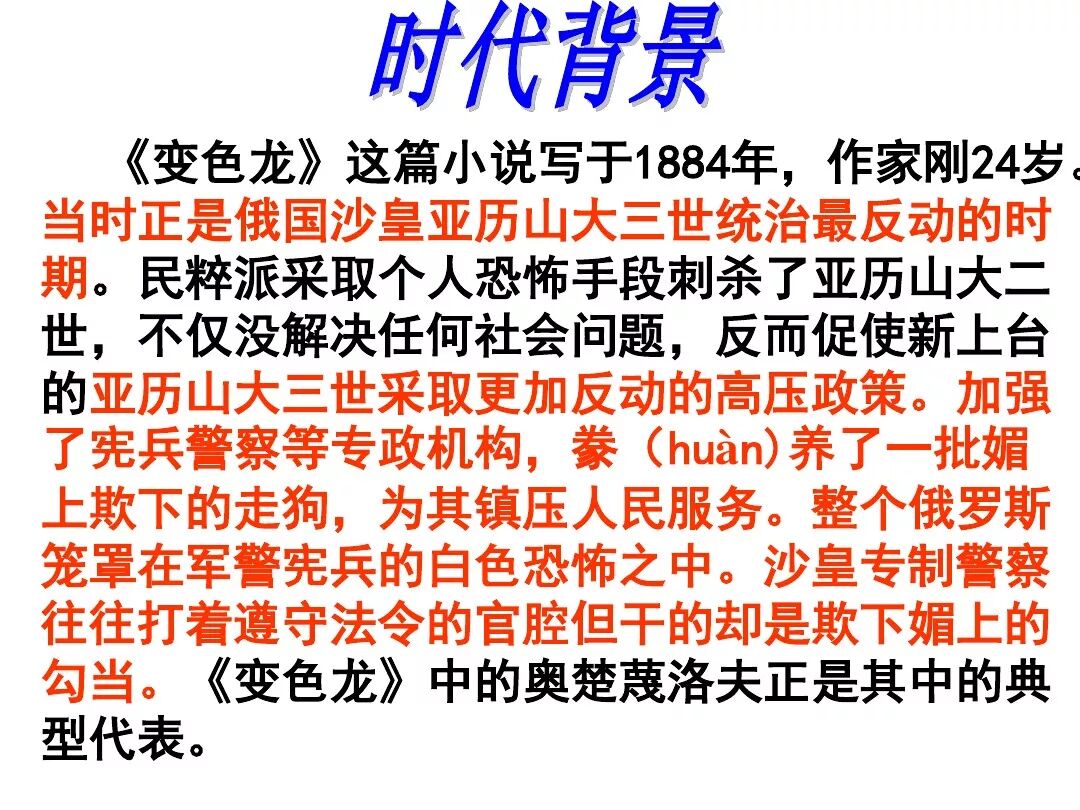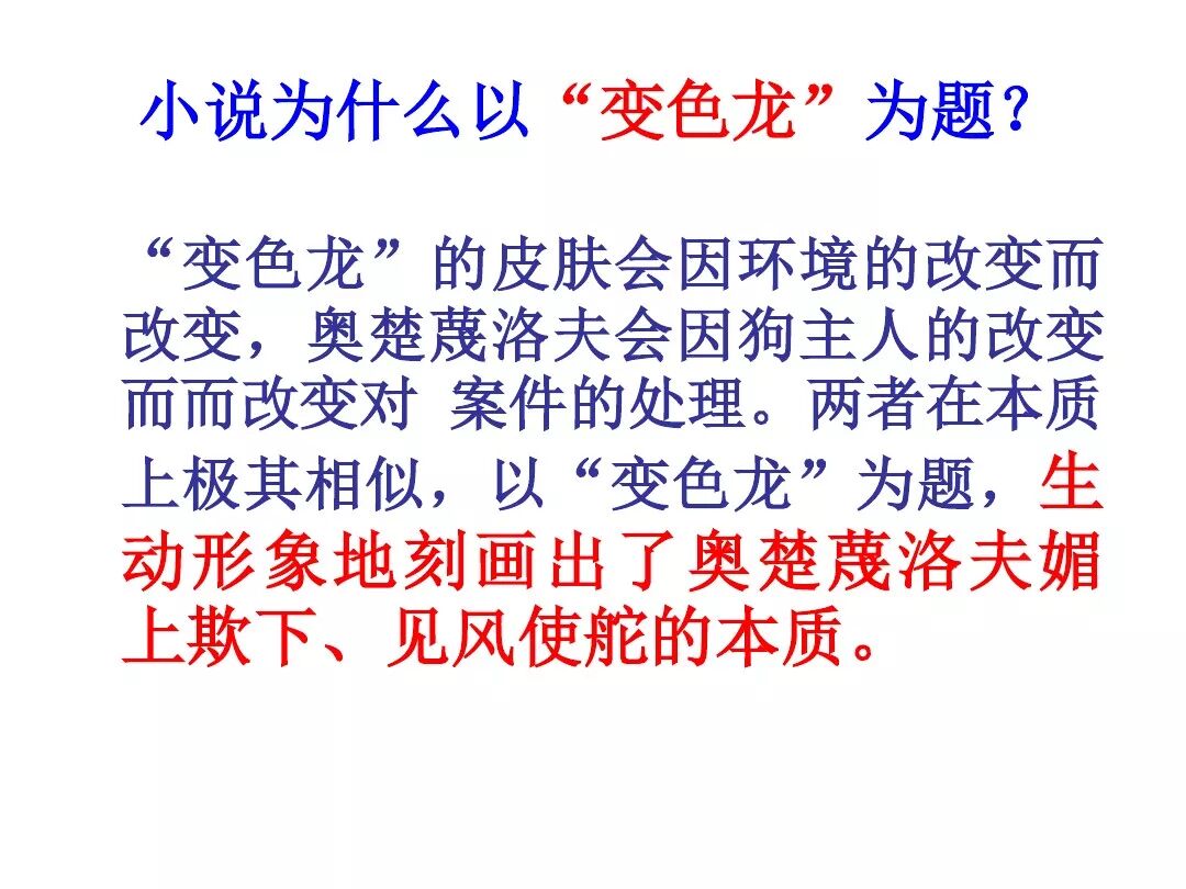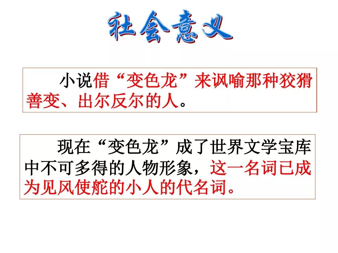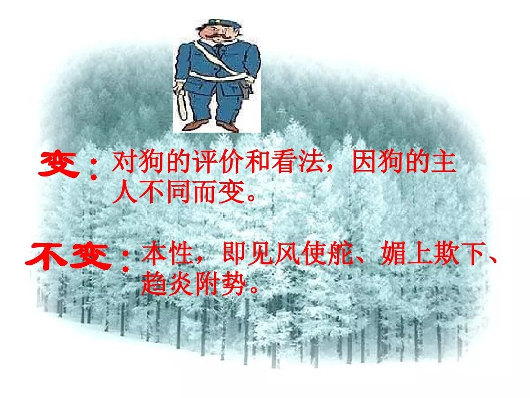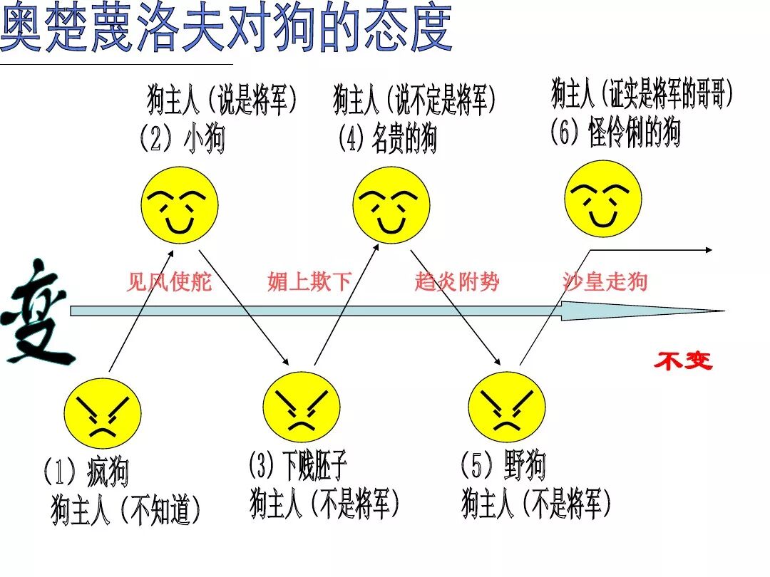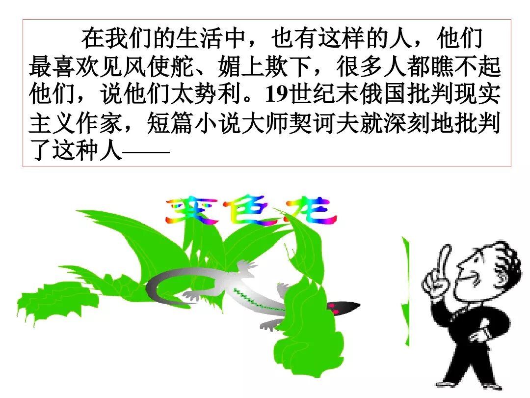 《变色龙》写于1884年,反映了19世纪80年代俄国生活中的一种应诅咒的现实。当时马克思主义与俄国工人阶级革命运动刚刚兴起,革命浪潮冲击着沙皇的专制统治。为了强化反动统治,他们豢养了一批媚上欺下看风使舵的走狗,为其镇压革命运动服务。本文中的警官奥楚蔑洛夫就是沙皇专制警察统治的化身。 在读课文的过程中应该注意几个字词: 胚子(pēi) 戳(chuō) 坎肩(kǎn) 恐吓(hè) 畜生(chù) 前腿劈开(pǐ) 一、思考以下几个问题: 1 本文写了怎样一件事?主要人物是谁? 本文描写了警官奥楚蔑洛夫处理“狗咬人指”案件的经过。主要人物是奥楚蔑洛夫。 2 文章可分几部分?那几段最能表现奥楚蔑洛夫“变色龙”的本质?根据短篇小说的情节特点,本文可分四个部分: 第一部分(1—5段)写警官奥楚蔑洛夫遇到了一场乱子——狗咬伤人这一案子的发生。(开端) 第二部分(6—27段)是全文的重要部分。作者以极其辛辣的讽刺手法对奥楚蔑洛夫处理案子时的声色变化作了鲜明的对比,揭露了他的媚上欺下,看风使舵的丑态。(发展和高潮) 第三部分(28—29段)写奥楚蔑洛夫审理案子结束,小狗被带走,赫留金受到讪笑和恐吓。(结局) 文章6—27段,最能揭示奥楚蔑洛夫“变色龙”的本质。 3 文章采用什么方法来刻画人物性格的?文章运用对话刻画奥楚蔑洛夫媚上欺下看风使舵的性格特点的。 4 试从文中找出有关细节描写的部分,理解其在作品中的作用。 文章的细节描写有警官的军大衣和赫留金的手指头。 军大衣:本文通过军大衣这一细节描写,淋漓尽致地刻画了主人公变色过程中的丑态以及卑劣的心理活动。 手指头:一开始它是赫留金用来要挟狗主人的资本,要求赔偿的本钱;但当有人说狗是将军家的时,手指头又成了冒犯名种狗的罪证。这两处的细节描写,前后形成鲜明的对比,使主人公见风使舵、媚上欺下的本性跃然纸上。 二、归纳人物对话所表现的性格特征。 1、对老百姓的话,表现了奥楚蔑洛夫大耍威风、欺下凌弱的性格特点。如: “我绝不轻易放过……” “我要好好教训他一顿” “我要拿点颜色出来” “混蛋” “猪崽子” 2、对上司说的话,表现他奴颜媚骨、趋炎附势的性格特点。如: “这是他老人家的……” “就说这狗是我找着,派人送上的” “娇贵” “伶俐” 3.综合时代背景及主人公的性格特征理解典型人物的社会意义。 像奥楚蔑洛夫这样的媚上欺下看风使舵的走狗、奴才,可以说是当时沙皇腐败统治的产物。作者以极端憎恶的感情,用尖锐辛辣的笔触揭露了这些走狗、奴才的丑态和肮脏的灵魂,用以揭示沙皇统治的腐败黑暗。这是作者塑造“变色龙”——奥楚蔑洛夫这样一个典型所具有的社会意义。 4.“军大衣”这一细节描写在作品中的作用。 “新的军大衣”是沙皇警犬的特殊标志”,也是他装腔作势、用以吓人的工具。 “脱”、“穿”军大衣的细节,既表明了奥楚蔑洛夫借此为自己的变色争取时间,进而为再次变色作准备,又揭示了他看风使舵的狡猾的内心。 三、要点分析 1、本文以"变色龙"为题,具有怎样的表达效果? "变色龙"原是一种晰蜴,它皮肤的颜色会随着四周物体颜色的变化而变化,变色为保护色。小说主人公奥楚蔑洛夫警官在处理狗咬人事件中反复无常的态度和变色龙极为相似,用"变色龙"作小说的题目,含蓄形象地揭露了这个人物见风使舵、媚上欺下、趋炎附势的丑恶面目。 2、"商店和饭馆的门无精打采地敞着,面对着上帝创造的这个世界,就跟许多饥饿的嘴巴一样;门口连一个乞丐也没有。"这句话运用了哪些修辞手法,表现了什么? 运用了拟人、比喻和双关。"无精打采",暗示市场的不景气。把商店、饭馆的门比作"饥饿的嘴巴",形象地写出了无顾客上门,门可罗雀的萧条景象。"上帝创造的这个世界"是双关语,明指人类是上帝创造的,暗含沙皇的统治,具有讽刺意味。这里运用了社会环境描写,烘托了冷清、凄凉、压抑的社会氛围,这正是军警宪兵当道的沙皇统治的真实写照。 3、本文的主人公有怎样的性格特点?刻画这个形象最突出的是什么描写,这些描写有什么作用? 本文的主人公具有见风使舵、趋炎附势、媚上欺下、狡猾善变、反复无常的性格特点。最突出的描写方法是对话描写,通过个性化的语言,鲜明地表现了人物的性格特征,具有十分强烈的讽刺效果。 4、本文的主题思想是什么? 本文通过对见风使舵、欺下媚上的警官奥楚蔑洛夫这个沙皇专制统治的忠实走狗的刻画,巧妙地揭露了俄国警察制度的反动和虚伪,批判了它反人民的实质,揭示了沙皇统治的黑暗。 5、奥楚蔑洛夫五次变化是围绕什么变的?这样多变说明了什么? 奥楚蔑洛夫的五次变化是围绕小狗的主人是谁而变化的。这样多变说明了主人公是一个善于见风使舵、媚上欺下、反复无常、趋炎附势的沙皇忠实走狗。 ![]()