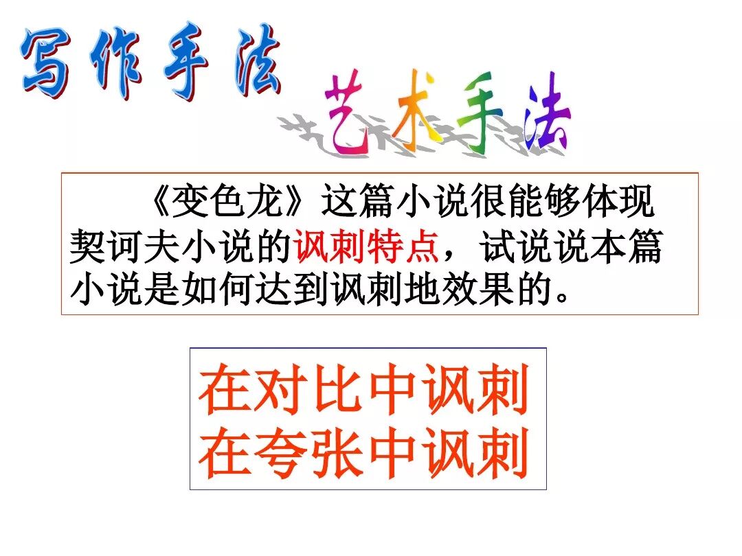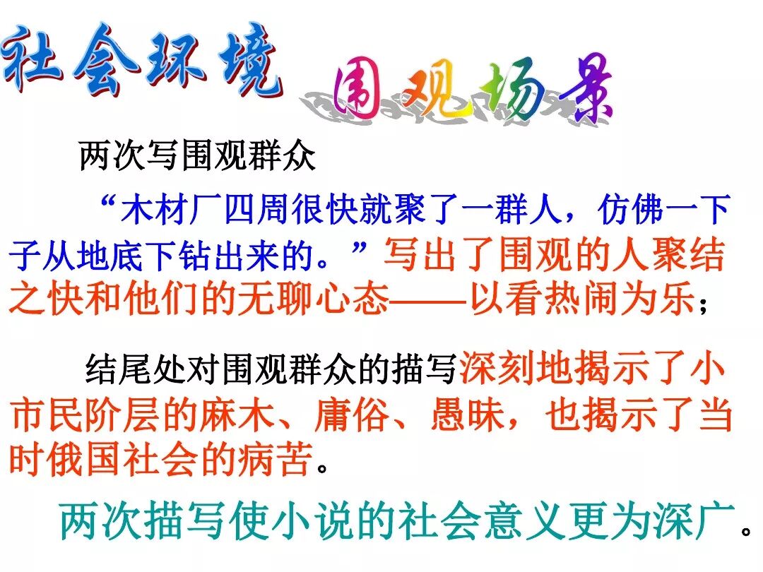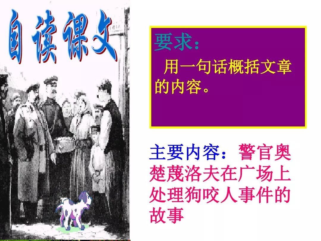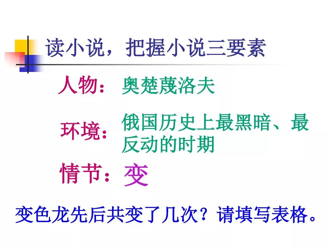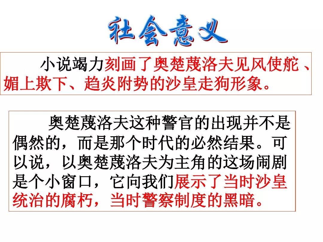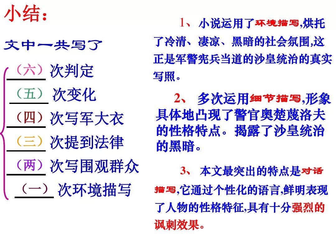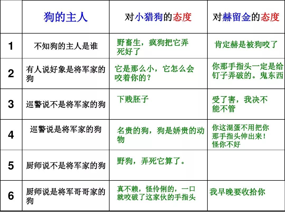 《变色龙》写于1884年,反映了19世纪80年代俄国生活中的一种应诅咒的现实。当时马克思主义与俄国工人阶级革命运动刚刚兴起,革命浪潮冲击着沙皇的专制统治。为了强化反动统治,他们豢养了一批媚上欺下看风使舵的走狗,为其镇压革命运动服务。本文中的警官奥楚蔑洛夫就是沙皇专制警察统治的化身。 在读课文的过程中应该注意几个字词: 胚子(pēi) 戳(chuō) 坎肩(kǎn) 恐吓(hè) 畜生(chù) 前腿劈开(pǐ) 一、思考以下几个问题: 1 本文写了怎样一件事?主要人物是谁? 本文描写了警官奥楚蔑洛夫处理“狗咬人指”案件的经过。主要人物是奥楚蔑洛夫。 2 文章可分几部分?那几段最能表现奥楚蔑洛夫“变色龙”的本质?根据短篇小说的情节特点,本文可分四个部分: 第一部分(1—5段)写警官奥楚蔑洛夫遇到了一场乱子——狗咬伤人这一案子的发生。(开端) 第二部分(6—27段)是全文的重要部分。作者以极其辛辣的讽刺手法对奥楚蔑洛夫处理案子时的声色变化作了鲜明的对比,揭露了他的媚上欺下,看风使舵的丑态。(发展和高潮) 第三部分(28—29段)写奥楚蔑洛夫审理案子结束,小狗被带走,赫留金受到讪笑和恐吓。(结局) 文章6—27段,最能揭示奥楚蔑洛夫“变色龙”的本质。 3 文章采用什么方法来刻画人物性格的?文章运用对话刻画奥楚蔑洛夫媚上欺下看风使舵的性格特点的。 4 试从文中找出有关细节描写的部分,理解其在作品中的作用。 文章的细节描写有警官的军大衣和赫留金的手指头。 军大衣:本文通过军大衣这一细节描写,淋漓尽致地刻画了主人公变色过程中的丑态以及卑劣的心理活动。 手指头:一开始它是赫留金用来要挟狗主人的资本,要求赔偿的本钱;但当有人说狗是将军家的时,手指头又成了冒犯名种狗的罪证。这两处的细节描写,前后形成鲜明的对比,使主人公见风使舵、媚上欺下的本性跃然纸上。 二、归纳人物对话所表现的性格特征。 1、对老百姓的话,表现了奥楚蔑洛夫大耍威风、欺下凌弱的性格特点。如: “我绝不轻易放过……” “我要好好教训他一顿” “我要拿点颜色出来” “混蛋” “猪崽子” 2、对上司说的话,表现他奴颜媚骨、趋炎附势的性格特点。如: “这是他老人家的……” “就说这狗是我找着,派人送上的” “娇贵” “伶俐” 3.综合时代背景及主人公的性格特征理解典型人物的社会意义。 像奥楚蔑洛夫这样的媚上欺下看风使舵的走狗、奴才,可以说是当时沙皇腐败统治的产物。作者以极端憎恶的感情,用尖锐辛辣的笔触揭露了这些走狗、奴才的丑态和肮脏的灵魂,用以揭示沙皇统治的腐败黑暗。这是作者塑造“变色龙”——奥楚蔑洛夫这样一个典型所具有的社会意义。 4.“军大衣”这一细节描写在作品中的作用。 “新的军大衣”是沙皇警犬的特殊标志”,也是他装腔作势、用以吓人的工具。 “脱”、“穿”军大衣的细节,既表明了奥楚蔑洛夫借此为自己的变色争取时间,进而为再次变色作准备,又揭示了他看风使舵的狡猾的内心。 三、要点分析 1、本文以"变色龙"为题,具有怎样的表达效果? "变色龙"原是一种晰蜴,它皮肤的颜色会随着四周物体颜色的变化而变化,变色为保护色。小说主人公奥楚蔑洛夫警官在处理狗咬人事件中反复无常的态度和变色龙极为相似,用"变色龙"作小说的题目,含蓄形象地揭露了这个人物见风使舵、媚上欺下、趋炎附势的丑恶面目。 2、"商店和饭馆的门无精打采地敞着,面对着上帝创造的这个世界,就跟许多饥饿的嘴巴一样;门口连一个乞丐也没有。"这句话运用了哪些修辞手法,表现了什么? 运用了拟人、比喻和双关。"无精打采",暗示市场的不景气。把商店、饭馆的门比作"饥饿的嘴巴",形象地写出了无顾客上门,门可罗雀的萧条景象。"上帝创造的这个世界"是双关语,明指人类是上帝创造的,暗含沙皇的统治,具有讽刺意味。这里运用了社会环境描写,烘托了冷清、凄凉、压抑的社会氛围,这正是军警宪兵当道的沙皇统治的真实写照。 3、本文的主人公有怎样的性格特点?刻画这个形象最突出的是什么描写,这些描写有什么作用? 本文的主人公具有见风使舵、趋炎附势、媚上欺下、狡猾善变、反复无常的性格特点。最突出的描写方法是对话描写,通过个性化的语言,鲜明地表现了人物的性格特征,具有十分强烈的讽刺效果。 4、本文的主题思想是什么? 本文通过对见风使舵、欺下媚上的警官奥楚蔑洛夫这个沙皇专制统治的忠实走狗的刻画,巧妙地揭露了俄国警察制度的反动和虚伪,批判了它反人民的实质,揭示了沙皇统治的黑暗。 5、奥楚蔑洛夫五次变化是围绕什么变的?这样多变说明了什么? 奥楚蔑洛夫的五次变化是围绕小狗的主人是谁而变化的。这样多变说明了主人公是一个善于见风使舵、媚上欺下、反复无常、趋炎附势的沙皇忠实走狗。 ![]()