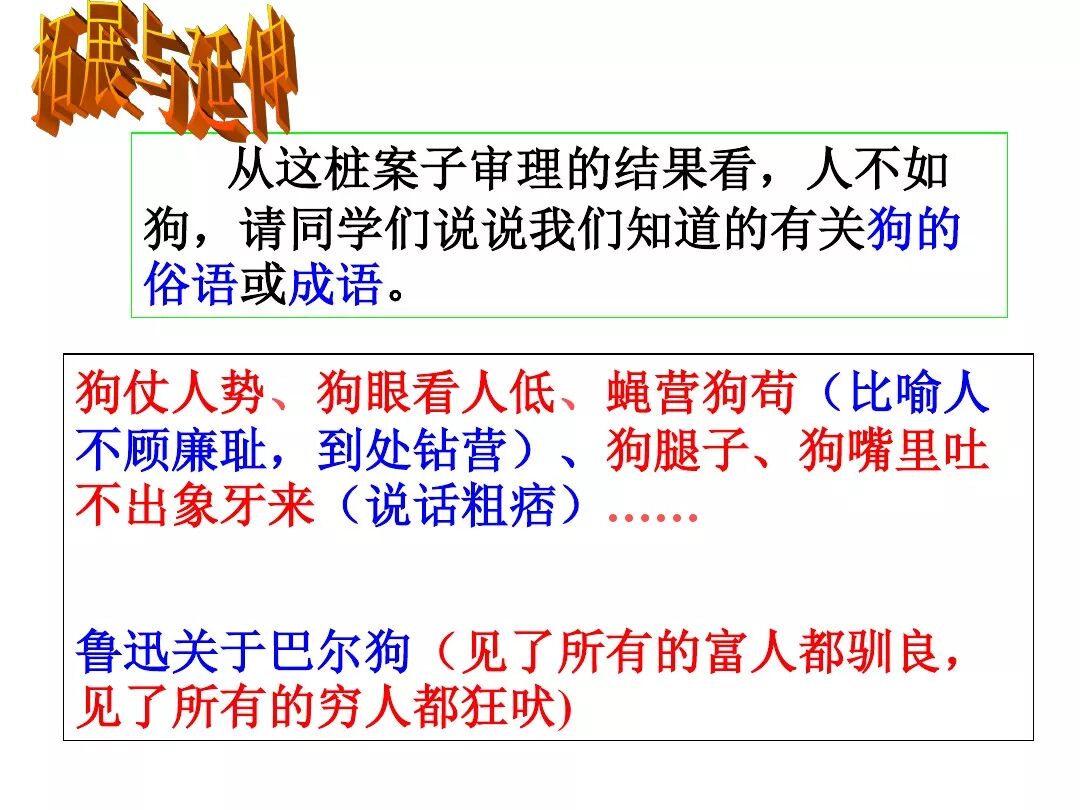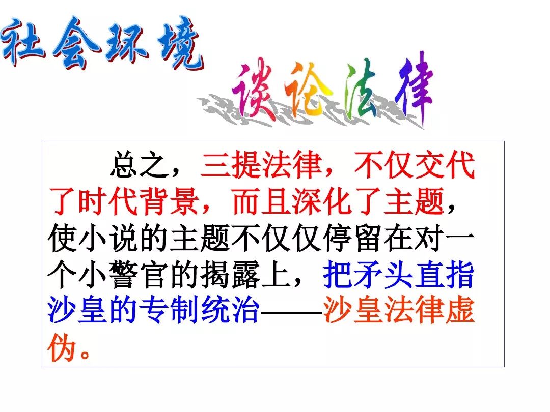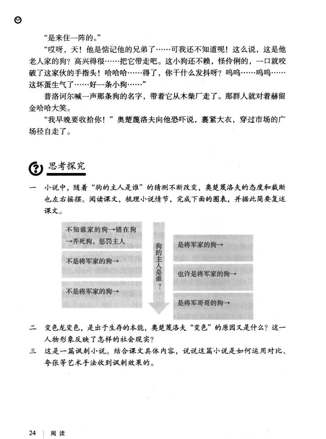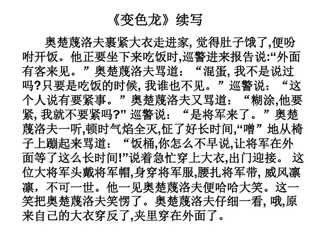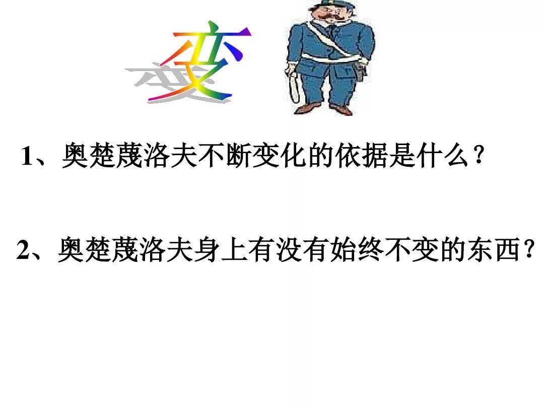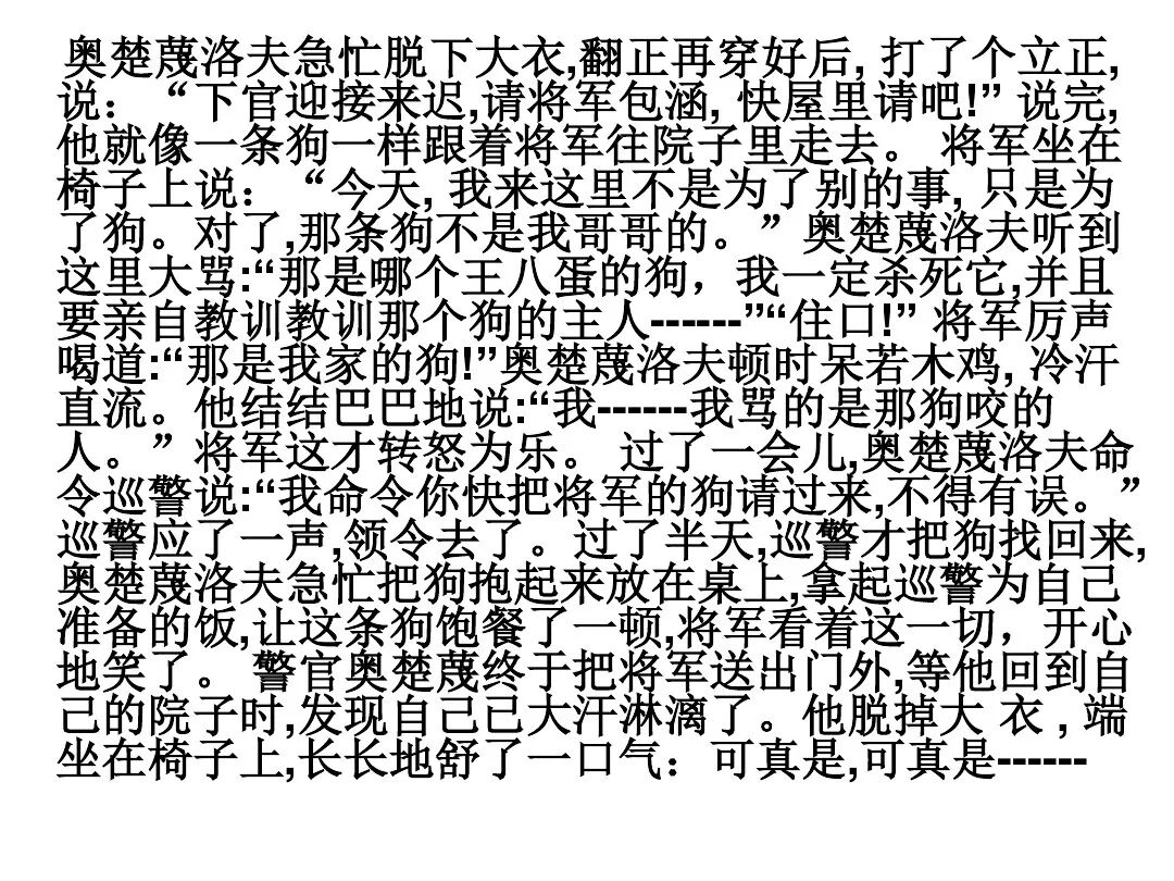 《变色龙》写于1884年,反映了19世纪80年代俄国生活中的一种应诅咒的现实。当时马克思主义与俄国工人阶级革命运动刚刚兴起,革命浪潮冲击着沙皇的专制统治。为了强化反动统治,他们豢养了一批媚上欺下看风使舵的走狗,为其镇压革命运动服务。本文中的警官奥楚蔑洛夫就是沙皇专制警察统治的化身。 在读课文的过程中应该注意几个字词: 胚子(pēi) 戳(chuō) 坎肩(kǎn) 恐吓(hè) 畜生(chù) 前腿劈开(pǐ) 一、思考以下几个问题: 1 本文写了怎样一件事?主要人物是谁? 本文描写了警官奥楚蔑洛夫处理“狗咬人指”案件的经过。主要人物是奥楚蔑洛夫。 2 文章可分几部分?那几段最能表现奥楚蔑洛夫“变色龙”的本质?根据短篇小说的情节特点,本文可分四个部分: 第一部分(1—5段)写警官奥楚蔑洛夫遇到了一场乱子——狗咬伤人这一案子的发生。(开端) 第二部分(6—27段)是全文的重要部分。作者以极其辛辣的讽刺手法对奥楚蔑洛夫处理案子时的声色变化作了鲜明的对比,揭露了他的媚上欺下,看风使舵的丑态。(发展和高潮) 第三部分(28—29段)写奥楚蔑洛夫审理案子结束,小狗被带走,赫留金受到讪笑和恐吓。(结局) 文章6—27段,最能揭示奥楚蔑洛夫“变色龙”的本质。 3 文章采用什么方法来刻画人物性格的?文章运用对话刻画奥楚蔑洛夫媚上欺下看风使舵的性格特点的。 4 试从文中找出有关细节描写的部分,理解其在作品中的作用。 文章的细节描写有警官的军大衣和赫留金的手指头。 军大衣:本文通过军大衣这一细节描写,淋漓尽致地刻画了主人公变色过程中的丑态以及卑劣的心理活动。 手指头:一开始它是赫留金用来要挟狗主人的资本,要求赔偿的本钱;但当有人说狗是将军家的时,手指头又成了冒犯名种狗的罪证。这两处的细节描写,前后形成鲜明的对比,使主人公见风使舵、媚上欺下的本性跃然纸上。 二、归纳人物对话所表现的性格特征。 1、对老百姓的话,表现了奥楚蔑洛夫大耍威风、欺下凌弱的性格特点。如: “我绝不轻易放过……” “我要好好教训他一顿” “我要拿点颜色出来” “混蛋” “猪崽子” 2、对上司说的话,表现他奴颜媚骨、趋炎附势的性格特点。如: “这是他老人家的……” “就说这狗是我找着,派人送上的” “娇贵” “伶俐” 3.综合时代背景及主人公的性格特征理解典型人物的社会意义。 像奥楚蔑洛夫这样的媚上欺下看风使舵的走狗、奴才,可以说是当时沙皇腐败统治的产物。作者以极端憎恶的感情,用尖锐辛辣的笔触揭露了这些走狗、奴才的丑态和肮脏的灵魂,用以揭示沙皇统治的腐败黑暗。这是作者塑造“变色龙”——奥楚蔑洛夫这样一个典型所具有的社会意义。 4.“军大衣”这一细节描写在作品中的作用。 “新的军大衣”是沙皇警犬的特殊标志”,也是他装腔作势、用以吓人的工具。 “脱”、“穿”军大衣的细节,既表明了奥楚蔑洛夫借此为自己的变色争取时间,进而为再次变色作准备,又揭示了他看风使舵的狡猾的内心。 三、要点分析 1、本文以"变色龙"为题,具有怎样的表达效果? "变色龙"原是一种晰蜴,它皮肤的颜色会随着四周物体颜色的变化而变化,变色为保护色。小说主人公奥楚蔑洛夫警官在处理狗咬人事件中反复无常的态度和变色龙极为相似,用"变色龙"作小说的题目,含蓄形象地揭露了这个人物见风使舵、媚上欺下、趋炎附势的丑恶面目。 2、"商店和饭馆的门无精打采地敞着,面对着上帝创造的这个世界,就跟许多饥饿的嘴巴一样;门口连一个乞丐也没有。"这句话运用了哪些修辞手法,表现了什么? 运用了拟人、比喻和双关。"无精打采",暗示市场的不景气。把商店、饭馆的门比作"饥饿的嘴巴",形象地写出了无顾客上门,门可罗雀的萧条景象。"上帝创造的这个世界"是双关语,明指人类是上帝创造的,暗含沙皇的统治,具有讽刺意味。这里运用了社会环境描写,烘托了冷清、凄凉、压抑的社会氛围,这正是军警宪兵当道的沙皇统治的真实写照。 3、本文的主人公有怎样的性格特点?刻画这个形象最突出的是什么描写,这些描写有什么作用? 本文的主人公具有见风使舵、趋炎附势、媚上欺下、狡猾善变、反复无常的性格特点。最突出的描写方法是对话描写,通过个性化的语言,鲜明地表现了人物的性格特征,具有十分强烈的讽刺效果。 4、本文的主题思想是什么? 本文通过对见风使舵、欺下媚上的警官奥楚蔑洛夫这个沙皇专制统治的忠实走狗的刻画,巧妙地揭露了俄国警察制度的反动和虚伪,批判了它反人民的实质,揭示了沙皇统治的黑暗。 5、奥楚蔑洛夫五次变化是围绕什么变的?这样多变说明了什么? 奥楚蔑洛夫的五次变化是围绕小狗的主人是谁而变化的。这样多变说明了主人公是一个善于见风使舵、媚上欺下、反复无常、趋炎附势的沙皇忠实走狗。 ![]()