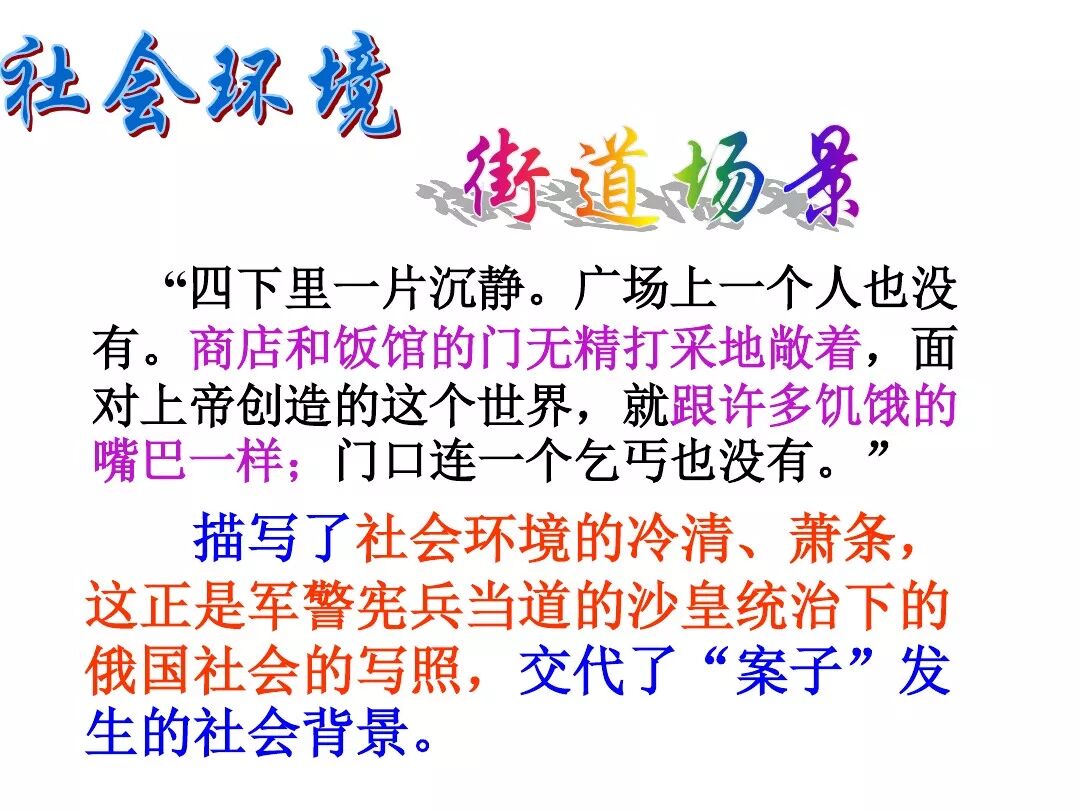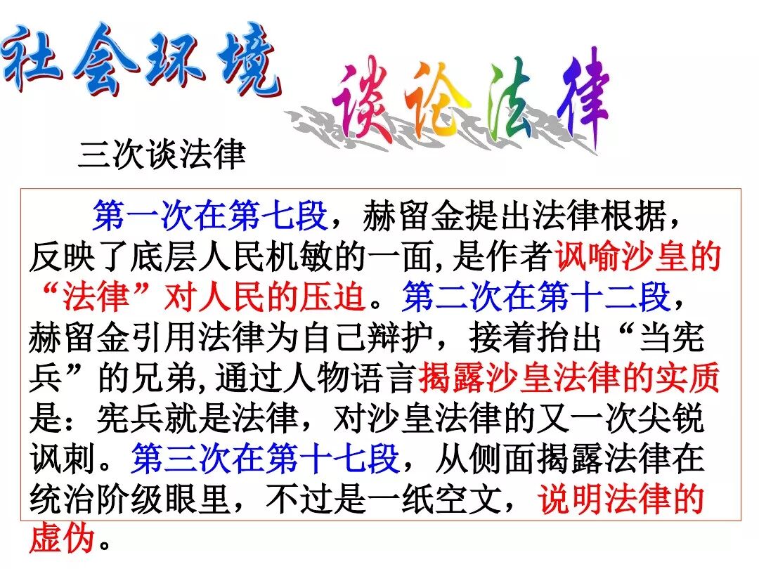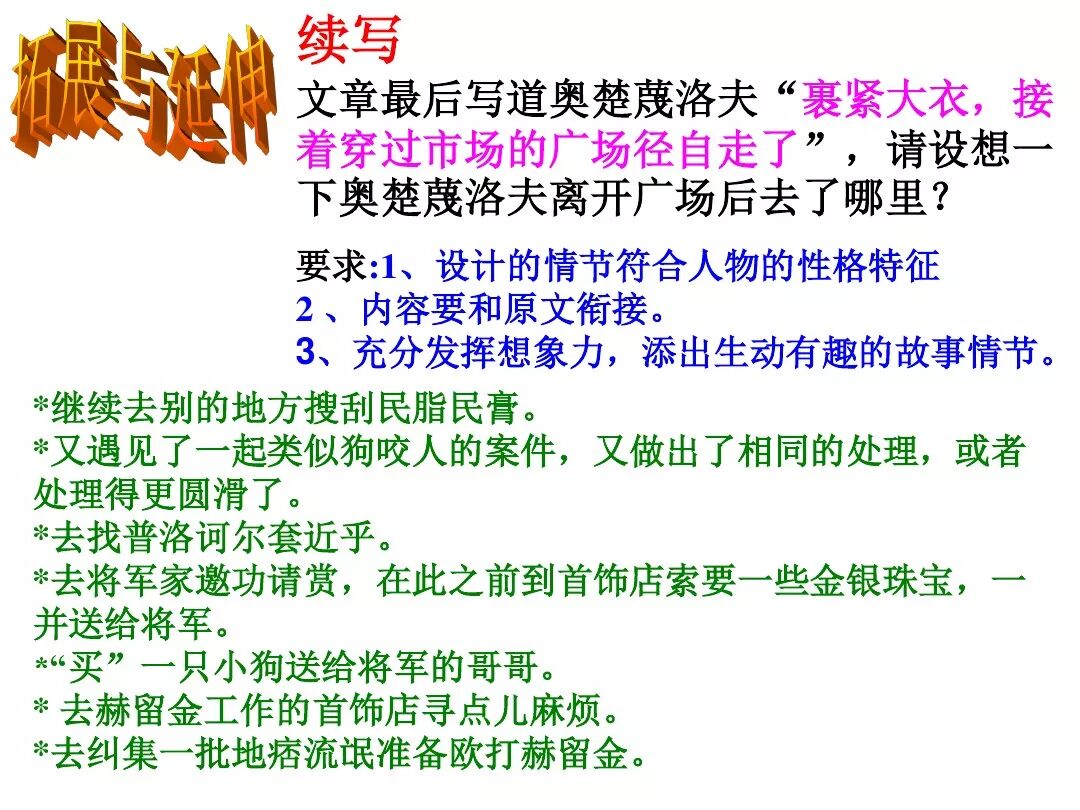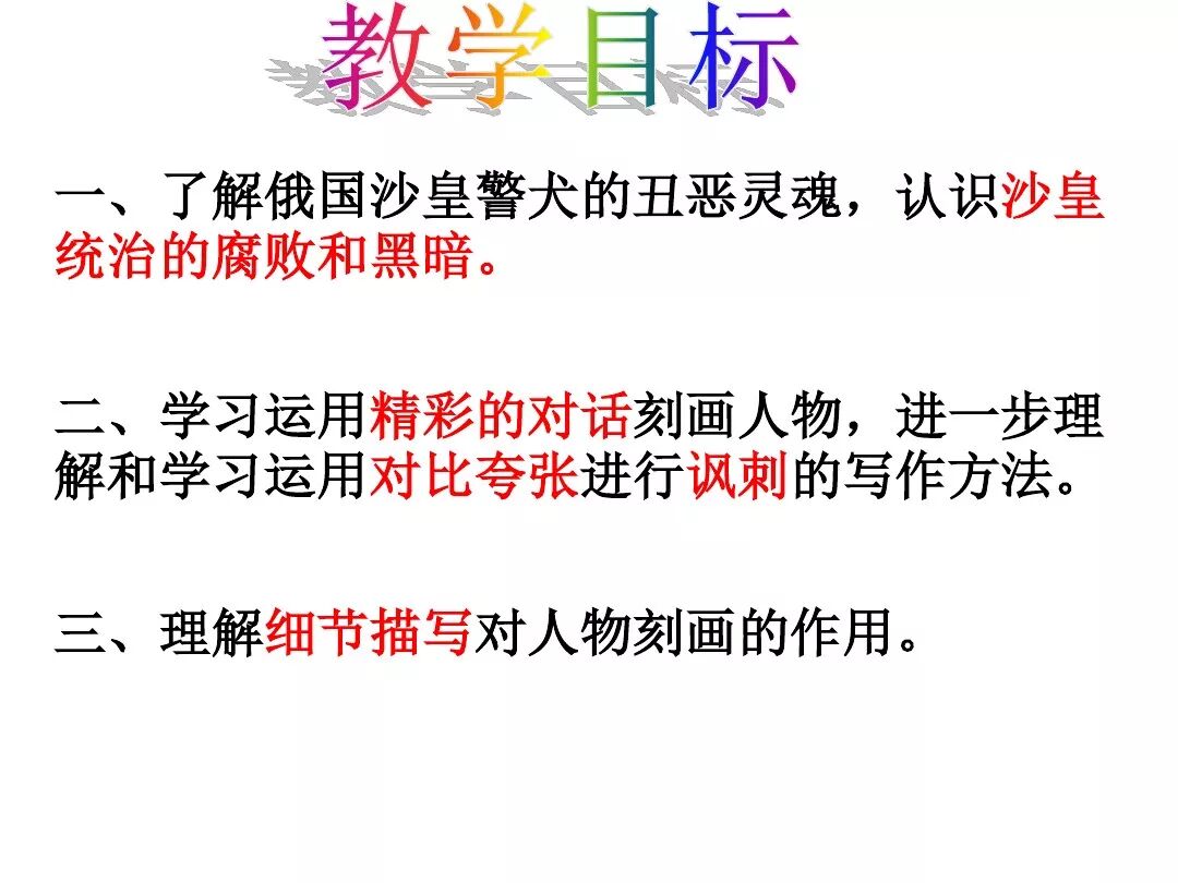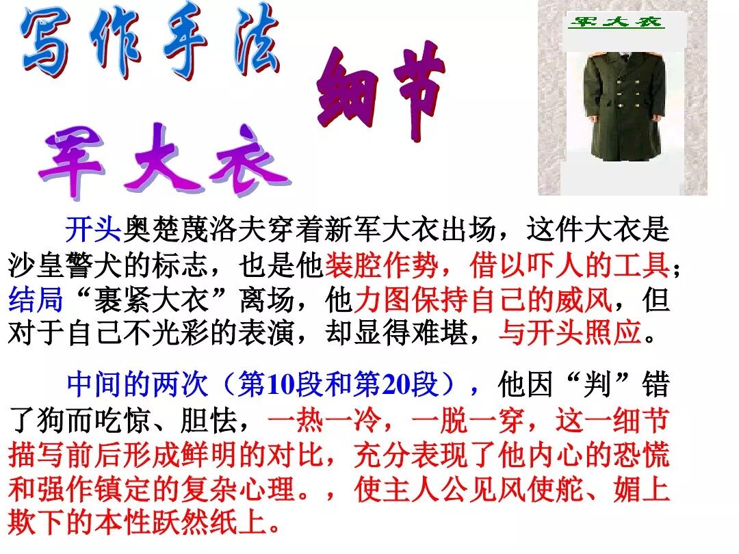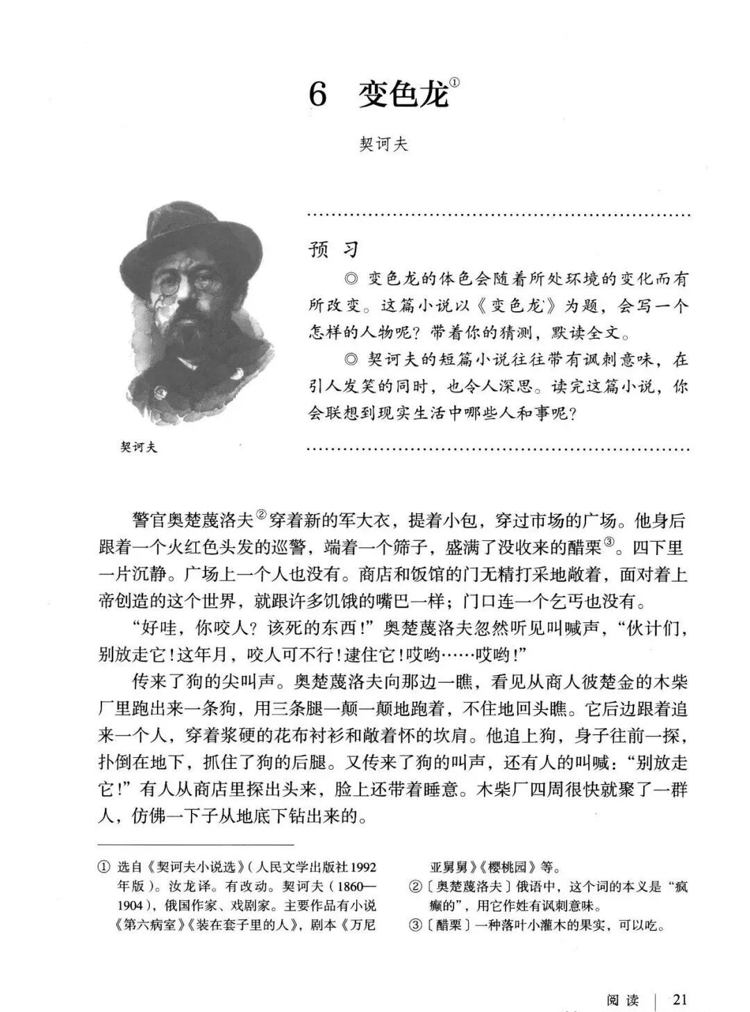 《变色龙》写于1884年,反映了19世纪80年代俄国生活中的一种应诅咒的现实。当时马克思主义与俄国工人阶级革命运动刚刚兴起,革命浪潮冲击着沙皇的专制统治。为了强化反动统治,他们豢养了一批媚上欺下看风使舵的走狗,为其镇压革命运动服务。本文中的警官奥楚蔑洛夫就是沙皇专制警察统治的化身。 在读课文的过程中应该注意几个字词: 胚子(pēi) 戳(chuō) 坎肩(kǎn) 恐吓(hè) 畜生(chù) 前腿劈开(pǐ) 一、思考以下几个问题: 1 本文写了怎样一件事?主要人物是谁? 本文描写了警官奥楚蔑洛夫处理“狗咬人指”案件的经过。主要人物是奥楚蔑洛夫。 2 文章可分几部分?那几段最能表现奥楚蔑洛夫“变色龙”的本质?根据短篇小说的情节特点,本文可分四个部分: 第一部分(1—5段)写警官奥楚蔑洛夫遇到了一场乱子——狗咬伤人这一案子的发生。(开端) 第二部分(6—27段)是全文的重要部分。作者以极其辛辣的讽刺手法对奥楚蔑洛夫处理案子时的声色变化作了鲜明的对比,揭露了他的媚上欺下,看风使舵的丑态。(发展和高潮) 第三部分(28—29段)写奥楚蔑洛夫审理案子结束,小狗被带走,赫留金受到讪笑和恐吓。(结局) 文章6—27段,最能揭示奥楚蔑洛夫“变色龙”的本质。 3 文章采用什么方法来刻画人物性格的?文章运用对话刻画奥楚蔑洛夫媚上欺下看风使舵的性格特点的。 4 试从文中找出有关细节描写的部分,理解其在作品中的作用。 文章的细节描写有警官的军大衣和赫留金的手指头。 军大衣:本文通过军大衣这一细节描写,淋漓尽致地刻画了主人公变色过程中的丑态以及卑劣的心理活动。 手指头:一开始它是赫留金用来要挟狗主人的资本,要求赔偿的本钱;但当有人说狗是将军家的时,手指头又成了冒犯名种狗的罪证。这两处的细节描写,前后形成鲜明的对比,使主人公见风使舵、媚上欺下的本性跃然纸上。 二、归纳人物对话所表现的性格特征。 1、对老百姓的话,表现了奥楚蔑洛夫大耍威风、欺下凌弱的性格特点。如: “我绝不轻易放过……” “我要好好教训他一顿” “我要拿点颜色出来” “混蛋” “猪崽子” 2、对上司说的话,表现他奴颜媚骨、趋炎附势的性格特点。如: “这是他老人家的……” “就说这狗是我找着,派人送上的” “娇贵” “伶俐” 3.综合时代背景及主人公的性格特征理解典型人物的社会意义。 像奥楚蔑洛夫这样的媚上欺下看风使舵的走狗、奴才,可以说是当时沙皇腐败统治的产物。作者以极端憎恶的感情,用尖锐辛辣的笔触揭露了这些走狗、奴才的丑态和肮脏的灵魂,用以揭示沙皇统治的腐败黑暗。这是作者塑造“变色龙”——奥楚蔑洛夫这样一个典型所具有的社会意义。 4.“军大衣”这一细节描写在作品中的作用。 “新的军大衣”是沙皇警犬的特殊标志”,也是他装腔作势、用以吓人的工具。 “脱”、“穿”军大衣的细节,既表明了奥楚蔑洛夫借此为自己的变色争取时间,进而为再次变色作准备,又揭示了他看风使舵的狡猾的内心。 三、要点分析 1、本文以"变色龙"为题,具有怎样的表达效果? "变色龙"原是一种晰蜴,它皮肤的颜色会随着四周物体颜色的变化而变化,变色为保护色。小说主人公奥楚蔑洛夫警官在处理狗咬人事件中反复无常的态度和变色龙极为相似,用"变色龙"作小说的题目,含蓄形象地揭露了这个人物见风使舵、媚上欺下、趋炎附势的丑恶面目。 2、"商店和饭馆的门无精打采地敞着,面对着上帝创造的这个世界,就跟许多饥饿的嘴巴一样;门口连一个乞丐也没有。"这句话运用了哪些修辞手法,表现了什么? 运用了拟人、比喻和双关。"无精打采",暗示市场的不景气。把商店、饭馆的门比作"饥饿的嘴巴",形象地写出了无顾客上门,门可罗雀的萧条景象。"上帝创造的这个世界"是双关语,明指人类是上帝创造的,暗含沙皇的统治,具有讽刺意味。这里运用了社会环境描写,烘托了冷清、凄凉、压抑的社会氛围,这正是军警宪兵当道的沙皇统治的真实写照。 3、本文的主人公有怎样的性格特点?刻画这个形象最突出的是什么描写,这些描写有什么作用? 本文的主人公具有见风使舵、趋炎附势、媚上欺下、狡猾善变、反复无常的性格特点。最突出的描写方法是对话描写,通过个性化的语言,鲜明地表现了人物的性格特征,具有十分强烈的讽刺效果。 4、本文的主题思想是什么? 本文通过对见风使舵、欺下媚上的警官奥楚蔑洛夫这个沙皇专制统治的忠实走狗的刻画,巧妙地揭露了俄国警察制度的反动和虚伪,批判了它反人民的实质,揭示了沙皇统治的黑暗。 5、奥楚蔑洛夫五次变化是围绕什么变的?这样多变说明了什么? 奥楚蔑洛夫的五次变化是围绕小狗的主人是谁而变化的。这样多变说明了主人公是一个善于见风使舵、媚上欺下、反复无常、趋炎附势的沙皇忠实走狗。 ![]()