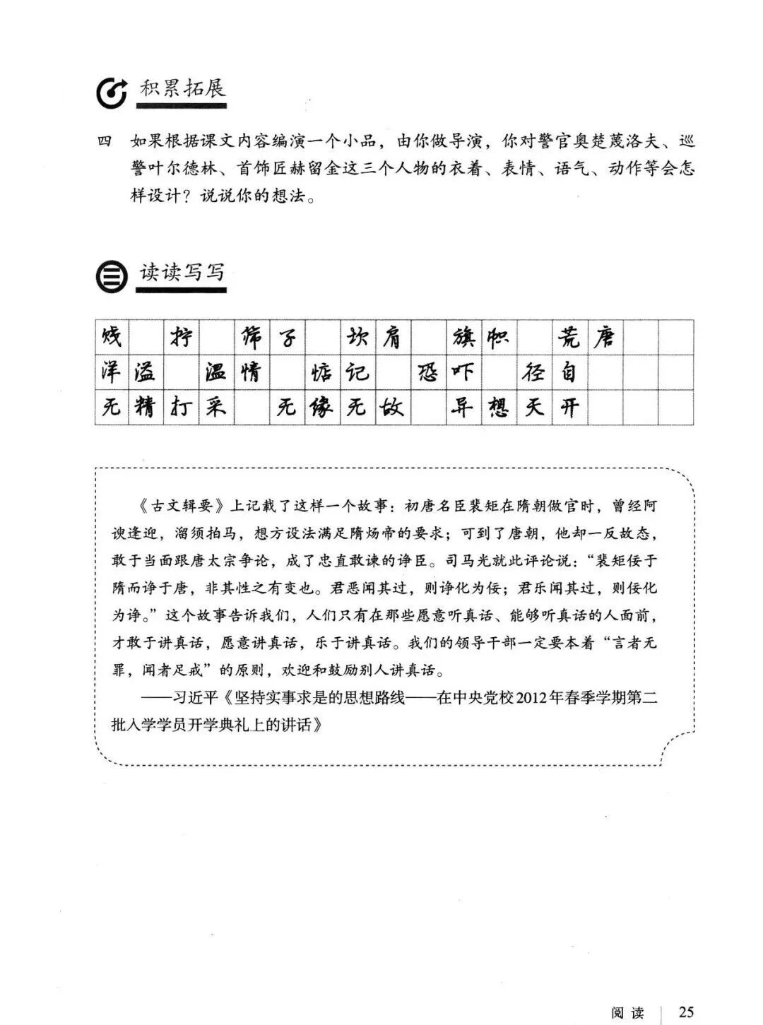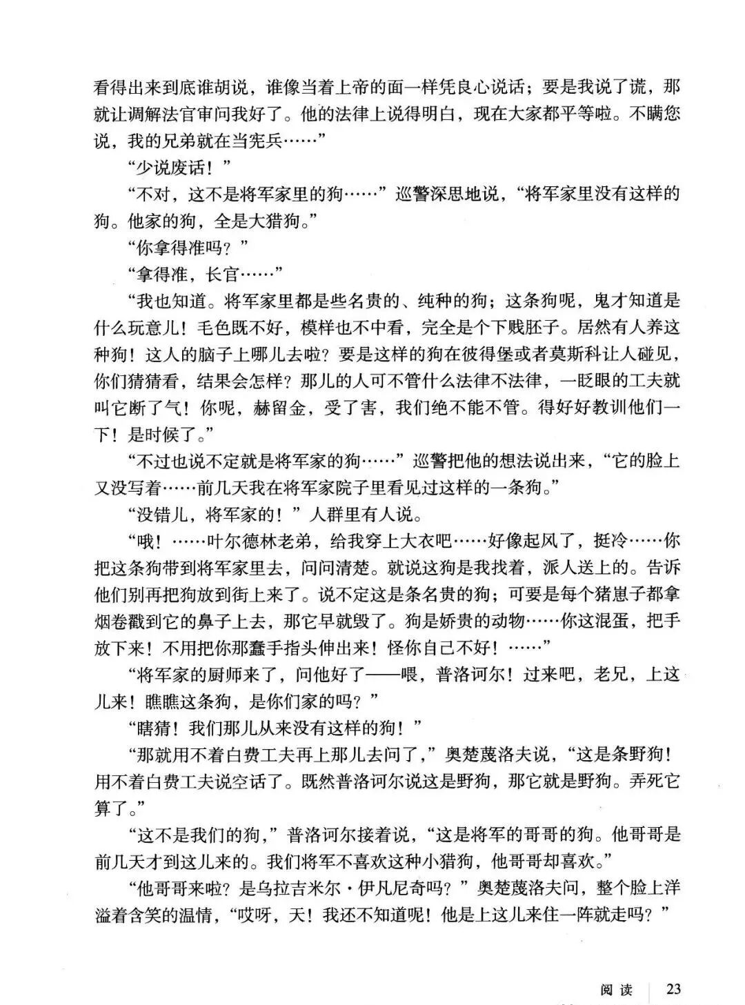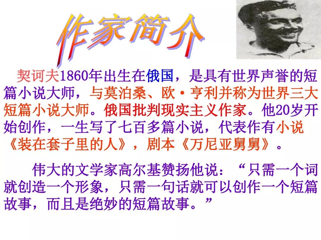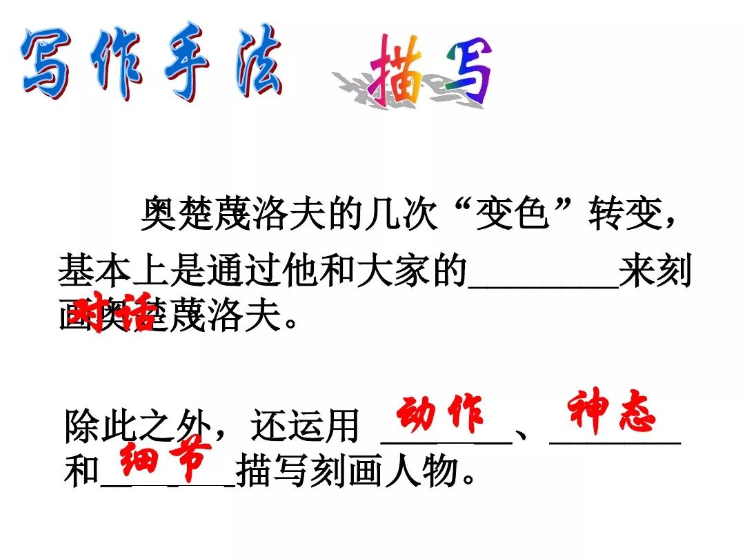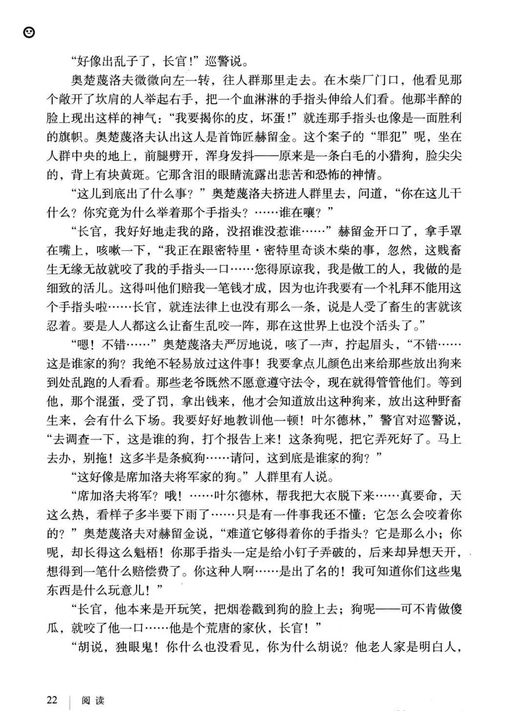 《变色龙》写于1884年,反映了19世纪80年代俄国生活中的一种应诅咒的现实。当时马克思主义与俄国工人阶级革命运动刚刚兴起,革命浪潮冲击着沙皇的专制统治。为了强化反动统治,他们豢养了一批媚上欺下看风使舵的走狗,为其镇压革命运动服务。本文中的警官奥楚蔑洛夫就是沙皇专制警察统治的化身。 在读课文的过程中应该注意几个字词: 胚子(pēi) 戳(chuō) 坎肩(kǎn) 恐吓(hè) 畜生(chù) 前腿劈开(pǐ) 一、思考以下几个问题: 1 本文写了怎样一件事?主要人物是谁? 本文描写了警官奥楚蔑洛夫处理“狗咬人指”案件的经过。主要人物是奥楚蔑洛夫。 2 文章可分几部分?那几段最能表现奥楚蔑洛夫“变色龙”的本质?根据短篇小说的情节特点,本文可分四个部分: 第一部分(1—5段)写警官奥楚蔑洛夫遇到了一场乱子——狗咬伤人这一案子的发生。(开端) 第二部分(6—27段)是全文的重要部分。作者以极其辛辣的讽刺手法对奥楚蔑洛夫处理案子时的声色变化作了鲜明的对比,揭露了他的媚上欺下,看风使舵的丑态。(发展和高潮) 第三部分(28—29段)写奥楚蔑洛夫审理案子结束,小狗被带走,赫留金受到讪笑和恐吓。(结局) 文章6—27段,最能揭示奥楚蔑洛夫“变色龙”的本质。 3 文章采用什么方法来刻画人物性格的?文章运用对话刻画奥楚蔑洛夫媚上欺下看风使舵的性格特点的。 4 试从文中找出有关细节描写的部分,理解其在作品中的作用。 文章的细节描写有警官的军大衣和赫留金的手指头。 军大衣:本文通过军大衣这一细节描写,淋漓尽致地刻画了主人公变色过程中的丑态以及卑劣的心理活动。 手指头:一开始它是赫留金用来要挟狗主人的资本,要求赔偿的本钱;但当有人说狗是将军家的时,手指头又成了冒犯名种狗的罪证。这两处的细节描写,前后形成鲜明的对比,使主人公见风使舵、媚上欺下的本性跃然纸上。 二、归纳人物对话所表现的性格特征。 1、对老百姓的话,表现了奥楚蔑洛夫大耍威风、欺下凌弱的性格特点。如: “我绝不轻易放过……” “我要好好教训他一顿” “我要拿点颜色出来” “混蛋” “猪崽子” 2、对上司说的话,表现他奴颜媚骨、趋炎附势的性格特点。如: “这是他老人家的……” “就说这狗是我找着,派人送上的” “娇贵” “伶俐” 3.综合时代背景及主人公的性格特征理解典型人物的社会意义。 像奥楚蔑洛夫这样的媚上欺下看风使舵的走狗、奴才,可以说是当时沙皇腐败统治的产物。作者以极端憎恶的感情,用尖锐辛辣的笔触揭露了这些走狗、奴才的丑态和肮脏的灵魂,用以揭示沙皇统治的腐败黑暗。这是作者塑造“变色龙”——奥楚蔑洛夫这样一个典型所具有的社会意义。 4.“军大衣”这一细节描写在作品中的作用。 “新的军大衣”是沙皇警犬的特殊标志”,也是他装腔作势、用以吓人的工具。 “脱”、“穿”军大衣的细节,既表明了奥楚蔑洛夫借此为自己的变色争取时间,进而为再次变色作准备,又揭示了他看风使舵的狡猾的内心。 三、要点分析 1、本文以"变色龙"为题,具有怎样的表达效果? "变色龙"原是一种晰蜴,它皮肤的颜色会随着四周物体颜色的变化而变化,变色为保护色。小说主人公奥楚蔑洛夫警官在处理狗咬人事件中反复无常的态度和变色龙极为相似,用"变色龙"作小说的题目,含蓄形象地揭露了这个人物见风使舵、媚上欺下、趋炎附势的丑恶面目。 2、"商店和饭馆的门无精打采地敞着,面对着上帝创造的这个世界,就跟许多饥饿的嘴巴一样;门口连一个乞丐也没有。"这句话运用了哪些修辞手法,表现了什么? 运用了拟人、比喻和双关。"无精打采",暗示市场的不景气。把商店、饭馆的门比作"饥饿的嘴巴",形象地写出了无顾客上门,门可罗雀的萧条景象。"上帝创造的这个世界"是双关语,明指人类是上帝创造的,暗含沙皇的统治,具有讽刺意味。这里运用了社会环境描写,烘托了冷清、凄凉、压抑的社会氛围,这正是军警宪兵当道的沙皇统治的真实写照。 3、本文的主人公有怎样的性格特点?刻画这个形象最突出的是什么描写,这些描写有什么作用? 本文的主人公具有见风使舵、趋炎附势、媚上欺下、狡猾善变、反复无常的性格特点。最突出的描写方法是对话描写,通过个性化的语言,鲜明地表现了人物的性格特征,具有十分强烈的讽刺效果。 4、本文的主题思想是什么? 本文通过对见风使舵、欺下媚上的警官奥楚蔑洛夫这个沙皇专制统治的忠实走狗的刻画,巧妙地揭露了俄国警察制度的反动和虚伪,批判了它反人民的实质,揭示了沙皇统治的黑暗。 5、奥楚蔑洛夫五次变化是围绕什么变的?这样多变说明了什么? 奥楚蔑洛夫的五次变化是围绕小狗的主人是谁而变化的。这样多变说明了主人公是一个善于见风使舵、媚上欺下、反复无常、趋炎附势的沙皇忠实走狗。 ![]()
