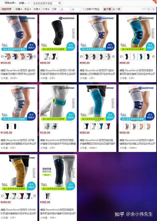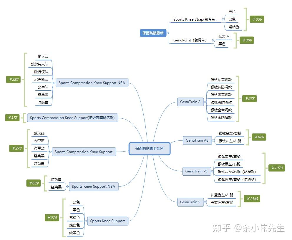 自从写了,有很多朋友私信我想让我详细介绍一下护膝界的保时捷--保而防护膝,为什么球场上越来越多人穿戴它,它那么贵到底好在哪? 于是乎,收集资料,整理资料,一气呵成,一个星期搞定。 全文5千字,有点长,但对保而防护膝全系列做了非常详细的整理,并给出恰当的选购建议(已求证保而防专业在线客服)。 文章内容不定期持续更新,点赞+收藏,防止失联,如果觉得内容有用,可以关注我。 Bauerfeind于 1929 年在措伊伦罗达(德国图林根州)建立。拥有自己的医疗科研中心,与全球最顶尖的运动损伤医疗科研人员一起合作,研究如何为顶级运动员提供最佳防护设备。 Bauerfeind 在该领域内堪称领头羊,于2007年获欧洲产品设计大奖及欧洲材料大奖。Bauerfeind 在世界各地员工总数达 2,000 人,在超过 20 个国家设立有子公司。 所有产品均为“德国制造”,部分部件为手工制作,之后发往全世界各地。让患者享受最好的质量、最高的疗效、最舒适的穿戴体验!对生产采取定期质检确保质量可靠,所有产品仅在通过检测后才会盖上质检印戳并加贴标签。 Bauerfeind 聘请NBA巨星诺维茨基为品牌大使,在欧洲为顶级运动员及团体提供运动防护装备,包括德国国家男子排球队,德国国家女子排球队,德国国家举重队,德国国家男女手球队,德国国家女子曲棍球队,德国国家男子足球队等。 自2003年开始为NBA巨星们及职业篮球队提供高品质的专业服务,如科比,姚明,麦迪,杰森基德,蒙塔埃利斯,杰里斯塔克豪斯,巴特勒,弗朗西斯,罗伯特霍里等,并同时与休斯敦火箭队,密尔沃基雄鹿队,金州勇士队,达拉斯小牛队,西雅图超音速队,多伦多猛龙队,圣安东尼奥马刺队,新泽西网队,华盛顿奇才队等保持着紧密的合作。 进入保而防中国官网(),国内网络上销售渠道只有两个,一个天猫官方旗舰店,一个京东旗舰店。 天猫官方旗舰店在售护膝产品10个: 京东旗舰店在售护膝产品11个: 经过仔细的比对,发现京东店要比天猫店多一款GenuPoint(髌骨带),其余的都是一样的。 下面我们就来详细解析一下这11款护膝。 我整理了一张思维导图,更容易帮你们理清脉络。 根据上图我们可以很清楚的了解到保而防中国在售全系列共有4个大系列:Sports Compression Knee Support系列、Sports Knee Support系列、GenuTrain系列、髌骨带。 下面我就来详细讲解一下这4个大系列 “Sports Compression Knee Support” ,共有三款:普通款(5色可选)、NBA联名款(5个NBA球队款+经典黑白两色,护膝上有明显的NBA标志)、诺维茨基联名款。 价格通常在278~378之间(有时候做活动价格会更低一些),NBA球队款比普通款贵个十来块钱,诺天王联名款比普通款贵个100块钱。溢价主要是多一个NBA的Logo和诺维茨基的Logo,关于值不值,这个就是仁者见仁智者见智了。 运动型压缩护膝使用了3C透气针织、腘窝透气、无缝压缩技术、抓握技术等保而防黑科技。 此款护膝属于保而防护膝里面的丐版,主要用于没有受过伤,预防运动中膝盖的受伤,说明书中写到:“适用于中度的关节支撑”。 选购建议: 如果你经常运动,没有受伤,但是又有些害怕膝盖会受伤,或者用于平时运动膝盖的保暖,你都只需要选择这款“丐版”的保而防护膝就够了,200多的价格还是可以接受的,毕竟保而防的做功以及舒适性是其它小品牌永远无法做到的。 普通款京东旗舰店购买链接: NBA款京东旗舰店购买链接: 诺维茨基联名款京东旗舰店购买链接: “Sports Knee Support”,一共有两款:普通款(5色可选)、NBA联名款(经典黑白两色,护膝上有明显的NBA标志)。 价格通常在578~639之间,NBA联名款要贵个60块钱。东西都是一样,多了一个NBA的Logo标志。 户外运动护膝采用3D透气针织技术,使其充分贴合人体,发挥效果激活身体潜能提供理想支撑。护具拥有大网眼轻量化通风区,在身体负荷回复时,护具覆盖的身体部位更易冷却,避免汗液润湿。护具的针织区域打造出创新型的功能区,集良好的稳固性和稳定活动自由度为一体,让您实现优秀身体表现,同时防止负荷过大。 螺旋补助支架位于膝盖侧面,确保护膝舒适服帖地贴合膝盖从而提供很好的支撑和稳定性,同时能够维护身体状态并有助于使用后上下滑动。 创新硅胶衬垫可对压力值起缓冲作用,侧翼和压力点带来积极的感觉和运动机能反馈。 用于缠绕关节的护膝,采用3D高弹性面料,可产生精准压力。 选购建议: 这款户外运动护膝是上面那款200多的运动型压缩护膝的升级版,侧面多了一个螺旋支架用于支撑,支撑性大大增强。膝盖正前方多了一个创新硅胶衬垫,防护性得到提升,衬垫给予的按摩能充分放松膝盖的肌肉和肌腱。 经常性打篮球踢足球打羽毛球等激烈运动和长跑的朋友可以重点考虑这款户外运动护膝。 普通款京东旗舰店购买链接: NBA款京东旗舰店购买链接: GenuTrain系列防护等级从低到高分别是:GenuTrain 8<GenuTrain A3<GenuTrain P3<GenuTrain S (1)GenuTrain 8介绍 GenuTrain 8价格在678元左右,属于GenuTrain系列的基础款,主要用于康复和防护,官司方定义为“放松稳定激活关节”。 它的学名叫 「第八代“盖如顺”」。 为何叫“盖如顺”?它有啥特点? 产品的设计,无时无刻不在告诉你它的“顺”。 毫不夸张的说,这款护膝穿戴后的“裸感”是最好的。 选购建议: 第八代“盖如顺”多用于预防运动损伤、经常运动又追求高质量的轻量化舒适运动的人群、膝盖轻微肿账酸痛、膝关节少量积液、韧带松