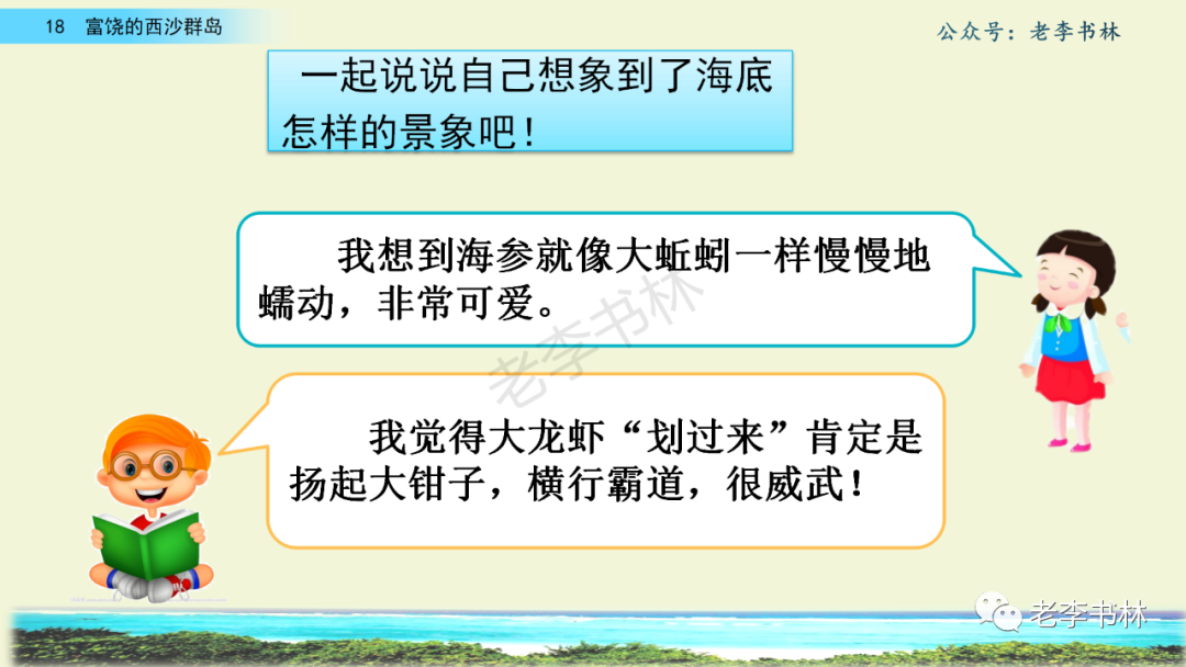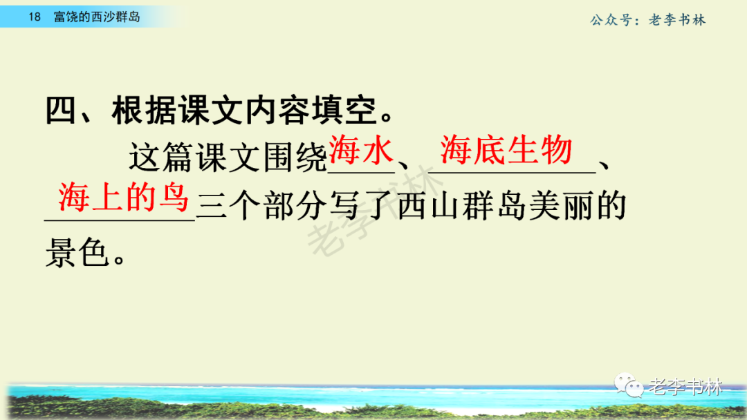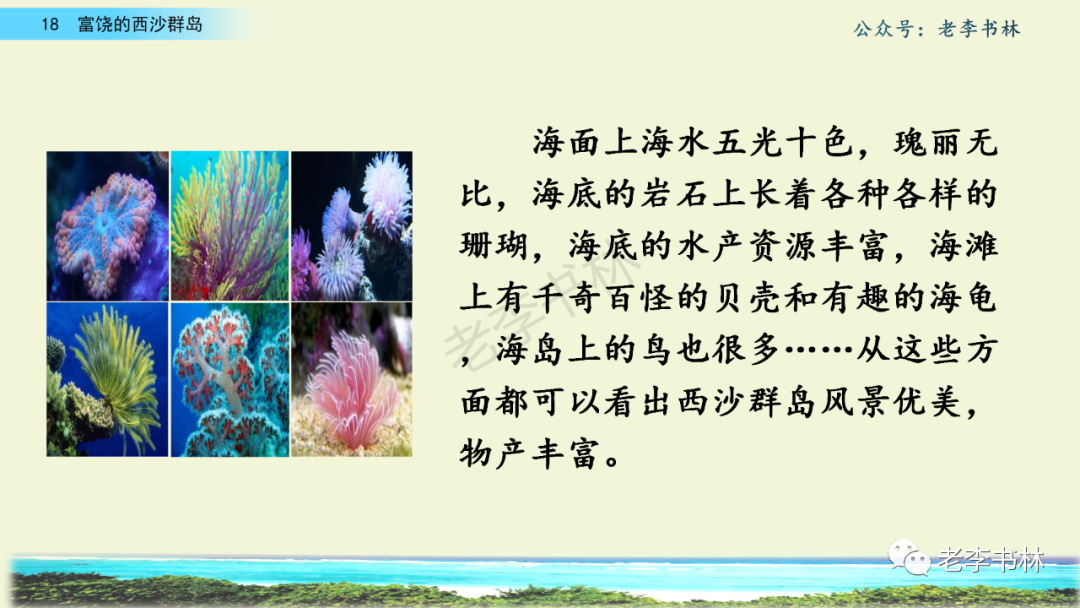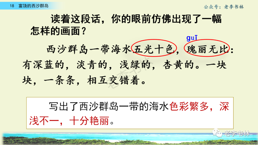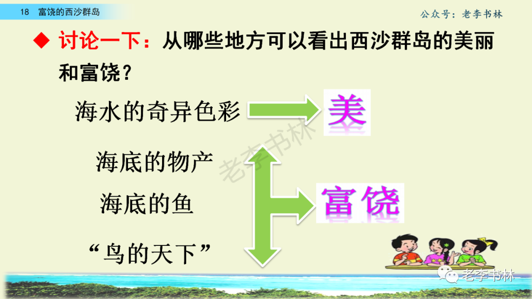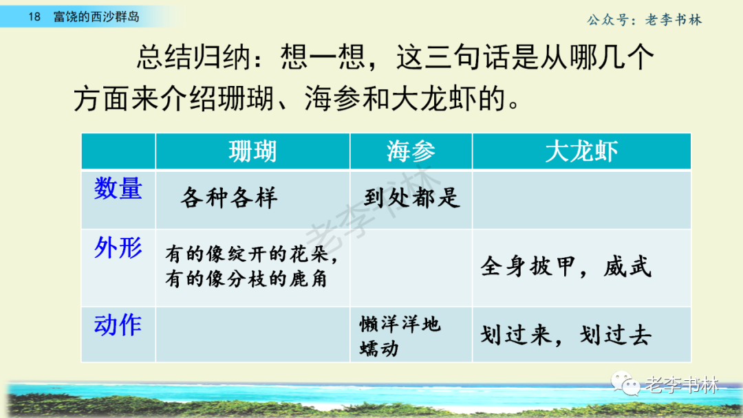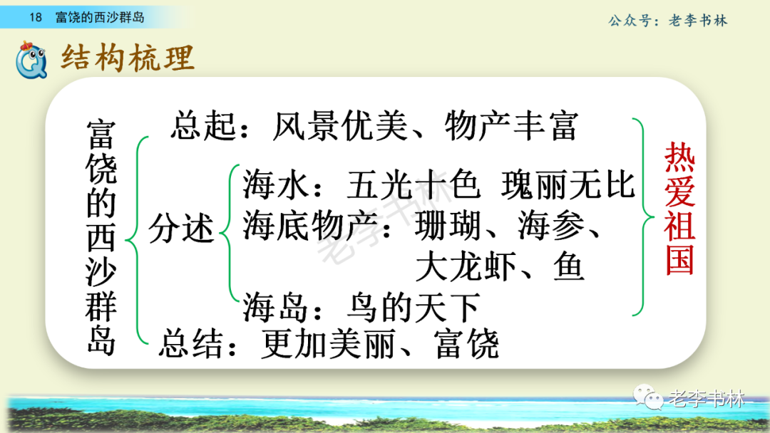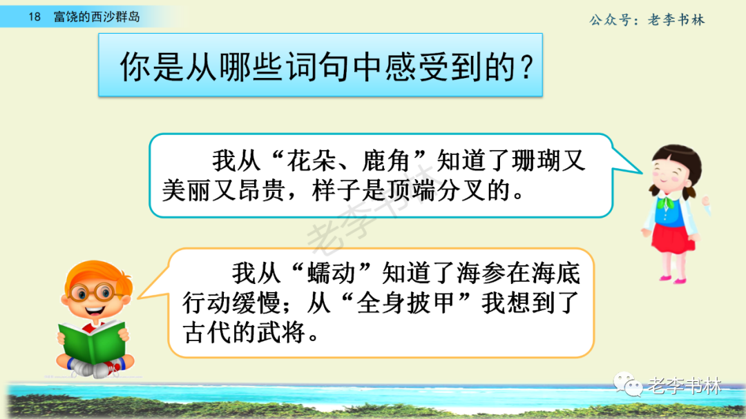 封面 电子教材 课文朗读 视频讲解 版本一 第1节 西沙群岛视频西沙群岛视频 第2节 版本二 第1节 第2节 版本三 第1课时 第2课时 知识点 01 我会写 富fù(富饶、富裕、丰富多彩) 优yōu(优美、优秀、优良) 浅qiǎn(浅绿、浅色、深浅) 错cuò(错乱、交错、错误) 岩yán(岩石、岩洞、花岗岩) 虾xiā(小虾、大龙虾、 虾米) 挺tǐng(挺威武、笔挺 、挺身而出) 鼓gǔ(鼓起、鼓掌、一鼓作气) 数shǔ(数不清、数数、不可胜数) 厚hòu(厚厚、厚重、宽厚) 宝bǎo(宝贵、宝石、珠光宝气) 贵guì(珍贵、宝贵、达官显贵) 02 我会认 饶ráo(富饶、饶裕、饶有兴趣) 瑰guī(瑰丽、瑰异、瑰宝) 参shēn(海参、人参、红参) 划huá(划船、划伤、划过来) 武wǔ(威武、英武、文武双全) 粪fèn(鸟粪、粪便、视如粪土) 辈bèi(祖辈、辈分、等闲之辈) 设shè(设计、建设、设身处地) 03 多音字 参shēn(海参)cān(参加) 数shǔ (数小棍)shù (数学) 04 近义词 瑰丽一一美丽 交错一一交叉 绽开一一绽放 威武一一威风 茂密一一茂盛 宝贵一一珍贵 五光十色一一五彩缤纷 各种各样一一各式各样 05 反义词 富饶一一贫瘠 丰富一一匮乏 绽开一一合拢 茂密一一稀疏 06 理解词语 瑰丽:异常美丽。 绽开:指植物的皮、壳等裂开,花儿开放。 蠕动:像蚯蚓爬行那样动。 茂密:(草木)茂盛而繁密。 栖息:停留;休息( 多指鸟类)。 富饶:物产多;财富多。 祖祖辈辈:世世代代。 07 句子解析 1.西沙群岛一带海水五光十色,瑰丽无比:有深蓝的,淡蓝的,浅绿的,杏黄的。一块块,一条条,相互交错着。 这一句描写了海水的各种颜色。“五光十色”指颜色多,“瑰丽”是颜色特别艳丽、好看。用“五光十色”和“瑰丽无比”说明海水的颜色很多,很漂亮。 2.海底的岩石上长着各种各样的珊瑚,有的像展开的花朵,有的像分枝的鹿角。 “各种各样”说明珊瑚的种类很多。绽开的花朵和分枝的鹿角是说海参的形状像花朵、像鹿角,这是一个比喻句。形象的写出了珊瑚的特点是:颜色鲜艳,样子奇特。 3.海参到处都是,在海底懒洋洋的蠕动。 “到处”一词写出了海参多,“懒洋洋”描绘出海参蠕动的样子,用词很准确,写出了海参的悠闲、自在。 4.有的全身布满彩色的文条;有的头上长一簇红缨;有的周身像插好多扇子,游动的时候飘飘遥遥;有的眼睛圆溜溜的,身上长满了刺,鼓起来像皮球一样圆。 运用排比和比喻的修辞方法,生动地描写了西沙群岛的海里各种鱼的外形特征。 08 问题归纳 1.读课文,想一想课文是围绕哪句话写的? 作者围绕“那里风景优美,物产丰富,是个可爱的地方。”这句话来写的。 2.作者是从哪几个方面来介绍西沙群岛的,把它圈出来。 课文按照由上到下、由近及远的顺序从海面、海底、海滩和岛上四方面具体写出西沙群岛的美丽富饶。 3.西沙群岛的海水为什么会有那么多的颜色,用“因为……,所以……”的句式回答。 因为海水的色彩和海底的地形有关。海底是山崖,海水浅,颜色就淡一些;海底是峡谷,海水深,颜色就深一些。所以从海面看,就呈现出不同的色彩。 4.作者在每个方面中都写到的是什么景物?是怎么写的? 作者描写海水是抓住颜色瑰丽来;写海底是抓住珊瑚、海参、大龙虾的形状和动作来写的和鱼的数量和形状来写的;写岛上是抓住鸟多来写的。作者每写一处都抓住了典型景物的特点进行描写。 5.这篇文章是按什么结构来写的? 这篇文章是按照“总一分一总”的结构来安排内容的。先总写西沙群岛的风景优美,物产丰富;再分写海水颜色瑰丽,以及珊瑚、海参、大龙虾、鱼和各种海鸟;最后总写西沙群岛必将变得更加美丽、富饶。这样写结构清晰,易于理解。 09 课文分段 第一部分(1):概括介绍西沙群岛的地理位置和特点。 第二部分(2-5):按照海面、海底、海岛的顺序具体介绍西沙群岛优美的风景和丰富的物产。 第三部分(6):写西山群岛必将变的更美丽,更加富饶。 10 课文主题 通过介绍了西沙群岛的地理位置和西沙群岛的美丽富饶,表达了作者对西沙群岛的喜爱之情。 11 教材课后习题答案 一、有感情的朗读课文。说说从哪些地方可以看出西沙群岛风景优美、物产丰富。 答案: 从第2自然段的描述中,可以感受到西沙群岛风景优美(西沙群岛一带海水五光十色,瑰丽无比:有深蓝的,淡青的,浅绿的,杏黄的。一块块,一条条,相互交错。)。 从3—5自然段的描述中,可以感受到西沙群岛物产丰富。(比如各种各样的珊瑚,海参到处都是,各种各样的鱼多得数不清,还有各种海鸟,是鸟的天下,遍地都是鸟蛋。) 二、选择你喜欢的部分,向别人介绍西沙群岛。 提示:本题要在熟读课文的基础上,按照课文的表达方式来写。 例:这里的鱼真多、真漂亮啊!有的全身布满彩色的条纹;有的眼睛圆溜溜的,身上长满了刺,鼓起气来像皮球一样圆;有的头上长着一簇红缨;有的周身像插着好些扇子,游动的时候飘飘摇摇。你看,还有的鱼像一片片黄色的叶子,又像一把把黄色的扇子,大大小小的,多得数也数不清。如果非要数,那恐怕要数上好几年呢! 三.西沙群岛的海里还有哪些美丽的景色?观察下面的图画,仿照课文第四自然段写一写。 海洋里的鱼儿们长得千奇百怪。有的身上长着各种花纹,真象美丽的珊瑚在海里移动;有的鱼儿像一个织布的梭子,在水里灵活的窜来窜去;还有的像一个个红色的小精灵,在你眼前闪一下就消失不见了!海洋里的鱼儿可真