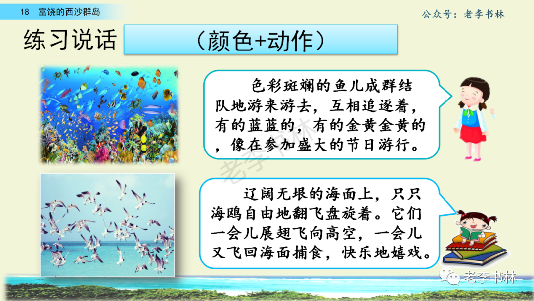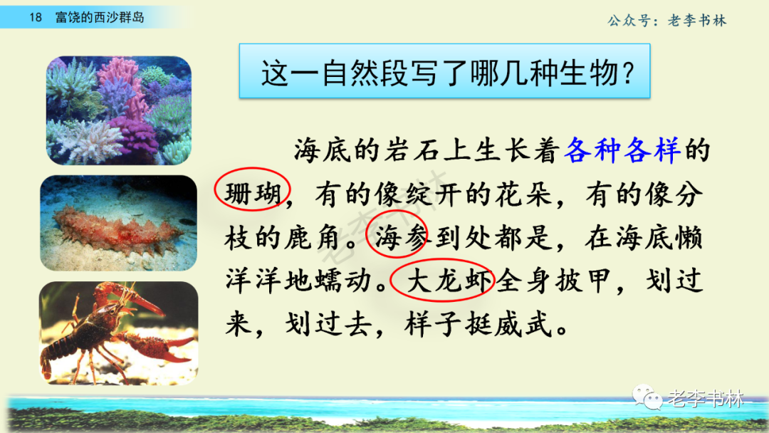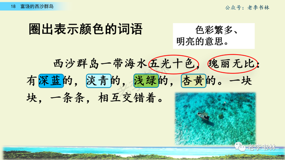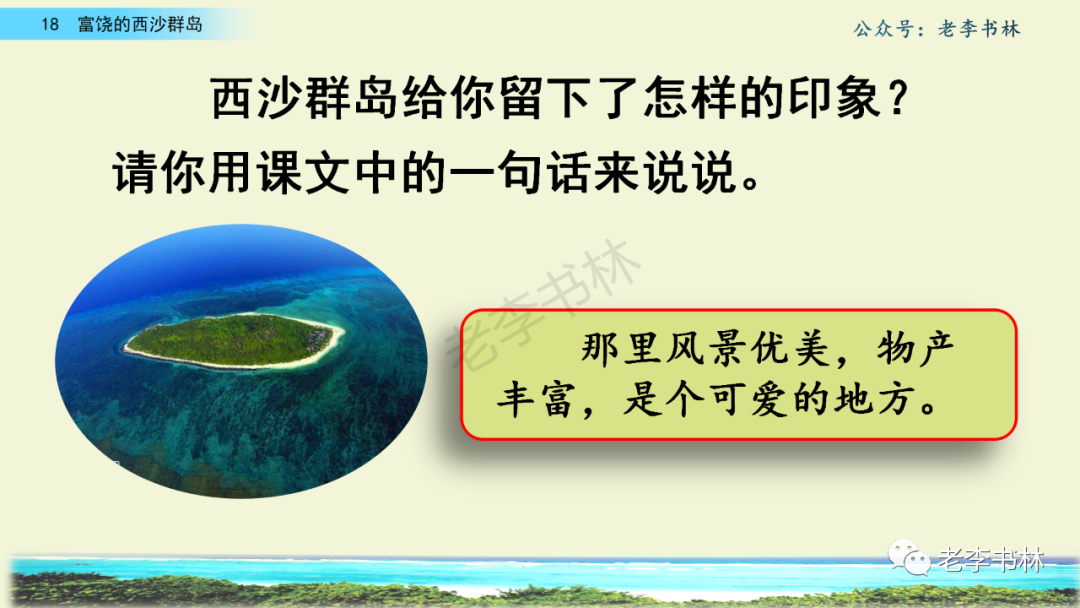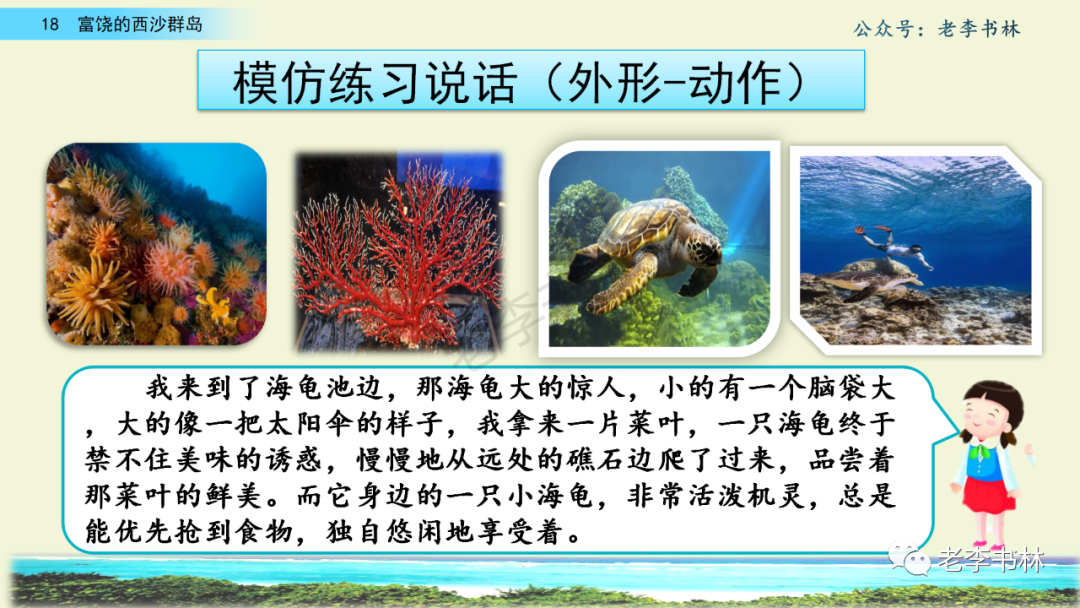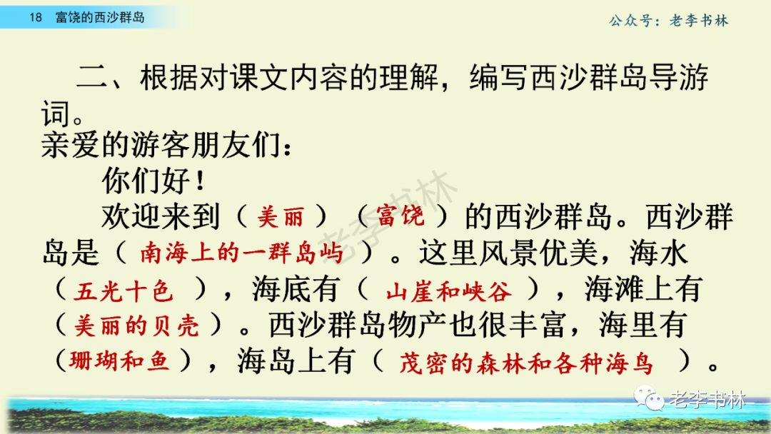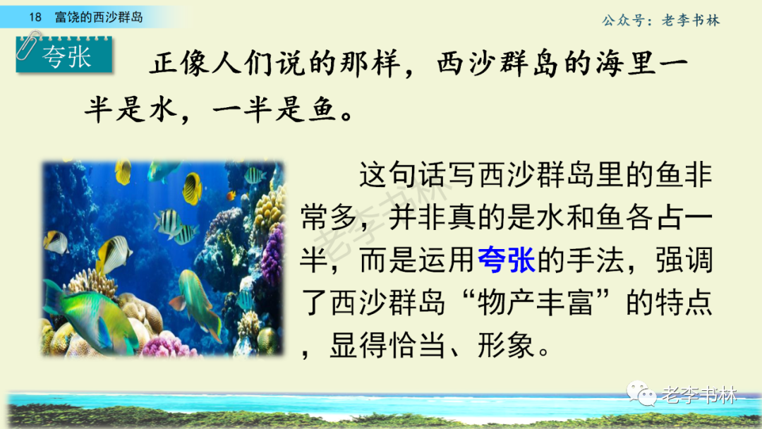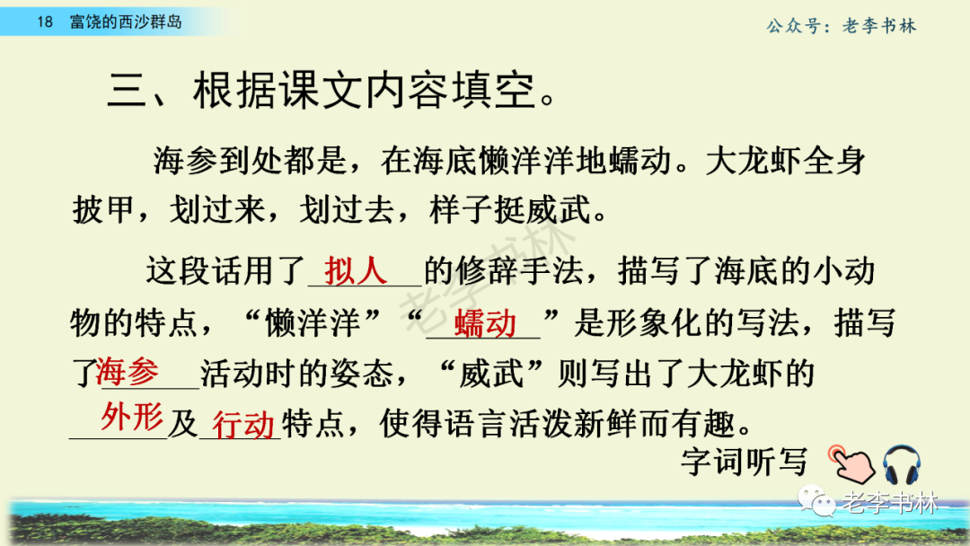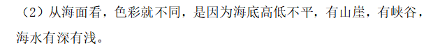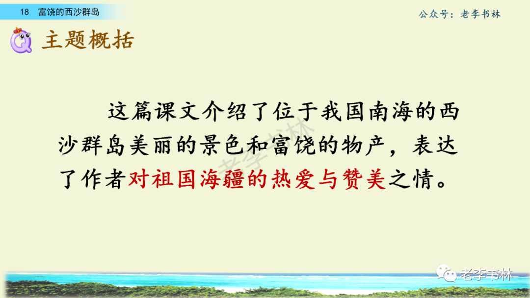 封面 电子教材 课文朗读 视频讲解 版本一 第1节 西沙群岛视频西沙群岛视频 第2节 版本二 第1节 第2节 版本三 第1课时 第2课时 知识点 01 我会写 富fù(富饶、富裕、丰富多彩) 优yōu(优美、优秀、优良) 浅qiǎn(浅绿、浅色、深浅) 错cuò(错乱、交错、错误) 岩yán(岩石、岩洞、花岗岩) 虾xiā(小虾、大龙虾、 虾米) 挺tǐng(挺威武、笔挺 、挺身而出) 鼓gǔ(鼓起、鼓掌、一鼓作气) 数shǔ(数不清、数数、不可胜数) 厚hòu(厚厚、厚重、宽厚) 宝bǎo(宝贵、宝石、珠光宝气) 贵guì(珍贵、宝贵、达官显贵) 02 我会认 饶ráo(富饶、饶裕、饶有兴趣) 瑰guī(瑰丽、瑰异、瑰宝) 参shēn(海参、人参、红参) 划huá(划船、划伤、划过来) 武wǔ(威武、英武、文武双全) 粪fèn(鸟粪、粪便、视如粪土) 辈bèi(祖辈、辈分、等闲之辈) 设shè(设计、建设、设身处地) 03 多音字 参shēn(海参)cān(参加) 数shǔ (数小棍)shù (数学) 04 近义词 瑰丽一一美丽 交错一一交叉 绽开一一绽放 威武一一威风 茂密一一茂盛 宝贵一一珍贵 五光十色一一五彩缤纷 各种各样一一各式各样 05 反义词 富饶一一贫瘠 丰富一一匮乏 绽开一一合拢 茂密一一稀疏 06 理解词语 瑰丽:异常美丽。 绽开:指植物的皮、壳等裂开,花儿开放。 蠕动:像蚯蚓爬行那样动。 茂密:(草木)茂盛而繁密。 栖息:停留;休息( 多指鸟类)。 富饶:物产多;财富多。 祖祖辈辈:世世代代。 07 句子解析 1.西沙群岛一带海水五光十色,瑰丽无比:有深蓝的,淡蓝的,浅绿的,杏黄的。一块块,一条条,相互交错着。 这一句描写了海水的各种颜色。“五光十色”指颜色多,“瑰丽”是颜色特别艳丽、好看。用“五光十色”和“瑰丽无比”说明海水的颜色很多,很漂亮。 2.海底的岩石上长着各种各样的珊瑚,有的像展开的花朵,有的像分枝的鹿角。 “各种各样”说明珊瑚的种类很多。绽开的花朵和分枝的鹿角是说海参的形状像花朵、像鹿角,这是一个比喻句。形象的写出了珊瑚的特点是:颜色鲜艳,样子奇特。 3.海参到处都是,在海底懒洋洋的蠕动。 “到处”一词写出了海参多,“懒洋洋”描绘出海参蠕动的样子,用词很准确,写出了海参的悠闲、自在。 4.有的全身布满彩色的文条;有的头上长一簇红缨;有的周身像插好多扇子,游动的时候飘飘遥遥;有的眼睛圆溜溜的,身上长满了刺,鼓起来像皮球一样圆。 运用排比和比喻的修辞方法,生动地描写了西沙群岛的海里各种鱼的外形特征。 08 问题归纳 1.读课文,想一想课文是围绕哪句话写的? 作者围绕“那里风景优美,物产丰富,是个可爱的地方。”这句话来写的。 2.作者是从哪几个方面来介绍西沙群岛的,把它圈出来。 课文按照由上到下、由近及远的顺序从海面、海底、海滩和岛上四方面具体写出西沙群岛的美丽富饶。 3.西沙群岛的海水为什么会有那么多的颜色,用“因为……,所以……”的句式回答。 因为海水的色彩和海底的地形有关。海底是山崖,海水浅,颜色就淡一些;海底是峡谷,海水深,颜色就深一些。所以从海面看,就呈现出不同的色彩。 4.作者在每个方面中都写到的是什么景物?是怎么写的? 作者描写海水是抓住颜色瑰丽来;写海底是抓住珊瑚、海参、大龙虾的形状和动作来写的和鱼的数量和形状来写的;写岛上是抓住鸟多来写的。作者每写一处都抓住了典型景物的特点进行描写。 5.这篇文章是按什么结构来写的? 这篇文章是按照“总一分一总”的结构来安排内容的。先总写西沙群岛的风景优美,物产丰富;再分写海水颜色瑰丽,以及珊瑚、海参、大龙虾、鱼和各种海鸟;最后总写西沙群岛必将变得更加美丽、富饶。这样写结构清晰,易于理解。 09 课文分段 第一部分(1):概括介绍西沙群岛的地理位置和特点。 第二部分(2-5):按照海面、海底、海岛的顺序具体介绍西沙群岛优美的风景和丰富的物产。 第三部分(6):写西山群岛必将变的更美丽,更加富饶。 10 课文主题 通过介绍了西沙群岛的地理位置和西沙群岛的美丽富饶,表达了作者对西沙群岛的喜爱之情。 11 教材课后习题答案 一、有感情的朗读课文。说说从哪些地方可以看出西沙群岛风景优美、物产丰富。 答案: 从第2自然段的描述中,可以感受到西沙群岛风景优美(西沙群岛一带海水五光十色,瑰丽无比:有深蓝的,淡青的,浅绿的,杏黄的。一块块,一条条,相互交错。)。 从3—5自然段的描述中,可以感受到西沙群岛物产丰富。(比如各种各样的珊瑚,海参到处都是,各种各样的鱼多得数不清,还有各种海鸟,是鸟的天下,遍地都是鸟蛋。) 二、选择你喜欢的部分,向别人介绍西沙群岛。 提示:本题要在熟读课文的基础上,按照课文的表达方式来写。 例:这里的鱼真多、真漂亮啊!有的全身布满彩色的条纹;有的眼睛圆溜溜的,身上长满了刺,鼓起气来像皮球一样圆;有的头上长着一簇红缨;有的周身像插着好些扇子,游动的时候飘飘摇摇。你看,还有的鱼像一片片黄色的叶子,又像一把把黄色的扇子,大大小小的,多得数也数不清。如果非要数,那恐怕要数上好几年呢! 三.西沙群岛的海里还有哪些美丽的景色?观察下面的图画,仿照课文第四自然段写一写。 海洋里的鱼儿们长得千奇百怪。有的身上长着各种花纹,真象美丽的珊瑚在海里移动;有的鱼儿像一个织布的梭子,在水里灵活的窜来窜去;还有的像一个个红色的小精灵,在你眼前闪一下就消失不见了!海洋里的鱼儿可真
