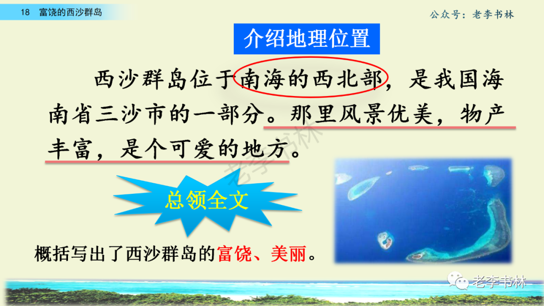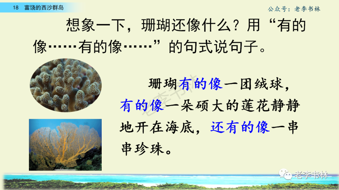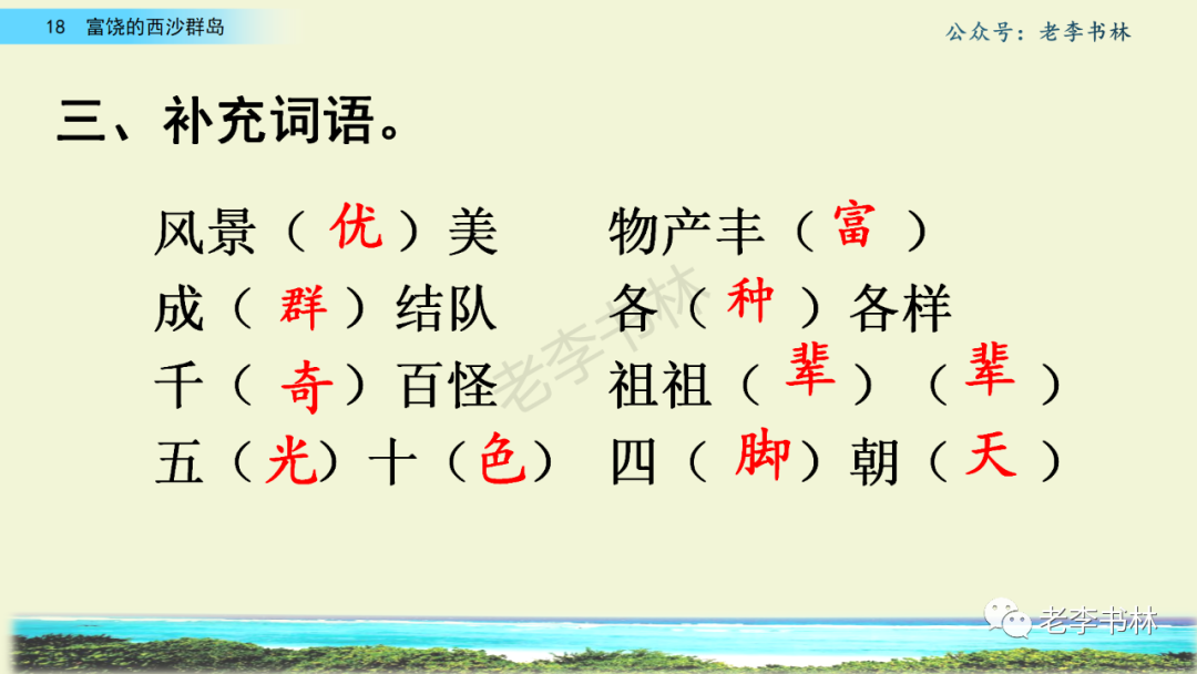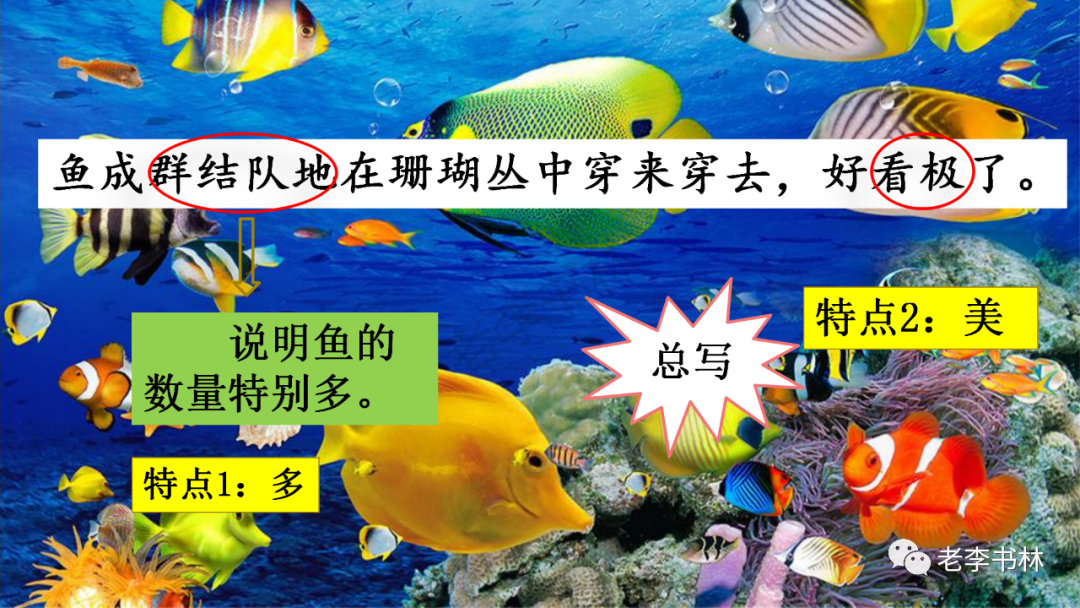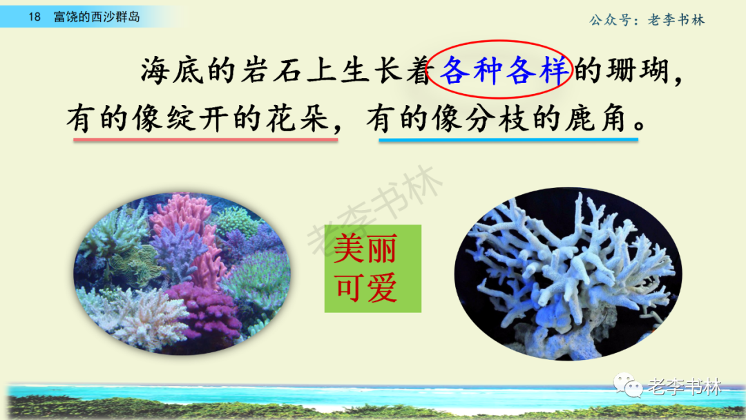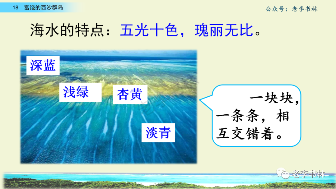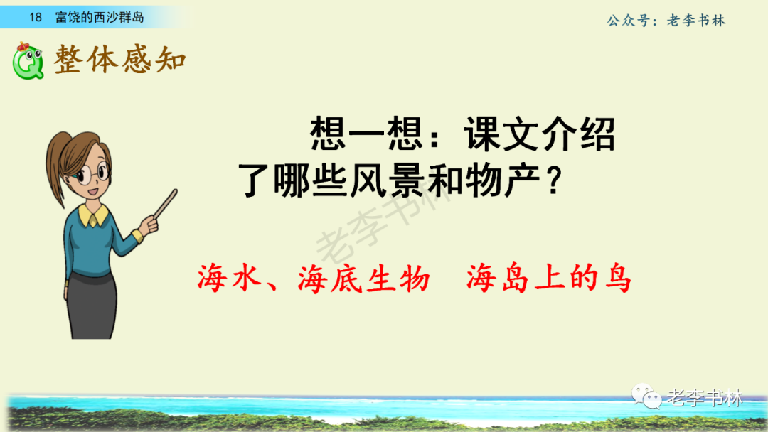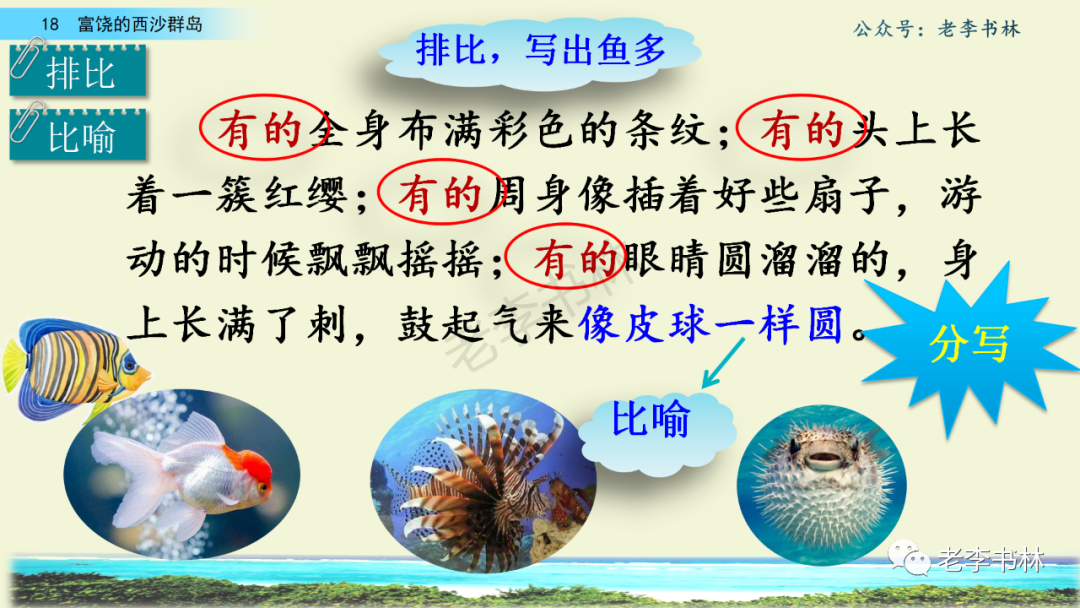 封面 电子教材 课文朗读 视频讲解 版本一 第1节 西沙群岛视频西沙群岛视频 第2节 版本二 第1节 第2节 版本三 第1课时 第2课时 知识点 01 我会写 富fù(富饶、富裕、丰富多彩) 优yōu(优美、优秀、优良) 浅qiǎn(浅绿、浅色、深浅) 错cuò(错乱、交错、错误) 岩yán(岩石、岩洞、花岗岩) 虾xiā(小虾、大龙虾、 虾米) 挺tǐng(挺威武、笔挺 、挺身而出) 鼓gǔ(鼓起、鼓掌、一鼓作气) 数shǔ(数不清、数数、不可胜数) 厚hòu(厚厚、厚重、宽厚) 宝bǎo(宝贵、宝石、珠光宝气) 贵guì(珍贵、宝贵、达官显贵) 02 我会认 饶ráo(富饶、饶裕、饶有兴趣) 瑰guī(瑰丽、瑰异、瑰宝) 参shēn(海参、人参、红参) 划huá(划船、划伤、划过来) 武wǔ(威武、英武、文武双全) 粪fèn(鸟粪、粪便、视如粪土) 辈bèi(祖辈、辈分、等闲之辈) 设shè(设计、建设、设身处地) 03 多音字 参shēn(海参)cān(参加) 数shǔ (数小棍)shù (数学) 04 近义词 瑰丽一一美丽 交错一一交叉 绽开一一绽放 威武一一威风 茂密一一茂盛 宝贵一一珍贵 五光十色一一五彩缤纷 各种各样一一各式各样 05 反义词 富饶一一贫瘠 丰富一一匮乏 绽开一一合拢 茂密一一稀疏 06 理解词语 瑰丽:异常美丽。 绽开:指植物的皮、壳等裂开,花儿开放。 蠕动:像蚯蚓爬行那样动。 茂密:(草木)茂盛而繁密。 栖息:停留;休息( 多指鸟类)。 富饶:物产多;财富多。 祖祖辈辈:世世代代。 07 句子解析 1.西沙群岛一带海水五光十色,瑰丽无比:有深蓝的,淡蓝的,浅绿的,杏黄的。一块块,一条条,相互交错着。 这一句描写了海水的各种颜色。“五光十色”指颜色多,“瑰丽”是颜色特别艳丽、好看。用“五光十色”和“瑰丽无比”说明海水的颜色很多,很漂亮。 2.海底的岩石上长着各种各样的珊瑚,有的像展开的花朵,有的像分枝的鹿角。 “各种各样”说明珊瑚的种类很多。绽开的花朵和分枝的鹿角是说海参的形状像花朵、像鹿角,这是一个比喻句。形象的写出了珊瑚的特点是:颜色鲜艳,样子奇特。 3.海参到处都是,在海底懒洋洋的蠕动。 “到处”一词写出了海参多,“懒洋洋”描绘出海参蠕动的样子,用词很准确,写出了海参的悠闲、自在。 4.有的全身布满彩色的文条;有的头上长一簇红缨;有的周身像插好多扇子,游动的时候飘飘遥遥;有的眼睛圆溜溜的,身上长满了刺,鼓起来像皮球一样圆。 运用排比和比喻的修辞方法,生动地描写了西沙群岛的海里各种鱼的外形特征。 08 问题归纳 1.读课文,想一想课文是围绕哪句话写的? 作者围绕“那里风景优美,物产丰富,是个可爱的地方。”这句话来写的。 2.作者是从哪几个方面来介绍西沙群岛的,把它圈出来。 课文按照由上到下、由近及远的顺序从海面、海底、海滩和岛上四方面具体写出西沙群岛的美丽富饶。 3.西沙群岛的海水为什么会有那么多的颜色,用“因为……,所以……”的句式回答。 因为海水的色彩和海底的地形有关。海底是山崖,海水浅,颜色就淡一些;海底是峡谷,海水深,颜色就深一些。所以从海面看,就呈现出不同的色彩。 4.作者在每个方面中都写到的是什么景物?是怎么写的? 作者描写海水是抓住颜色瑰丽来;写海底是抓住珊瑚、海参、大龙虾的形状和动作来写的和鱼的数量和形状来写的;写岛上是抓住鸟多来写的。作者每写一处都抓住了典型景物的特点进行描写。 5.这篇文章是按什么结构来写的? 这篇文章是按照“总一分一总”的结构来安排内容的。先总写西沙群岛的风景优美,物产丰富;再分写海水颜色瑰丽,以及珊瑚、海参、大龙虾、鱼和各种海鸟;最后总写西沙群岛必将变得更加美丽、富饶。这样写结构清晰,易于理解。 09 课文分段 第一部分(1):概括介绍西沙群岛的地理位置和特点。 第二部分(2-5):按照海面、海底、海岛的顺序具体介绍西沙群岛优美的风景和丰富的物产。 第三部分(6):写西山群岛必将变的更美丽,更加富饶。 10 课文主题 通过介绍了西沙群岛的地理位置和西沙群岛的美丽富饶,表达了作者对西沙群岛的喜爱之情。 11 教材课后习题答案 一、有感情的朗读课文。说说从哪些地方可以看出西沙群岛风景优美、物产丰富。 答案: 从第2自然段的描述中,可以感受到西沙群岛风景优美(西沙群岛一带海水五光十色,瑰丽无比:有深蓝的,淡青的,浅绿的,杏黄的。一块块,一条条,相互交错。)。 从3—5自然段的描述中,可以感受到西沙群岛物产丰富。(比如各种各样的珊瑚,海参到处都是,各种各样的鱼多得数不清,还有各种海鸟,是鸟的天下,遍地都是鸟蛋。) 二、选择你喜欢的部分,向别人介绍西沙群岛。 提示:本题要在熟读课文的基础上,按照课文的表达方式来写。 例:这里的鱼真多、真漂亮啊!有的全身布满彩色的条纹;有的眼睛圆溜溜的,身上长满了刺,鼓起气来像皮球一样圆;有的头上长着一簇红缨;有的周身像插着好些扇子,游动的时候飘飘摇摇。你看,还有的鱼像一片片黄色的叶子,又像一把把黄色的扇子,大大小小的,多得数也数不清。如果非要数,那恐怕要数上好几年呢! 三.西沙群岛的海里还有哪些美丽的景色?观察下面的图画,仿照课文第四自然段写一写。 海洋里的鱼儿们长得千奇百怪。有的身上长着各种花纹,真象美丽的珊瑚在海里移动;有的鱼儿像一个织布的梭子,在水里灵活的窜来窜去;还有的像一个个红色的小精灵,在你眼前闪一下就消失不见了!海洋里的鱼儿可真