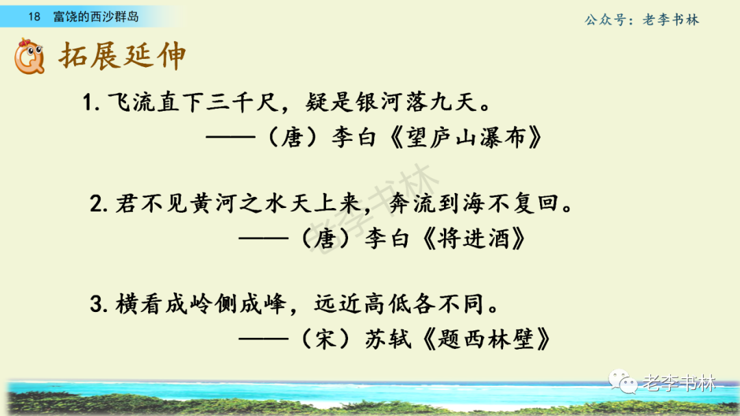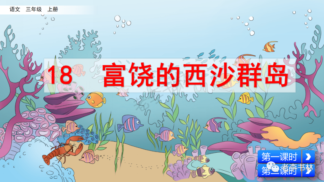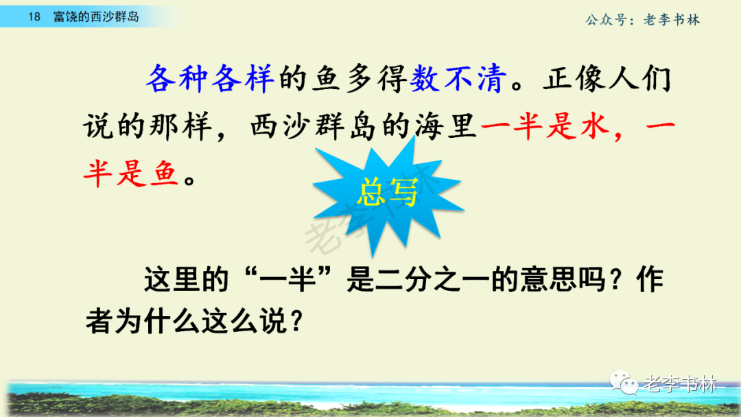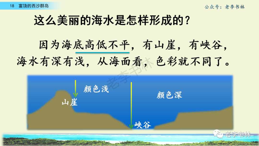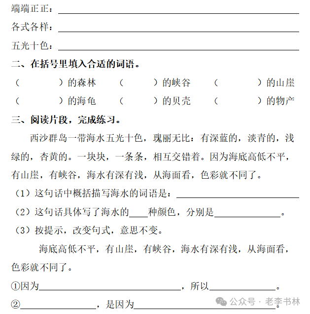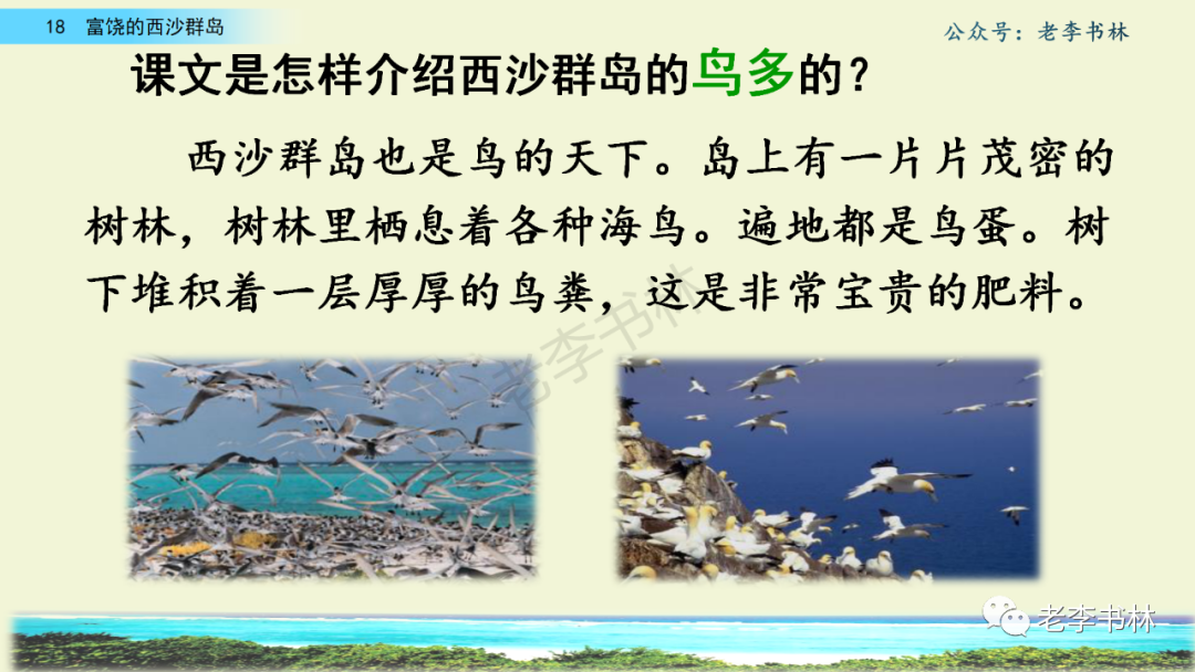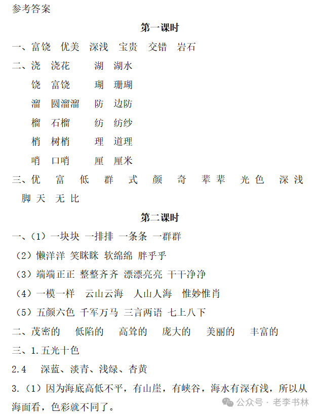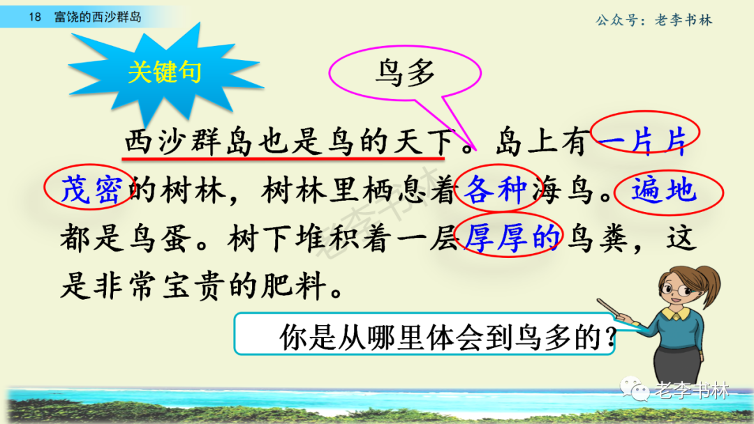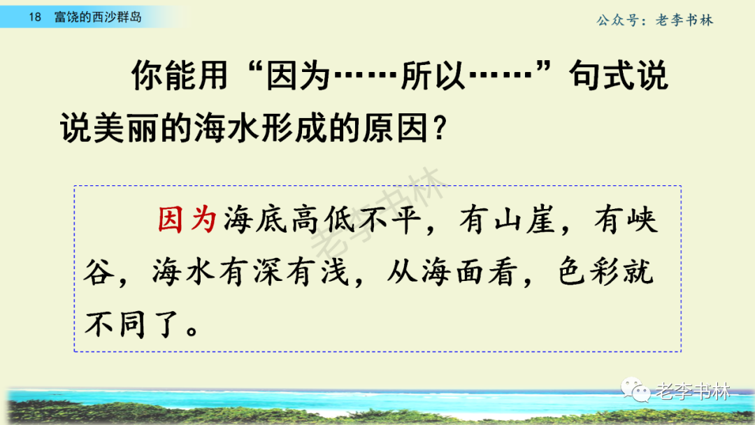 封面 电子教材 课文朗读 视频讲解 版本一 第1节 西沙群岛视频西沙群岛视频 第2节 版本二 第1节 第2节 版本三 第1课时 第2课时 知识点 01 我会写 富fù(富饶、富裕、丰富多彩) 优yōu(优美、优秀、优良) 浅qiǎn(浅绿、浅色、深浅) 错cuò(错乱、交错、错误) 岩yán(岩石、岩洞、花岗岩) 虾xiā(小虾、大龙虾、 虾米) 挺tǐng(挺威武、笔挺 、挺身而出) 鼓gǔ(鼓起、鼓掌、一鼓作气) 数shǔ(数不清、数数、不可胜数) 厚hòu(厚厚、厚重、宽厚) 宝bǎo(宝贵、宝石、珠光宝气) 贵guì(珍贵、宝贵、达官显贵) 02 我会认 饶ráo(富饶、饶裕、饶有兴趣) 瑰guī(瑰丽、瑰异、瑰宝) 参shēn(海参、人参、红参) 划huá(划船、划伤、划过来) 武wǔ(威武、英武、文武双全) 粪fèn(鸟粪、粪便、视如粪土) 辈bèi(祖辈、辈分、等闲之辈) 设shè(设计、建设、设身处地) 03 多音字 参shēn(海参)cān(参加) 数shǔ (数小棍)shù (数学) 04 近义词 瑰丽一一美丽 交错一一交叉 绽开一一绽放 威武一一威风 茂密一一茂盛 宝贵一一珍贵 五光十色一一五彩缤纷 各种各样一一各式各样 05 反义词 富饶一一贫瘠 丰富一一匮乏 绽开一一合拢 茂密一一稀疏 06 理解词语 瑰丽:异常美丽。 绽开:指植物的皮、壳等裂开,花儿开放。 蠕动:像蚯蚓爬行那样动。 茂密:(草木)茂盛而繁密。 栖息:停留;休息( 多指鸟类)。 富饶:物产多;财富多。 祖祖辈辈:世世代代。 07 句子解析 1.西沙群岛一带海水五光十色,瑰丽无比:有深蓝的,淡蓝的,浅绿的,杏黄的。一块块,一条条,相互交错着。 这一句描写了海水的各种颜色。“五光十色”指颜色多,“瑰丽”是颜色特别艳丽、好看。用“五光十色”和“瑰丽无比”说明海水的颜色很多,很漂亮。 2.海底的岩石上长着各种各样的珊瑚,有的像展开的花朵,有的像分枝的鹿角。 “各种各样”说明珊瑚的种类很多。绽开的花朵和分枝的鹿角是说海参的形状像花朵、像鹿角,这是一个比喻句。形象的写出了珊瑚的特点是:颜色鲜艳,样子奇特。 3.海参到处都是,在海底懒洋洋的蠕动。 “到处”一词写出了海参多,“懒洋洋”描绘出海参蠕动的样子,用词很准确,写出了海参的悠闲、自在。 4.有的全身布满彩色的文条;有的头上长一簇红缨;有的周身像插好多扇子,游动的时候飘飘遥遥;有的眼睛圆溜溜的,身上长满了刺,鼓起来像皮球一样圆。 运用排比和比喻的修辞方法,生动地描写了西沙群岛的海里各种鱼的外形特征。 08 问题归纳 1.读课文,想一想课文是围绕哪句话写的? 作者围绕“那里风景优美,物产丰富,是个可爱的地方。”这句话来写的。 2.作者是从哪几个方面来介绍西沙群岛的,把它圈出来。 课文按照由上到下、由近及远的顺序从海面、海底、海滩和岛上四方面具体写出西沙群岛的美丽富饶。 3.西沙群岛的海水为什么会有那么多的颜色,用“因为……,所以……”的句式回答。 因为海水的色彩和海底的地形有关。海底是山崖,海水浅,颜色就淡一些;海底是峡谷,海水深,颜色就深一些。所以从海面看,就呈现出不同的色彩。 4.作者在每个方面中都写到的是什么景物?是怎么写的? 作者描写海水是抓住颜色瑰丽来;写海底是抓住珊瑚、海参、大龙虾的形状和动作来写的和鱼的数量和形状来写的;写岛上是抓住鸟多来写的。作者每写一处都抓住了典型景物的特点进行描写。 5.这篇文章是按什么结构来写的? 这篇文章是按照“总一分一总”的结构来安排内容的。先总写西沙群岛的风景优美,物产丰富;再分写海水颜色瑰丽,以及珊瑚、海参、大龙虾、鱼和各种海鸟;最后总写西沙群岛必将变得更加美丽、富饶。这样写结构清晰,易于理解。 09 课文分段 第一部分(1):概括介绍西沙群岛的地理位置和特点。 第二部分(2-5):按照海面、海底、海岛的顺序具体介绍西沙群岛优美的风景和丰富的物产。 第三部分(6):写西山群岛必将变的更美丽,更加富饶。 10 课文主题 通过介绍了西沙群岛的地理位置和西沙群岛的美丽富饶,表达了作者对西沙群岛的喜爱之情。 11 教材课后习题答案 一、有感情的朗读课文。说说从哪些地方可以看出西沙群岛风景优美、物产丰富。 答案: 从第2自然段的描述中,可以感受到西沙群岛风景优美(西沙群岛一带海水五光十色,瑰丽无比:有深蓝的,淡青的,浅绿的,杏黄的。一块块,一条条,相互交错。)。 从3—5自然段的描述中,可以感受到西沙群岛物产丰富。(比如各种各样的珊瑚,海参到处都是,各种各样的鱼多得数不清,还有各种海鸟,是鸟的天下,遍地都是鸟蛋。) 二、选择你喜欢的部分,向别人介绍西沙群岛。 提示:本题要在熟读课文的基础上,按照课文的表达方式来写。 例:这里的鱼真多、真漂亮啊!有的全身布满彩色的条纹;有的眼睛圆溜溜的,身上长满了刺,鼓起气来像皮球一样圆;有的头上长着一簇红缨;有的周身像插着好些扇子,游动的时候飘飘摇摇。你看,还有的鱼像一片片黄色的叶子,又像一把把黄色的扇子,大大小小的,多得数也数不清。如果非要数,那恐怕要数上好几年呢! 三.西沙群岛的海里还有哪些美丽的景色?观察下面的图画,仿照课文第四自然段写一写。 海洋里的鱼儿们长得千奇百怪。有的身上长着各种花纹,真象美丽的珊瑚在海里移动;有的鱼儿像一个织布的梭子,在水里灵活的窜来窜去;还有的像一个个红色的小精灵,在你眼前闪一下就消失不见了!海洋里的鱼儿可真