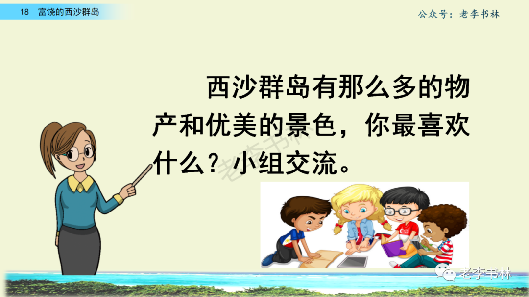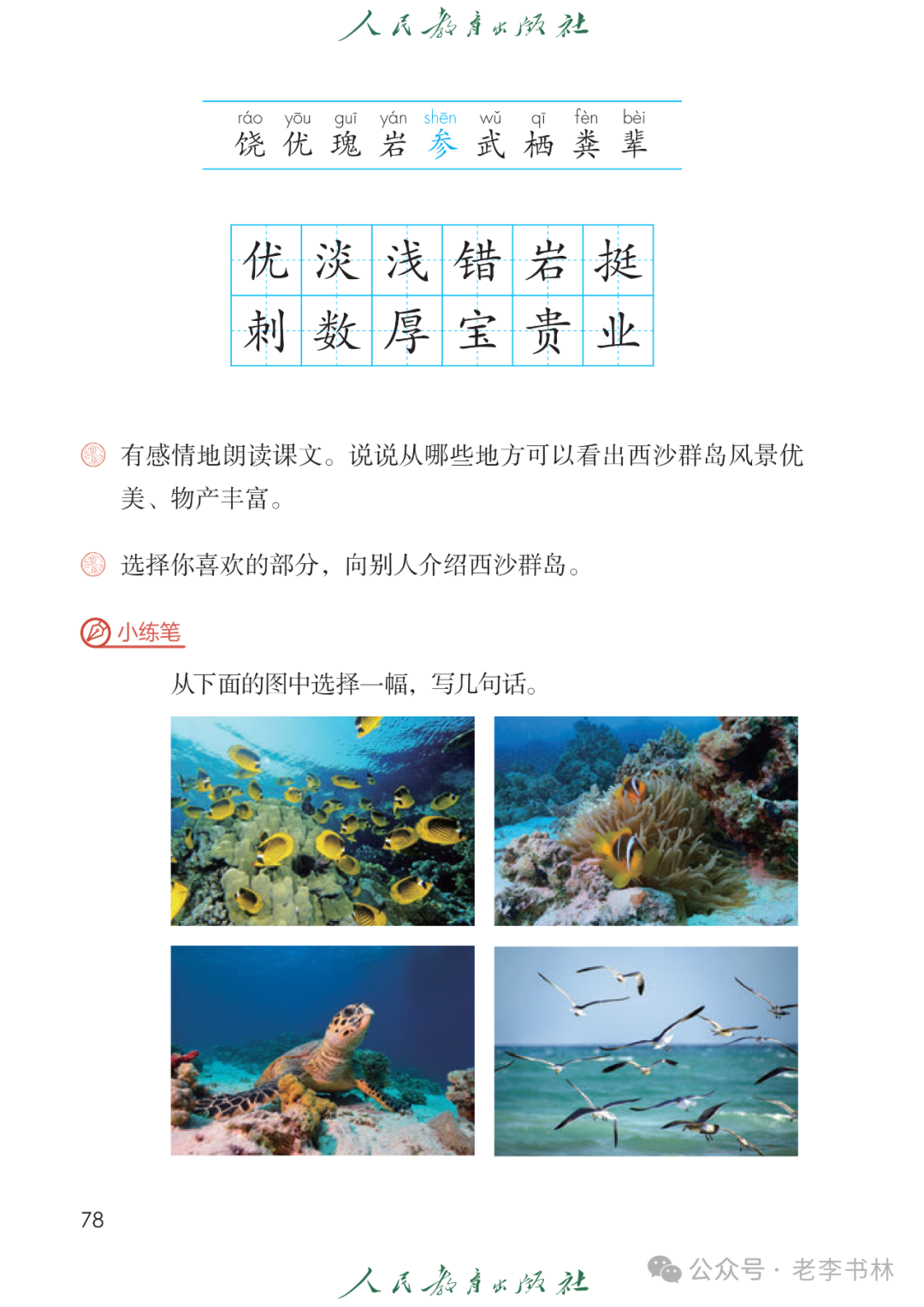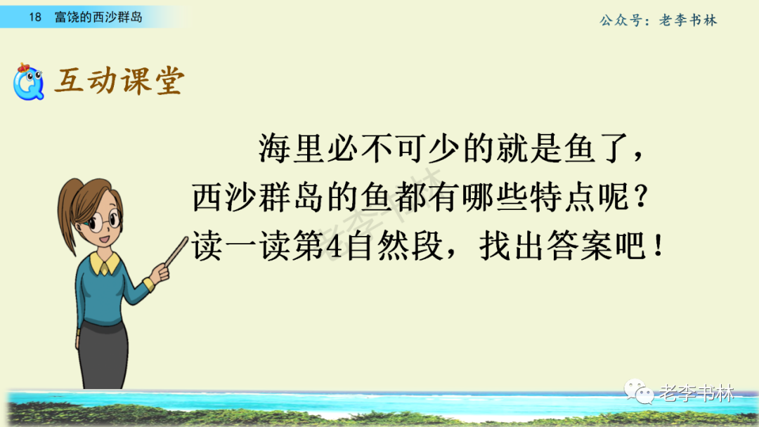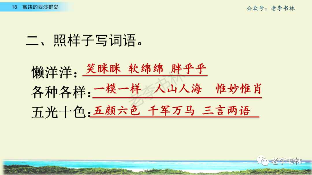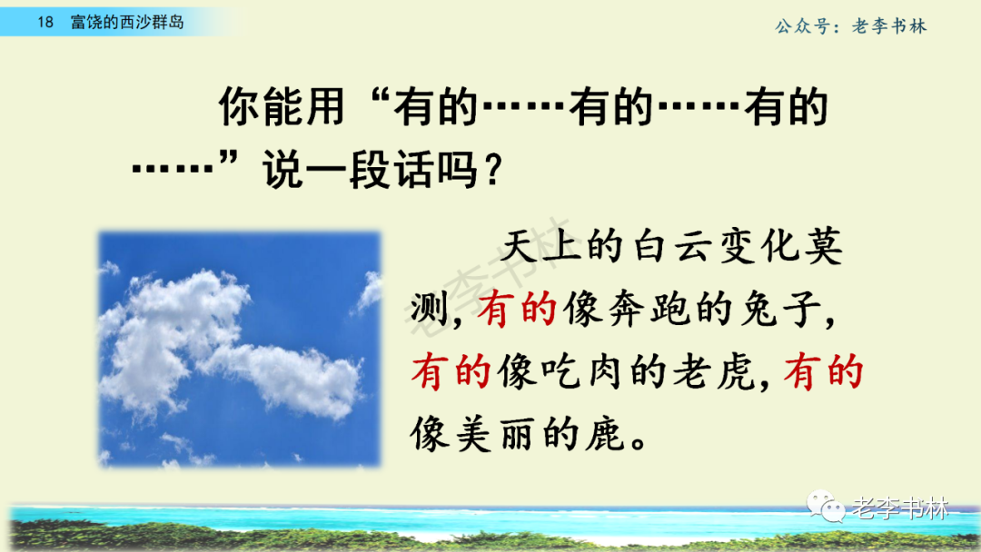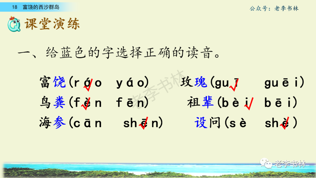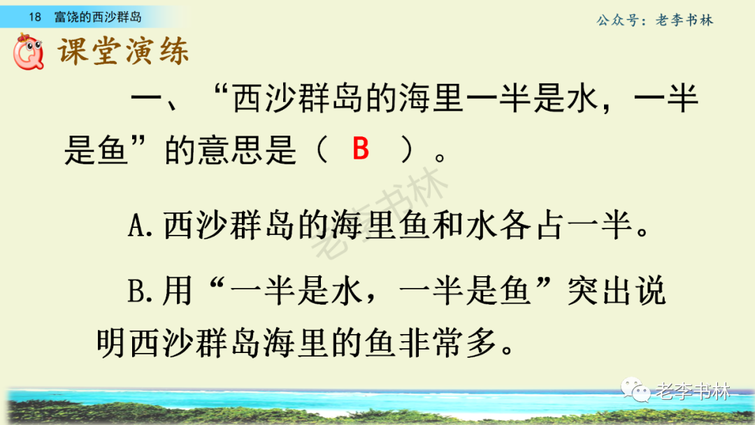 封面 电子教材 课文朗读 视频讲解 版本一 第1节 西沙群岛视频西沙群岛视频 第2节 版本二 第1节 第2节 版本三 第1课时 第2课时 知识点 01 我会写 富fù(富饶、富裕、丰富多彩) 优yōu(优美、优秀、优良) 浅qiǎn(浅绿、浅色、深浅) 错cuò(错乱、交错、错误) 岩yán(岩石、岩洞、花岗岩) 虾xiā(小虾、大龙虾、 虾米) 挺tǐng(挺威武、笔挺 、挺身而出) 鼓gǔ(鼓起、鼓掌、一鼓作气) 数shǔ(数不清、数数、不可胜数) 厚hòu(厚厚、厚重、宽厚) 宝bǎo(宝贵、宝石、珠光宝气) 贵guì(珍贵、宝贵、达官显贵) 02 我会认 饶ráo(富饶、饶裕、饶有兴趣) 瑰guī(瑰丽、瑰异、瑰宝) 参shēn(海参、人参、红参) 划huá(划船、划伤、划过来) 武wǔ(威武、英武、文武双全) 粪fèn(鸟粪、粪便、视如粪土) 辈bèi(祖辈、辈分、等闲之辈) 设shè(设计、建设、设身处地) 03 多音字 参shēn(海参)cān(参加) 数shǔ (数小棍)shù (数学) 04 近义词 瑰丽一一美丽 交错一一交叉 绽开一一绽放 威武一一威风 茂密一一茂盛 宝贵一一珍贵 五光十色一一五彩缤纷 各种各样一一各式各样 05 反义词 富饶一一贫瘠 丰富一一匮乏 绽开一一合拢 茂密一一稀疏 06 理解词语 瑰丽:异常美丽。 绽开:指植物的皮、壳等裂开,花儿开放。 蠕动:像蚯蚓爬行那样动。 茂密:(草木)茂盛而繁密。 栖息:停留;休息( 多指鸟类)。 富饶:物产多;财富多。 祖祖辈辈:世世代代。 07 句子解析 1.西沙群岛一带海水五光十色,瑰丽无比:有深蓝的,淡蓝的,浅绿的,杏黄的。一块块,一条条,相互交错着。 这一句描写了海水的各种颜色。“五光十色”指颜色多,“瑰丽”是颜色特别艳丽、好看。用“五光十色”和“瑰丽无比”说明海水的颜色很多,很漂亮。 2.海底的岩石上长着各种各样的珊瑚,有的像展开的花朵,有的像分枝的鹿角。 “各种各样”说明珊瑚的种类很多。绽开的花朵和分枝的鹿角是说海参的形状像花朵、像鹿角,这是一个比喻句。形象的写出了珊瑚的特点是:颜色鲜艳,样子奇特。 3.海参到处都是,在海底懒洋洋的蠕动。 “到处”一词写出了海参多,“懒洋洋”描绘出海参蠕动的样子,用词很准确,写出了海参的悠闲、自在。 4.有的全身布满彩色的文条;有的头上长一簇红缨;有的周身像插好多扇子,游动的时候飘飘遥遥;有的眼睛圆溜溜的,身上长满了刺,鼓起来像皮球一样圆。 运用排比和比喻的修辞方法,生动地描写了西沙群岛的海里各种鱼的外形特征。 08 问题归纳 1.读课文,想一想课文是围绕哪句话写的? 作者围绕“那里风景优美,物产丰富,是个可爱的地方。”这句话来写的。 2.作者是从哪几个方面来介绍西沙群岛的,把它圈出来。 课文按照由上到下、由近及远的顺序从海面、海底、海滩和岛上四方面具体写出西沙群岛的美丽富饶。 3.西沙群岛的海水为什么会有那么多的颜色,用“因为……,所以……”的句式回答。 因为海水的色彩和海底的地形有关。海底是山崖,海水浅,颜色就淡一些;海底是峡谷,海水深,颜色就深一些。所以从海面看,就呈现出不同的色彩。 4.作者在每个方面中都写到的是什么景物?是怎么写的? 作者描写海水是抓住颜色瑰丽来;写海底是抓住珊瑚、海参、大龙虾的形状和动作来写的和鱼的数量和形状来写的;写岛上是抓住鸟多来写的。作者每写一处都抓住了典型景物的特点进行描写。 5.这篇文章是按什么结构来写的? 这篇文章是按照“总一分一总”的结构来安排内容的。先总写西沙群岛的风景优美,物产丰富;再分写海水颜色瑰丽,以及珊瑚、海参、大龙虾、鱼和各种海鸟;最后总写西沙群岛必将变得更加美丽、富饶。这样写结构清晰,易于理解。 09 课文分段 第一部分(1):概括介绍西沙群岛的地理位置和特点。 第二部分(2-5):按照海面、海底、海岛的顺序具体介绍西沙群岛优美的风景和丰富的物产。 第三部分(6):写西山群岛必将变的更美丽,更加富饶。 10 课文主题 通过介绍了西沙群岛的地理位置和西沙群岛的美丽富饶,表达了作者对西沙群岛的喜爱之情。 11 教材课后习题答案 一、有感情的朗读课文。说说从哪些地方可以看出西沙群岛风景优美、物产丰富。 答案: 从第2自然段的描述中,可以感受到西沙群岛风景优美(西沙群岛一带海水五光十色,瑰丽无比:有深蓝的,淡青的,浅绿的,杏黄的。一块块,一条条,相互交错。)。 从3—5自然段的描述中,可以感受到西沙群岛物产丰富。(比如各种各样的珊瑚,海参到处都是,各种各样的鱼多得数不清,还有各种海鸟,是鸟的天下,遍地都是鸟蛋。) 二、选择你喜欢的部分,向别人介绍西沙群岛。 提示:本题要在熟读课文的基础上,按照课文的表达方式来写。 例:这里的鱼真多、真漂亮啊!有的全身布满彩色的条纹;有的眼睛圆溜溜的,身上长满了刺,鼓起气来像皮球一样圆;有的头上长着一簇红缨;有的周身像插着好些扇子,游动的时候飘飘摇摇。你看,还有的鱼像一片片黄色的叶子,又像一把把黄色的扇子,大大小小的,多得数也数不清。如果非要数,那恐怕要数上好几年呢! 三.西沙群岛的海里还有哪些美丽的景色?观察下面的图画,仿照课文第四自然段写一写。 海洋里的鱼儿们长得千奇百怪。有的身上长着各种花纹,真象美丽的珊瑚在海里移动;有的鱼儿像一个织布的梭子,在水里灵活的窜来窜去;还有的像一个个红色的小精灵,在你眼前闪一下就消失不见了!海洋里的鱼儿可真