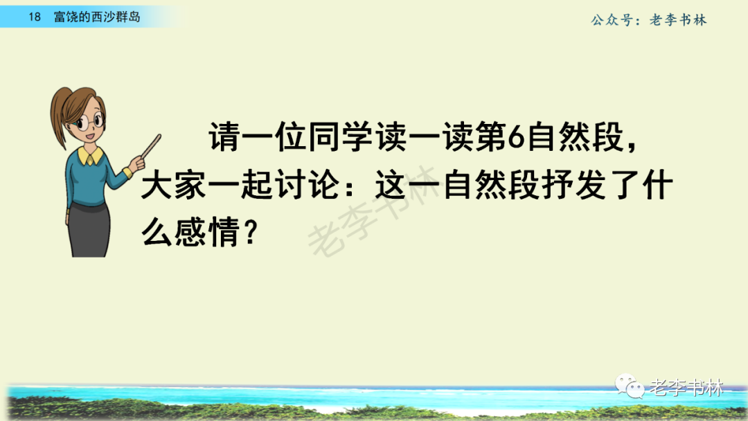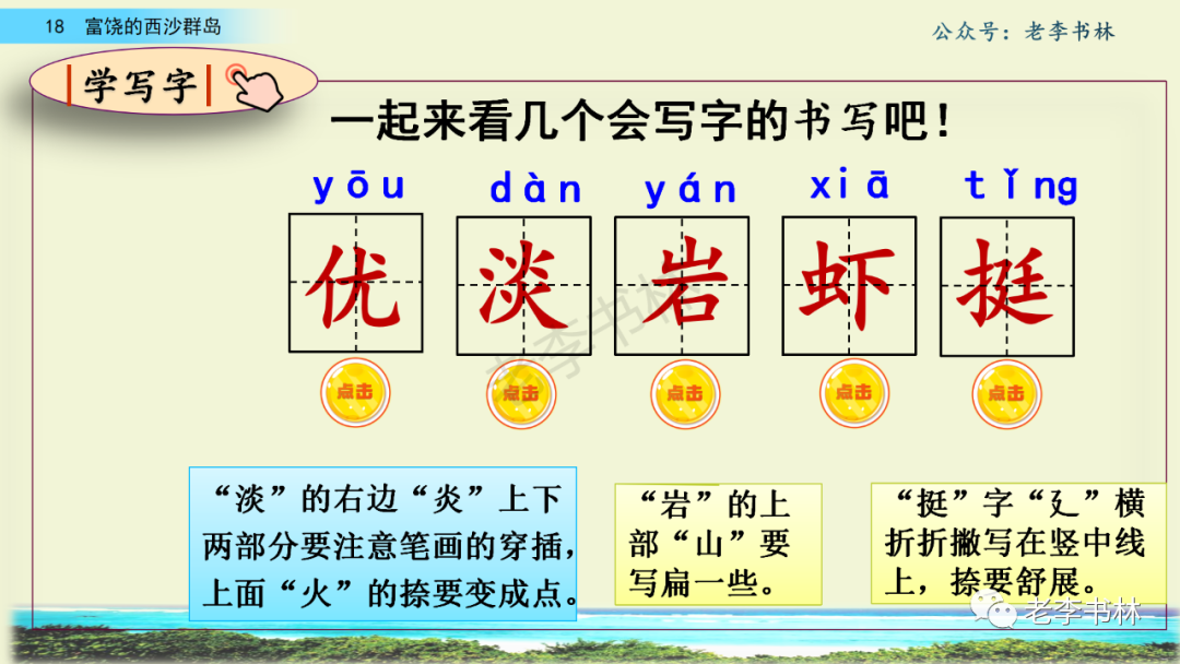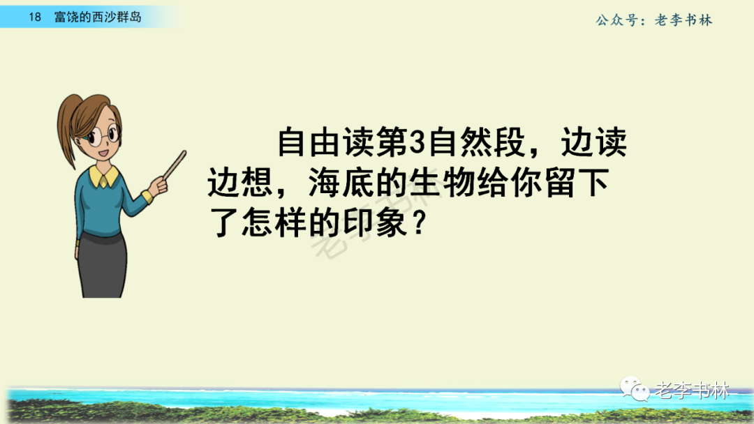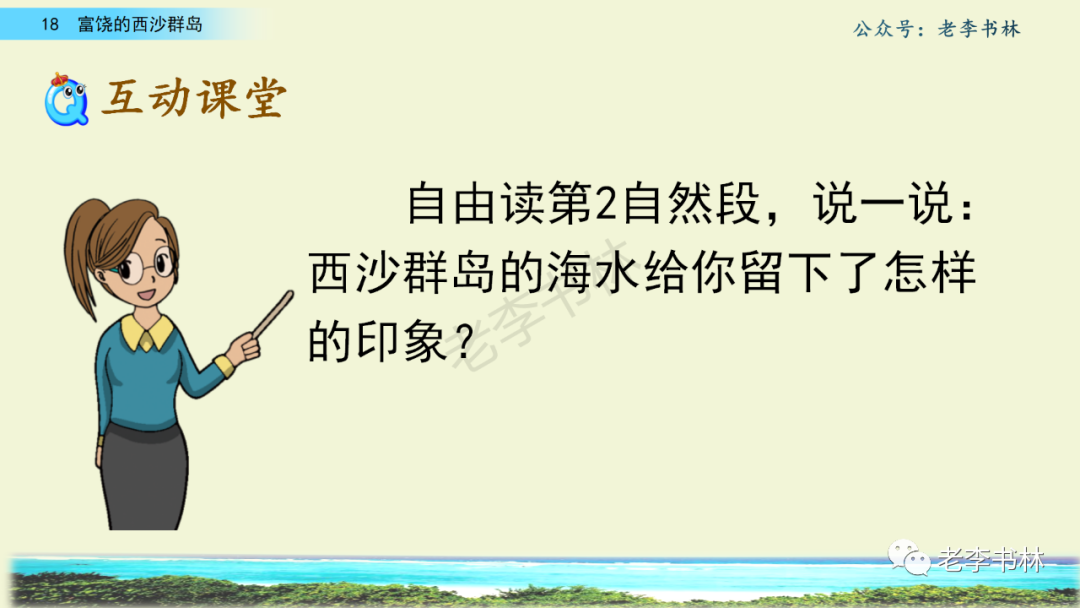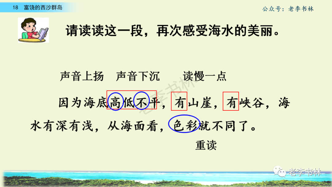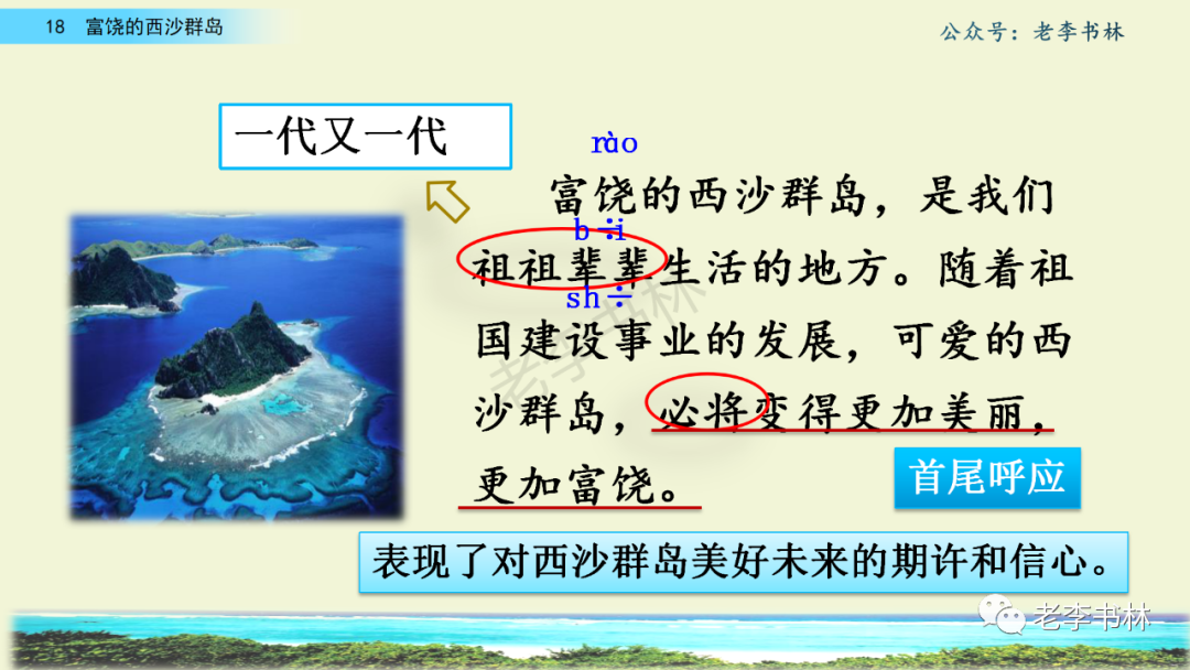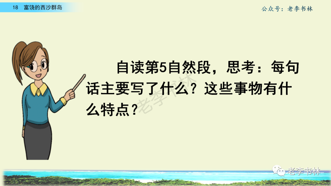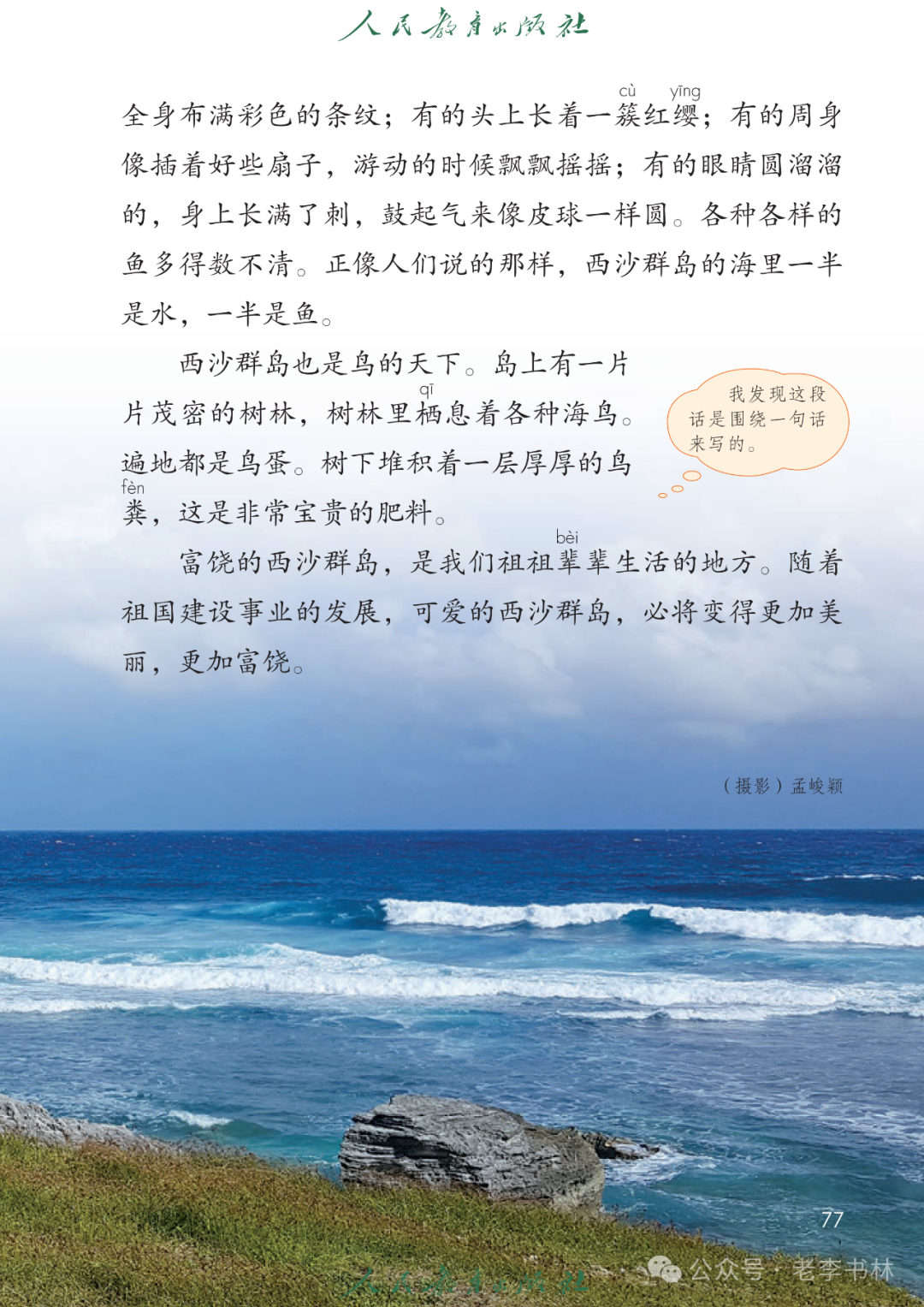 封面 电子教材 课文朗读 视频讲解 版本一 第1节 西沙群岛视频西沙群岛视频 第2节 版本二 第1节 第2节 版本三 第1课时 第2课时 知识点 01 我会写 富fù(富饶、富裕、丰富多彩) 优yōu(优美、优秀、优良) 浅qiǎn(浅绿、浅色、深浅) 错cuò(错乱、交错、错误) 岩yán(岩石、岩洞、花岗岩) 虾xiā(小虾、大龙虾、 虾米) 挺tǐng(挺威武、笔挺 、挺身而出) 鼓gǔ(鼓起、鼓掌、一鼓作气) 数shǔ(数不清、数数、不可胜数) 厚hòu(厚厚、厚重、宽厚) 宝bǎo(宝贵、宝石、珠光宝气) 贵guì(珍贵、宝贵、达官显贵) 02 我会认 饶ráo(富饶、饶裕、饶有兴趣) 瑰guī(瑰丽、瑰异、瑰宝) 参shēn(海参、人参、红参) 划huá(划船、划伤、划过来) 武wǔ(威武、英武、文武双全) 粪fèn(鸟粪、粪便、视如粪土) 辈bèi(祖辈、辈分、等闲之辈) 设shè(设计、建设、设身处地) 03 多音字 参shēn(海参)cān(参加) 数shǔ (数小棍)shù (数学) 04 近义词 瑰丽一一美丽 交错一一交叉 绽开一一绽放 威武一一威风 茂密一一茂盛 宝贵一一珍贵 五光十色一一五彩缤纷 各种各样一一各式各样 05 反义词 富饶一一贫瘠 丰富一一匮乏 绽开一一合拢 茂密一一稀疏 06 理解词语 瑰丽:异常美丽。 绽开:指植物的皮、壳等裂开,花儿开放。 蠕动:像蚯蚓爬行那样动。 茂密:(草木)茂盛而繁密。 栖息:停留;休息( 多指鸟类)。 富饶:物产多;财富多。 祖祖辈辈:世世代代。 07 句子解析 1.西沙群岛一带海水五光十色,瑰丽无比:有深蓝的,淡蓝的,浅绿的,杏黄的。一块块,一条条,相互交错着。 这一句描写了海水的各种颜色。“五光十色”指颜色多,“瑰丽”是颜色特别艳丽、好看。用“五光十色”和“瑰丽无比”说明海水的颜色很多,很漂亮。 2.海底的岩石上长着各种各样的珊瑚,有的像展开的花朵,有的像分枝的鹿角。 “各种各样”说明珊瑚的种类很多。绽开的花朵和分枝的鹿角是说海参的形状像花朵、像鹿角,这是一个比喻句。形象的写出了珊瑚的特点是:颜色鲜艳,样子奇特。 3.海参到处都是,在海底懒洋洋的蠕动。 “到处”一词写出了海参多,“懒洋洋”描绘出海参蠕动的样子,用词很准确,写出了海参的悠闲、自在。 4.有的全身布满彩色的文条;有的头上长一簇红缨;有的周身像插好多扇子,游动的时候飘飘遥遥;有的眼睛圆溜溜的,身上长满了刺,鼓起来像皮球一样圆。 运用排比和比喻的修辞方法,生动地描写了西沙群岛的海里各种鱼的外形特征。 08 问题归纳 1.读课文,想一想课文是围绕哪句话写的? 作者围绕“那里风景优美,物产丰富,是个可爱的地方。”这句话来写的。 2.作者是从哪几个方面来介绍西沙群岛的,把它圈出来。 课文按照由上到下、由近及远的顺序从海面、海底、海滩和岛上四方面具体写出西沙群岛的美丽富饶。 3.西沙群岛的海水为什么会有那么多的颜色,用“因为……,所以……”的句式回答。 因为海水的色彩和海底的地形有关。海底是山崖,海水浅,颜色就淡一些;海底是峡谷,海水深,颜色就深一些。所以从海面看,就呈现出不同的色彩。 4.作者在每个方面中都写到的是什么景物?是怎么写的? 作者描写海水是抓住颜色瑰丽来;写海底是抓住珊瑚、海参、大龙虾的形状和动作来写的和鱼的数量和形状来写的;写岛上是抓住鸟多来写的。作者每写一处都抓住了典型景物的特点进行描写。 5.这篇文章是按什么结构来写的? 这篇文章是按照“总一分一总”的结构来安排内容的。先总写西沙群岛的风景优美,物产丰富;再分写海水颜色瑰丽,以及珊瑚、海参、大龙虾、鱼和各种海鸟;最后总写西沙群岛必将变得更加美丽、富饶。这样写结构清晰,易于理解。 09 课文分段 第一部分(1):概括介绍西沙群岛的地理位置和特点。 第二部分(2-5):按照海面、海底、海岛的顺序具体介绍西沙群岛优美的风景和丰富的物产。 第三部分(6):写西山群岛必将变的更美丽,更加富饶。 10 课文主题 通过介绍了西沙群岛的地理位置和西沙群岛的美丽富饶,表达了作者对西沙群岛的喜爱之情。 11 教材课后习题答案 一、有感情的朗读课文。说说从哪些地方可以看出西沙群岛风景优美、物产丰富。 答案: 从第2自然段的描述中,可以感受到西沙群岛风景优美(西沙群岛一带海水五光十色,瑰丽无比:有深蓝的,淡青的,浅绿的,杏黄的。一块块,一条条,相互交错。)。 从3—5自然段的描述中,可以感受到西沙群岛物产丰富。(比如各种各样的珊瑚,海参到处都是,各种各样的鱼多得数不清,还有各种海鸟,是鸟的天下,遍地都是鸟蛋。) 二、选择你喜欢的部分,向别人介绍西沙群岛。 提示:本题要在熟读课文的基础上,按照课文的表达方式来写。 例:这里的鱼真多、真漂亮啊!有的全身布满彩色的条纹;有的眼睛圆溜溜的,身上长满了刺,鼓起气来像皮球一样圆;有的头上长着一簇红缨;有的周身像插着好些扇子,游动的时候飘飘摇摇。你看,还有的鱼像一片片黄色的叶子,又像一把把黄色的扇子,大大小小的,多得数也数不清。如果非要数,那恐怕要数上好几年呢! 三.西沙群岛的海里还有哪些美丽的景色?观察下面的图画,仿照课文第四自然段写一写。 海洋里的鱼儿们长得千奇百怪。有的身上长着各种花纹,真象美丽的珊瑚在海里移动;有的鱼儿像一个织布的梭子,在水里灵活的窜来窜去;还有的像一个个红色的小精灵,在你眼前闪一下就消失不见了!海洋里的鱼儿可真