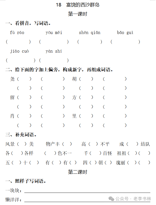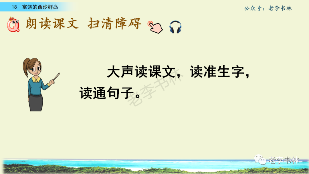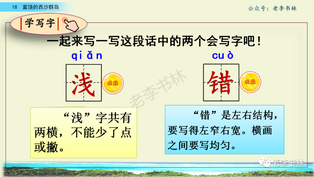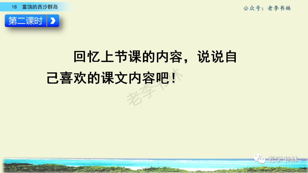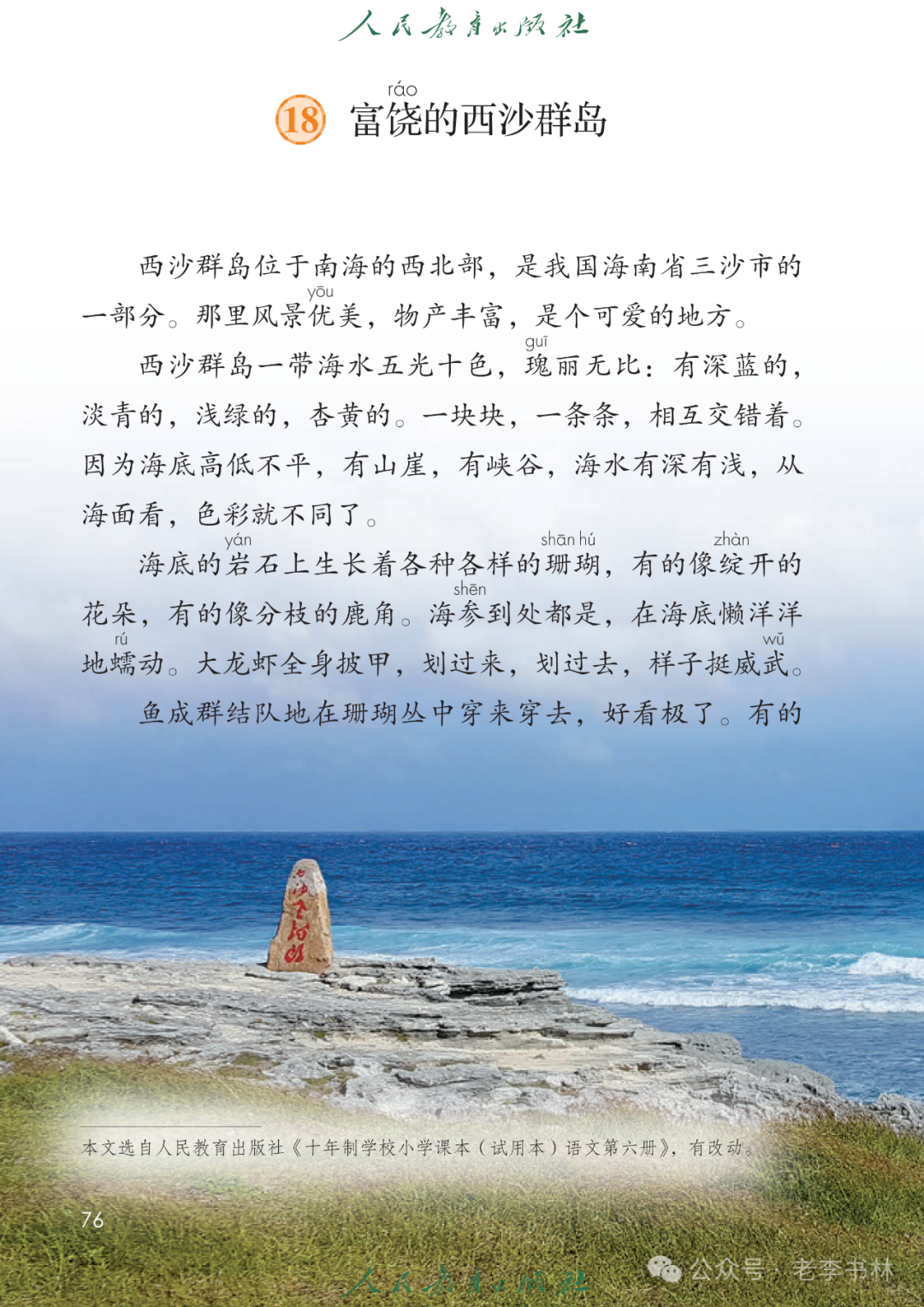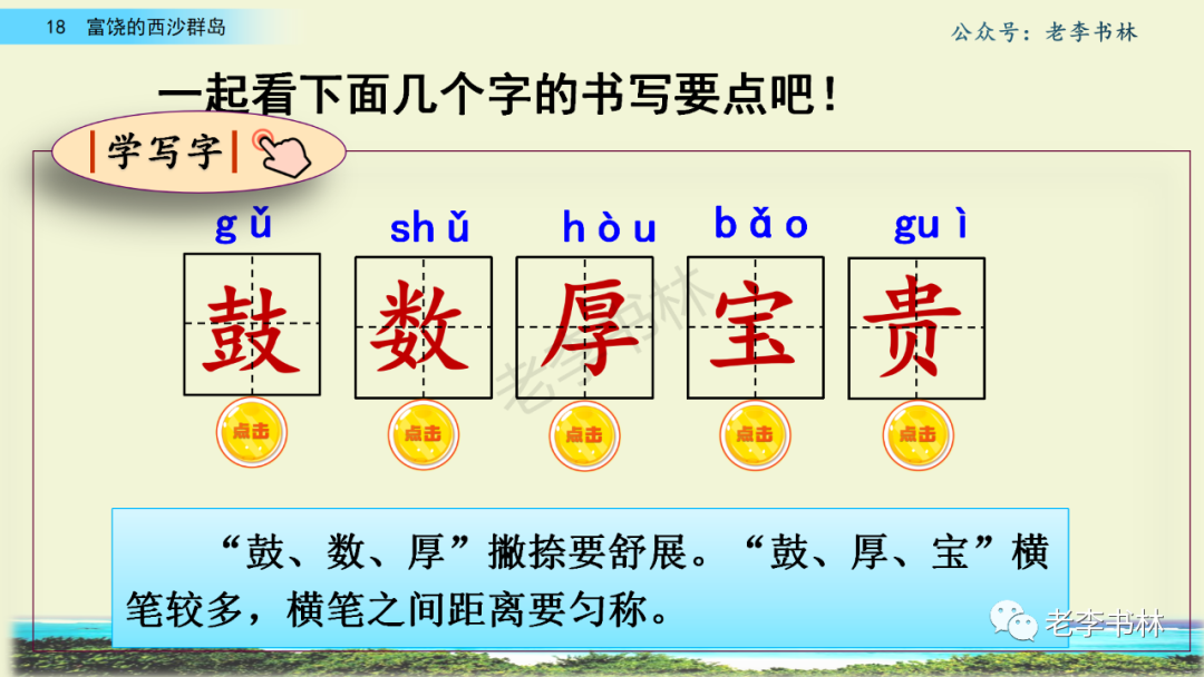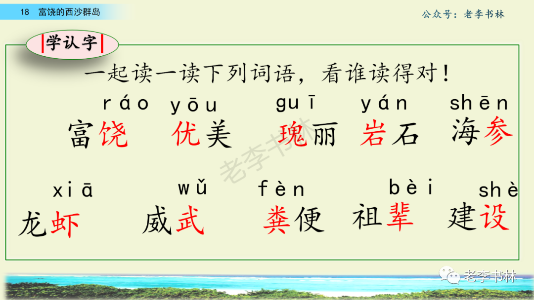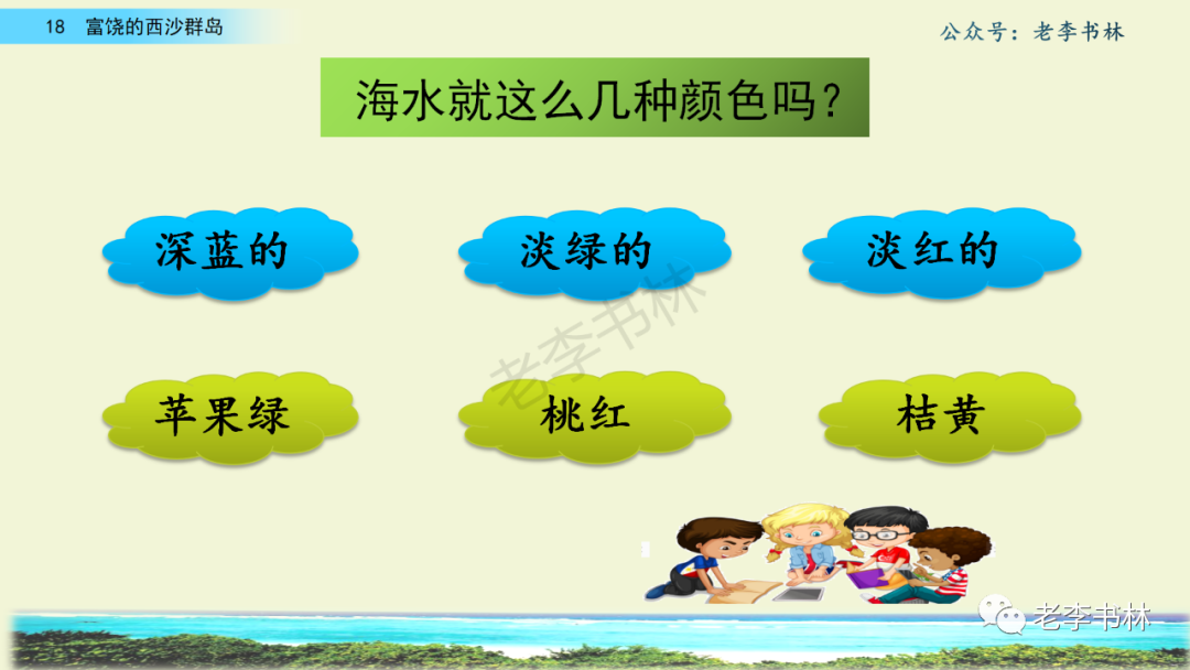 封面 电子教材 课文朗读 视频讲解 版本一 第1节 西沙群岛视频西沙群岛视频 第2节 版本二 第1节 第2节 版本三 第1课时 第2课时 知识点 01 我会写 富fù(富饶、富裕、丰富多彩) 优yōu(优美、优秀、优良) 浅qiǎn(浅绿、浅色、深浅) 错cuò(错乱、交错、错误) 岩yán(岩石、岩洞、花岗岩) 虾xiā(小虾、大龙虾、 虾米) 挺tǐng(挺威武、笔挺 、挺身而出) 鼓gǔ(鼓起、鼓掌、一鼓作气) 数shǔ(数不清、数数、不可胜数) 厚hòu(厚厚、厚重、宽厚) 宝bǎo(宝贵、宝石、珠光宝气) 贵guì(珍贵、宝贵、达官显贵) 02 我会认 饶ráo(富饶、饶裕、饶有兴趣) 瑰guī(瑰丽、瑰异、瑰宝) 参shēn(海参、人参、红参) 划huá(划船、划伤、划过来) 武wǔ(威武、英武、文武双全) 粪fèn(鸟粪、粪便、视如粪土) 辈bèi(祖辈、辈分、等闲之辈) 设shè(设计、建设、设身处地) 03 多音字 参shēn(海参)cān(参加) 数shǔ (数小棍)shù (数学) 04 近义词 瑰丽一一美丽 交错一一交叉 绽开一一绽放 威武一一威风 茂密一一茂盛 宝贵一一珍贵 五光十色一一五彩缤纷 各种各样一一各式各样 05 反义词 富饶一一贫瘠 丰富一一匮乏 绽开一一合拢 茂密一一稀疏 06 理解词语 瑰丽:异常美丽。 绽开:指植物的皮、壳等裂开,花儿开放。 蠕动:像蚯蚓爬行那样动。 茂密:(草木)茂盛而繁密。 栖息:停留;休息( 多指鸟类)。 富饶:物产多;财富多。 祖祖辈辈:世世代代。 07 句子解析 1.西沙群岛一带海水五光十色,瑰丽无比:有深蓝的,淡蓝的,浅绿的,杏黄的。一块块,一条条,相互交错着。 这一句描写了海水的各种颜色。“五光十色”指颜色多,“瑰丽”是颜色特别艳丽、好看。用“五光十色”和“瑰丽无比”说明海水的颜色很多,很漂亮。 2.海底的岩石上长着各种各样的珊瑚,有的像展开的花朵,有的像分枝的鹿角。 “各种各样”说明珊瑚的种类很多。绽开的花朵和分枝的鹿角是说海参的形状像花朵、像鹿角,这是一个比喻句。形象的写出了珊瑚的特点是:颜色鲜艳,样子奇特。 3.海参到处都是,在海底懒洋洋的蠕动。 “到处”一词写出了海参多,“懒洋洋”描绘出海参蠕动的样子,用词很准确,写出了海参的悠闲、自在。 4.有的全身布满彩色的文条;有的头上长一簇红缨;有的周身像插好多扇子,游动的时候飘飘遥遥;有的眼睛圆溜溜的,身上长满了刺,鼓起来像皮球一样圆。 运用排比和比喻的修辞方法,生动地描写了西沙群岛的海里各种鱼的外形特征。 08 问题归纳 1.读课文,想一想课文是围绕哪句话写的? 作者围绕“那里风景优美,物产丰富,是个可爱的地方。”这句话来写的。 2.作者是从哪几个方面来介绍西沙群岛的,把它圈出来。 课文按照由上到下、由近及远的顺序从海面、海底、海滩和岛上四方面具体写出西沙群岛的美丽富饶。 3.西沙群岛的海水为什么会有那么多的颜色,用“因为……,所以……”的句式回答。 因为海水的色彩和海底的地形有关。海底是山崖,海水浅,颜色就淡一些;海底是峡谷,海水深,颜色就深一些。所以从海面看,就呈现出不同的色彩。 4.作者在每个方面中都写到的是什么景物?是怎么写的? 作者描写海水是抓住颜色瑰丽来;写海底是抓住珊瑚、海参、大龙虾的形状和动作来写的和鱼的数量和形状来写的;写岛上是抓住鸟多来写的。作者每写一处都抓住了典型景物的特点进行描写。 5.这篇文章是按什么结构来写的? 这篇文章是按照“总一分一总”的结构来安排内容的。先总写西沙群岛的风景优美,物产丰富;再分写海水颜色瑰丽,以及珊瑚、海参、大龙虾、鱼和各种海鸟;最后总写西沙群岛必将变得更加美丽、富饶。这样写结构清晰,易于理解。 09 课文分段 第一部分(1):概括介绍西沙群岛的地理位置和特点。 第二部分(2-5):按照海面、海底、海岛的顺序具体介绍西沙群岛优美的风景和丰富的物产。 第三部分(6):写西山群岛必将变的更美丽,更加富饶。 10 课文主题 通过介绍了西沙群岛的地理位置和西沙群岛的美丽富饶,表达了作者对西沙群岛的喜爱之情。 11 教材课后习题答案 一、有感情的朗读课文。说说从哪些地方可以看出西沙群岛风景优美、物产丰富。 答案: 从第2自然段的描述中,可以感受到西沙群岛风景优美(西沙群岛一带海水五光十色,瑰丽无比:有深蓝的,淡青的,浅绿的,杏黄的。一块块,一条条,相互交错。)。 从3—5自然段的描述中,可以感受到西沙群岛物产丰富。(比如各种各样的珊瑚,海参到处都是,各种各样的鱼多得数不清,还有各种海鸟,是鸟的天下,遍地都是鸟蛋。) 二、选择你喜欢的部分,向别人介绍西沙群岛。 提示:本题要在熟读课文的基础上,按照课文的表达方式来写。 例:这里的鱼真多、真漂亮啊!有的全身布满彩色的条纹;有的眼睛圆溜溜的,身上长满了刺,鼓起气来像皮球一样圆;有的头上长着一簇红缨;有的周身像插着好些扇子,游动的时候飘飘摇摇。你看,还有的鱼像一片片黄色的叶子,又像一把把黄色的扇子,大大小小的,多得数也数不清。如果非要数,那恐怕要数上好几年呢! 三.西沙群岛的海里还有哪些美丽的景色?观察下面的图画,仿照课文第四自然段写一写。 海洋里的鱼儿们长得千奇百怪。有的身上长着各种花纹,真象美丽的珊瑚在海里移动;有的鱼儿像一个织布的梭子,在水里灵活的窜来窜去;还有的像一个个红色的小精灵,在你眼前闪一下就消失不见了!海洋里的鱼儿可真