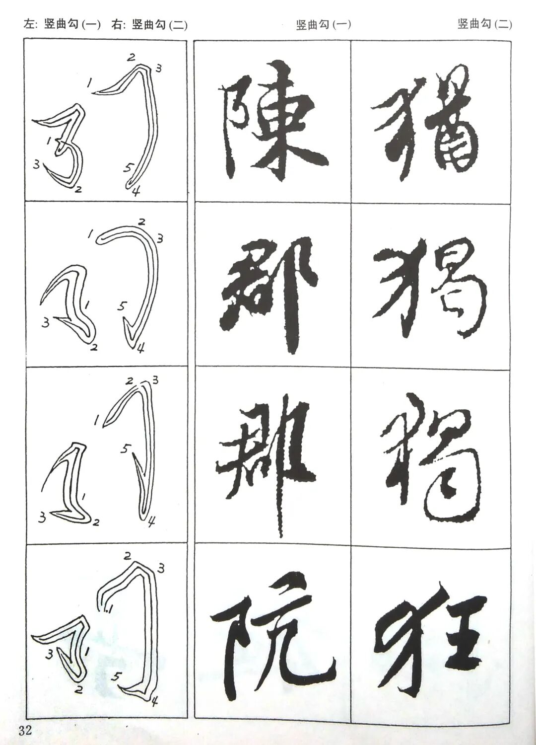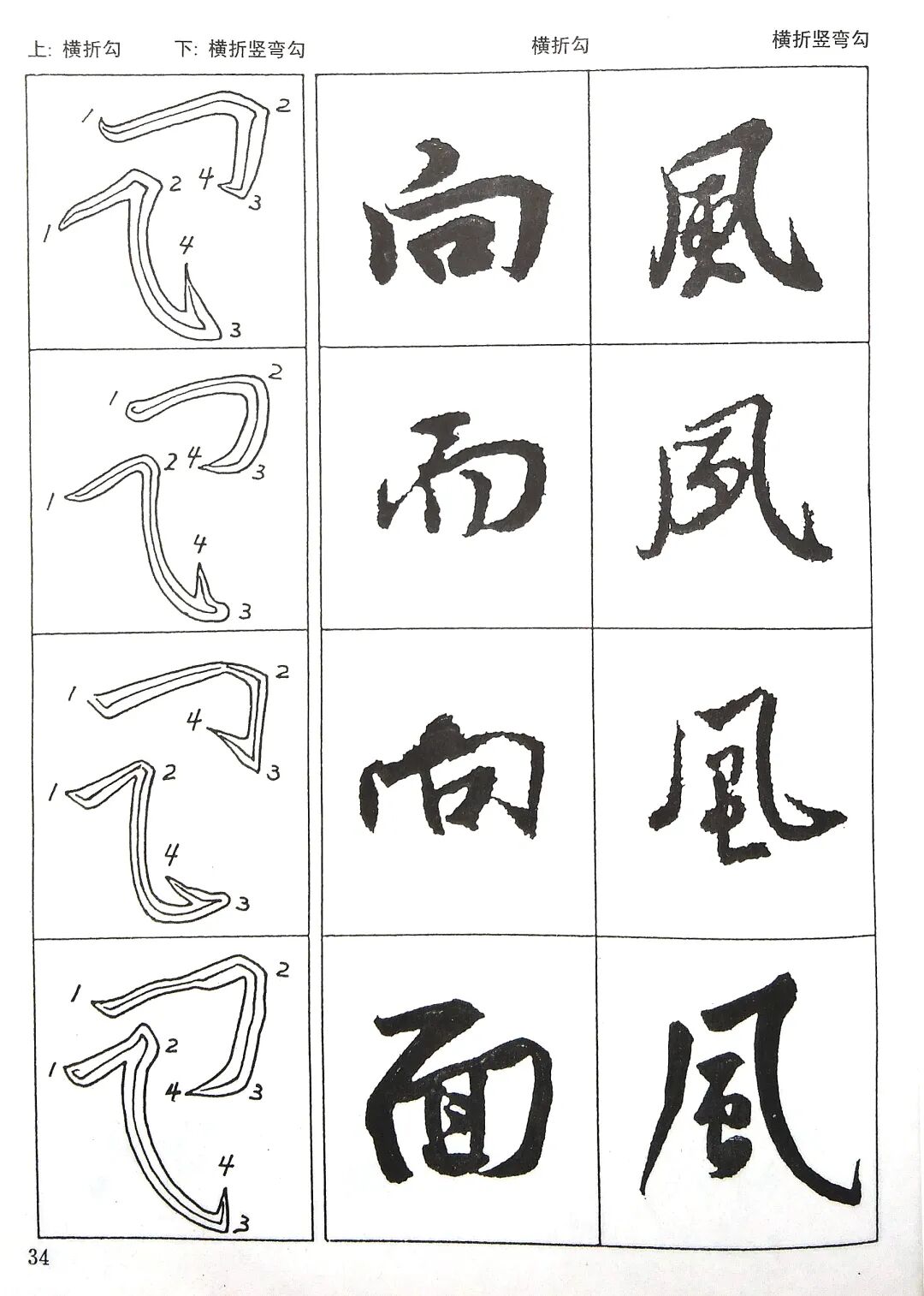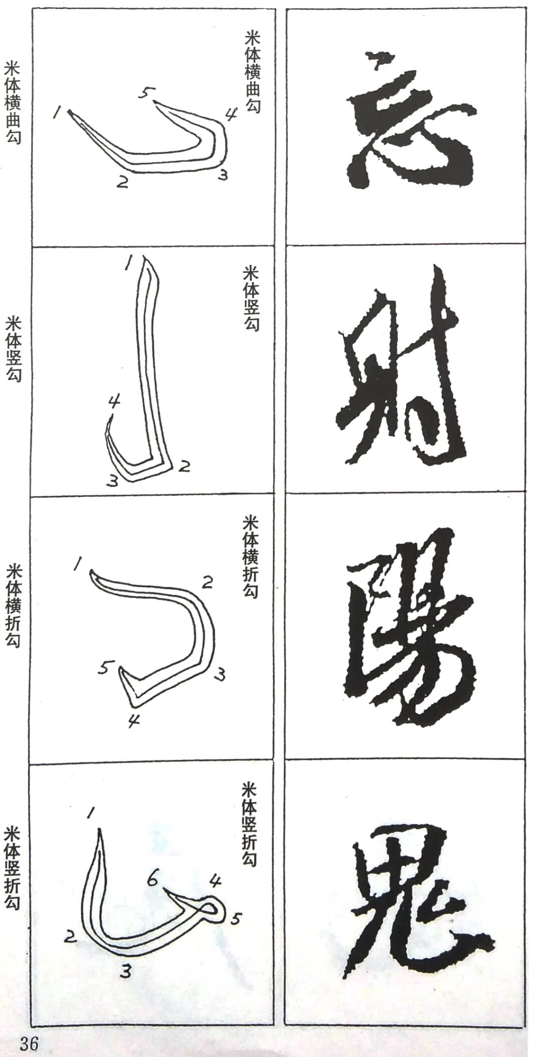 竖折勾 行书的勾其种类和楷书也大致相同,但行书的勾有时可以省改为回锋无勾。 一、横曲勾心下之勾即为横曲勾。 笔法: 1·露锋起笔人纸; 1→2向右下中锋弧行,渐行渐按; 2→3按笔后折笔侧锋向左上提笔 说明:黄体弧行时曲中有折,米体另有蟹爪勾(见本节末)。 二、横勾先横后勾即为横勾。 笔法: 出锋。 1→2同横法; 2→3向右上略提笔后即向右下按,笔(颜体直接转笔下按,米体则近乎断笔 后下按); 3→4转笔侧锋向左下提笔出锋(米体则先向左下运行后再向左上勾出,形同蟹爪勾)。 三、竖勾先竖后勾,即为竖勾。 行书竖勾既可以是楷书竖勾的快写,还可变形为回锋竖无勾(见第四章“木"部)。 竖勾(一) 笔法: 1→2同竖法; 2→3向下按笔(颜体转笔向左下按笔,米体则常向右下按笔); 3→4折笔侧锋向左上提笔出锋。 竖勾(二) 笔法: 1→2同竖法; 2→3稍按笔后转笔(黄体常转中有折)向左下乘势提笔出锋。 说明:米体勾出前运笔作曲线行,别具特色。 四、竖曲勾,先竖曲后勾即为竖曲 竖曲勾(一) 笔法: 1.承接上笔横折撇(或另起一笔露锋人纸,如王体)。 1→2向下中锋弧行; 2→3按笔后转笔侧锋向左上提笔出锋。 说明:注意各体“2"处的不同,王体角度较大,米、颜角度极小,黄体则近乎向上方勾出。 竖曲勾(二) 1.露锋或藏锋起笔(或承接上笔撇勾连画,如黄体); 笔法: 1→2向右或右上中锋弧行; 2→3按笔; 3→4转笔(或折笔)侧锋向下中锋弧行; 4→5按笔后转笔(或折笔)侧锋向左上提笔出锋(王体按笔后向左回锋而无勾)。 说明:注意各体按笔处“3"有所不同,转折处王、黄折笔,颜、米则转笔中略有折意。米体的勾极陡,王体则无勾回锋收笔。 五、斜勾先斜后勾,即为斜勾。 行书的斜勾可以是楷书斜勾的快写。也可变形力向右上回锋无勾。 斜勾(一) 笔法: 1→2同竖头起笔, 2→3按笔后略提,折笔(或转笔)侧锋向右下中锋弧行; 3→4按笔后折笔(或转笔)侧锋向上提笔出锋勾出。 说明:转折处王、黄多取折势,有转有折,米体甩转笔,且勾处常极陡。 斜勾(二) 笔法: 1→2同竖头起笔; 2→3按笔后略提,转笔(或0折笔)侧锋向右下“方中锋弧行。 3→4转笔向右上略提回锋后即收笔。 说明:米体横折勾一般不用蟹爪勾。 3→4同竖勾。 六、横折勾先横折后勾,即为横折勾。 笔法: 1→2→3同横折(米体低横折常在A处若断若连,多出一折,形成三节折); 3→4同竖勾。 七、横折竖弯勾,先横折后竖弯勾,即为横折竖弯勾。 笔法: 1→2同横法; 2→3按笔后略提转笔(或折笔)侧锋向下中锋弧行; 3→4向右按笔后转笔(或折笔)侧锋向上提笔出锋勾出。 说明:米体2→3则向下再转笔向右中锋弧行;与众不同。 八、竖折勾先竖折后勾即为竖折勾。 竖折勾中,折处往往不折而圆曲,勾处亦可无勾。 竖折勾(一) 笔法: 1→2→3同竖法; 3→4转笔(也可略有折意)向右中锋弧行; 4→5向右按笔后转笔(或折笔)侧锋向上提笔出锋勾出。 竖折勾(二) 笔法: 1·起笔同竖法(米体用上尖竖); 1→2向下或右下中锋弧行; 2→3在“2"处转笔(米体略有折意)向右中锋弧行;至“3"处渐提笔出锋(王体在^处稍按笔后再提笔出锋)。 九、米体特有的三节折和蟹爪勾米芾笔法变化多端,其中尤以三节折和蟹爪勾闻名于世。 所谓三节折,即在折处比一般写法多一个折角,如本节中的“向"字;本章第六节中的“顾"字蟹爪勾则是一般在三节折 后再加一个勾,如本节中的“客"字,此外,米芾还常将其它非折、勾的笔画转化成蟹爪勾,如本章第八 节中的“湖"字;第四章“四体同字"的“诸"字等。 本页再例举米芾特有的蟹爪勾,以供练习和对照。 米体横曲勾(蟹爪式) 笔法: 1.露锋人纸, 1→2向中下中锋弧行渐行渐按; 2→3略驻笔(即笔稍停一下)后转笔向右中锋弧行; 3→4向右按笔后,转笔(转中有折),侧锋向上, 4→5在4处略驻笔后,转笔侧锋向左上提笔出锋勾出。 米体竖勾(蟹爪式) 笔法: 1→2同竖法; 2→3向右下按笔后,折笔侧锋向左(偏下); 3→4在3处略驻笔后,折笔侧锋向上,取弧势渐提笔出锋。 米体横折勾(蟹爪式) 1→2同横法,但稍向右下斜; 2→3在2处稍驻笔后,转笔侧锋向下中锋弧行, 3→4在3处稍驻笔后折笔向左下中锋弧行, 4→5略一按笔后折笔侧锋向左上提笔出锋。 米体竖折勾 笔法: 1→2同上尖竖法; 2→3转笔向右下弧行; 3→4在3处略驻笔后,转笔(略具折意)侧锋向右上中锋弧行, 4→5转笔向右下按笔, 5→6转笔侧锋向左上提笔出锋。 说明:此竖折勾虽非蟹爪式,然其勾处的笔路与众不同,故亦为米体特有。![]()