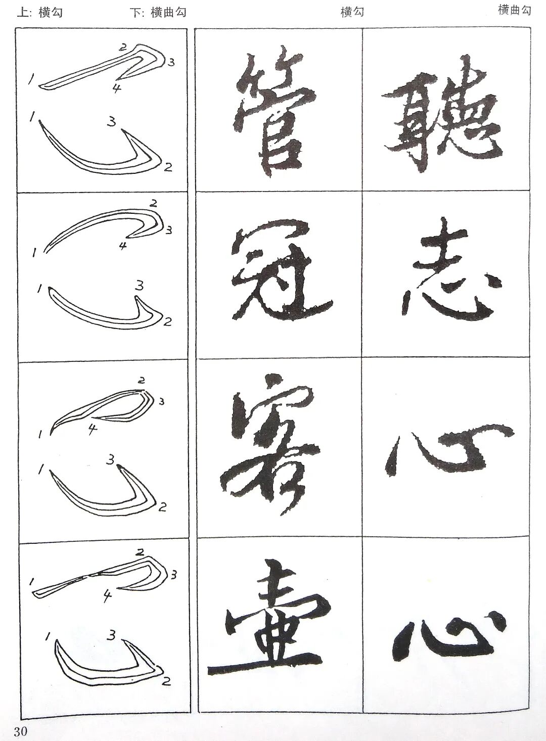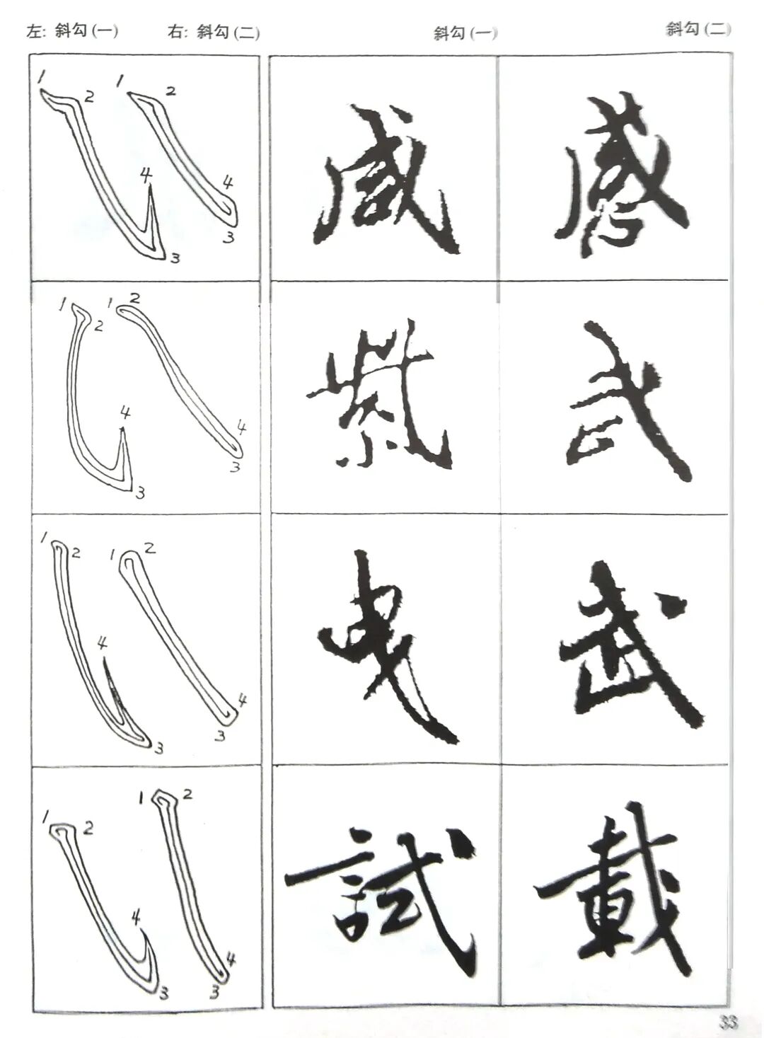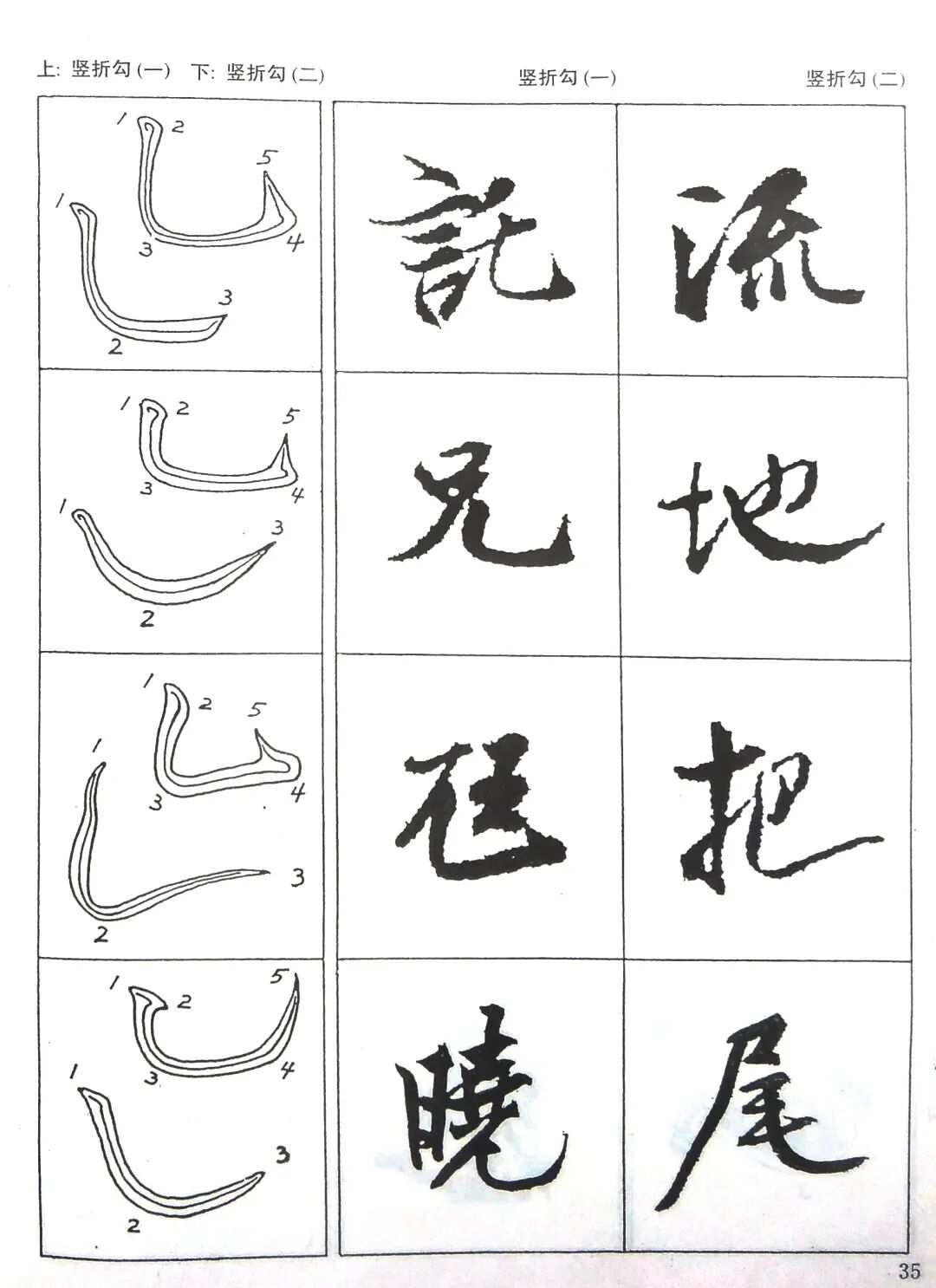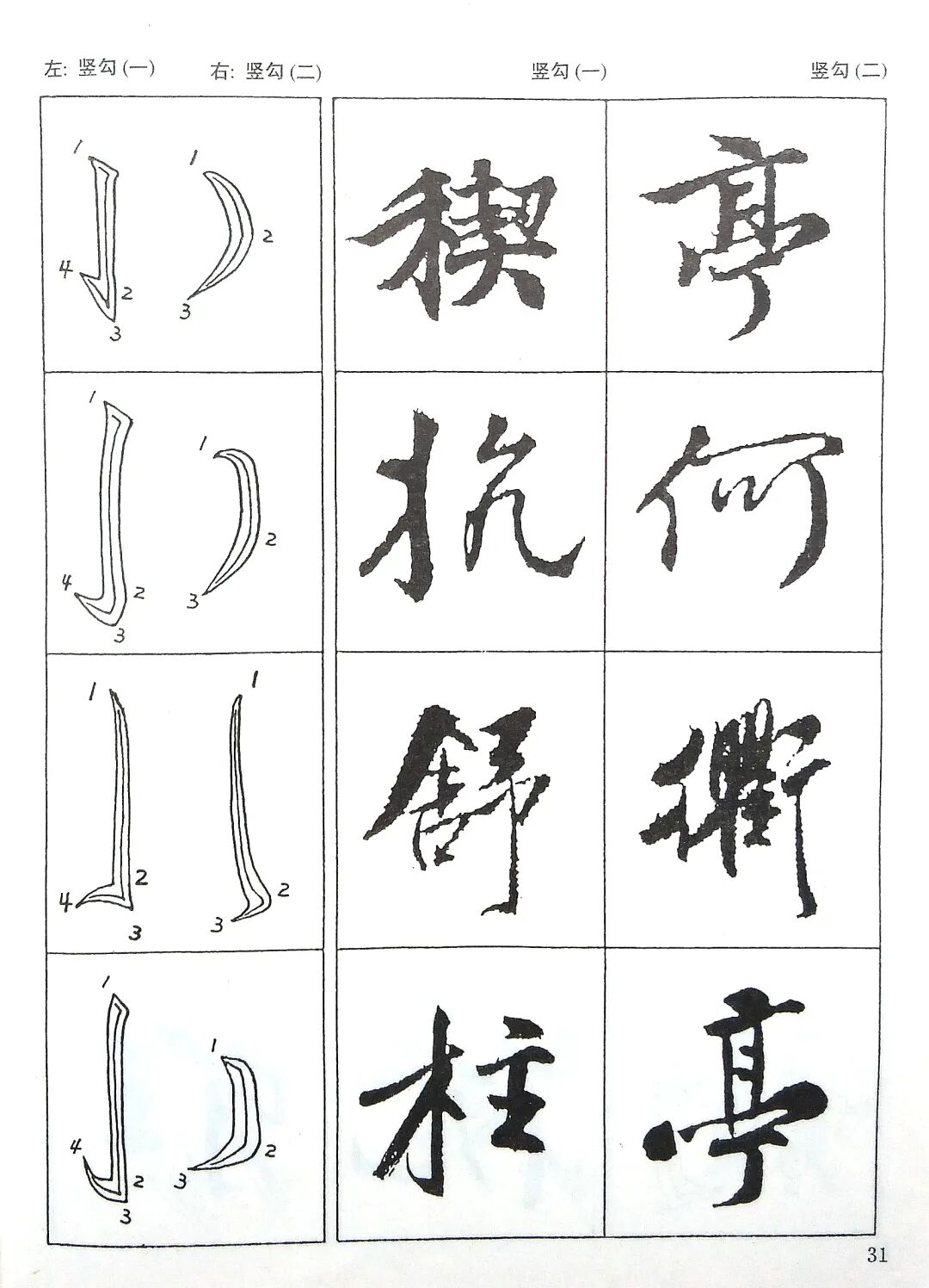 竖折勾 行书的勾其种类和楷书也大致相同,但行书的勾有时可以省改为回锋无勾。 一、横曲勾心下之勾即为横曲勾。 笔法: 1·露锋起笔人纸; 1→2向右下中锋弧行,渐行渐按; 2→3按笔后折笔侧锋向左上提笔 说明:黄体弧行时曲中有折,米体另有蟹爪勾(见本节末)。 二、横勾先横后勾即为横勾。 笔法: 出锋。 1→2同横法; 2→3向右上略提笔后即向右下按,笔(颜体直接转笔下按,米体则近乎断笔 后下按); 3→4转笔侧锋向左下提笔出锋(米体则先向左下运行后再向左上勾出,形同蟹爪勾)。 三、竖勾先竖后勾,即为竖勾。 行书竖勾既可以是楷书竖勾的快写,还可变形为回锋竖无勾(见第四章“木"部)。 竖勾(一) 笔法: 1→2同竖法; 2→3向下按笔(颜体转笔向左下按笔,米体则常向右下按笔); 3→4折笔侧锋向左上提笔出锋。 竖勾(二) 笔法: 1→2同竖法; 2→3稍按笔后转笔(黄体常转中有折)向左下乘势提笔出锋。 说明:米体勾出前运笔作曲线行,别具特色。 四、竖曲勾,先竖曲后勾即为竖曲 竖曲勾(一) 笔法: 1.承接上笔横折撇(或另起一笔露锋人纸,如王体)。 1→2向下中锋弧行; 2→3按笔后转笔侧锋向左上提笔出锋。 说明:注意各体“2"处的不同,王体角度较大,米、颜角度极小,黄体则近乎向上方勾出。 竖曲勾(二) 1.露锋或藏锋起笔(或承接上笔撇勾连画,如黄体); 笔法: 1→2向右或右上中锋弧行; 2→3按笔; 3→4转笔(或折笔)侧锋向下中锋弧行; 4→5按笔后转笔(或折笔)侧锋向左上提笔出锋(王体按笔后向左回锋而无勾)。 说明:注意各体按笔处“3"有所不同,转折处王、黄折笔,颜、米则转笔中略有折意。米体的勾极陡,王体则无勾回锋收笔。 五、斜勾先斜后勾,即为斜勾。 行书的斜勾可以是楷书斜勾的快写。也可变形力向右上回锋无勾。 斜勾(一) 笔法: 1→2同竖头起笔, 2→3按笔后略提,折笔(或转笔)侧锋向右下中锋弧行; 3→4按笔后折笔(或转笔)侧锋向上提笔出锋勾出。 说明:转折处王、黄多取折势,有转有折,米体甩转笔,且勾处常极陡。 斜勾(二) 笔法: 1→2同竖头起笔; 2→3按笔后略提,转笔(或0折笔)侧锋向右下“方中锋弧行。 3→4转笔向右上略提回锋后即收笔。 说明:米体横折勾一般不用蟹爪勾。 3→4同竖勾。 六、横折勾先横折后勾,即为横折勾。 笔法: 1→2→3同横折(米体低横折常在A处若断若连,多出一折,形成三节折); 3→4同竖勾。 七、横折竖弯勾,先横折后竖弯勾,即为横折竖弯勾。 笔法: 1→2同横法; 2→3按笔后略提转笔(或折笔)侧锋向下中锋弧行; 3→4向右按笔后转笔(或折笔)侧锋向上提笔出锋勾出。 说明:米体2→3则向下再转笔向右中锋弧行;与众不同。 八、竖折勾先竖折后勾即为竖折勾。 竖折勾中,折处往往不折而圆曲,勾处亦可无勾。 竖折勾(一) 笔法: 1→2→3同竖法; 3→4转笔(也可略有折意)向右中锋弧行; 4→5向右按笔后转笔(或折笔)侧锋向上提笔出锋勾出。 竖折勾(二) 笔法: 1·起笔同竖法(米体用上尖竖); 1→2向下或右下中锋弧行; 2→3在“2"处转笔(米体略有折意)向右中锋弧行;至“3"处渐提笔出锋(王体在^处稍按笔后再提笔出锋)。 九、米体特有的三节折和蟹爪勾米芾笔法变化多端,其中尤以三节折和蟹爪勾闻名于世。 所谓三节折,即在折处比一般写法多一个折角,如本节中的“向"字;本章第六节中的“顾"字蟹爪勾则是一般在三节折 后再加一个勾,如本节中的“客"字,此外,米芾还常将其它非折、勾的笔画转化成蟹爪勾,如本章第八 节中的“湖"字;第四章“四体同字"的“诸"字等。 本页再例举米芾特有的蟹爪勾,以供练习和对照。 米体横曲勾(蟹爪式) 笔法: 1.露锋人纸, 1→2向中下中锋弧行渐行渐按; 2→3略驻笔(即笔稍停一下)后转笔向右中锋弧行; 3→4向右按笔后,转笔(转中有折),侧锋向上, 4→5在4处略驻笔后,转笔侧锋向左上提笔出锋勾出。 米体竖勾(蟹爪式) 笔法: 1→2同竖法; 2→3向右下按笔后,折笔侧锋向左(偏下); 3→4在3处略驻笔后,折笔侧锋向上,取弧势渐提笔出锋。 米体横折勾(蟹爪式) 1→2同横法,但稍向右下斜; 2→3在2处稍驻笔后,转笔侧锋向下中锋弧行, 3→4在3处稍驻笔后折笔向左下中锋弧行, 4→5略一按笔后折笔侧锋向左上提笔出锋。 米体竖折勾 笔法: 1→2同上尖竖法; 2→3转笔向右下弧行; 3→4在3处略驻笔后,转笔(略具折意)侧锋向右上中锋弧行, 4→5转笔向右下按笔, 5→6转笔侧锋向左上提笔出锋。 说明:此竖折勾虽非蟹爪式,然其勾处的笔路与众不同,故亦为米体特有。![]()