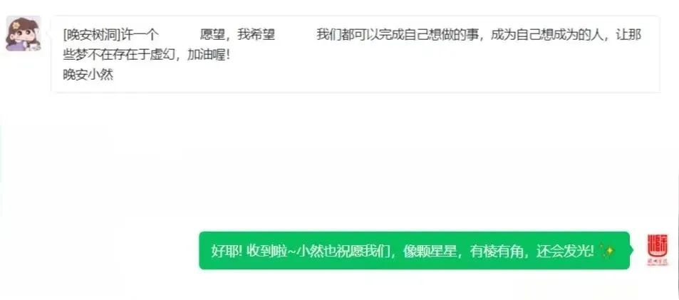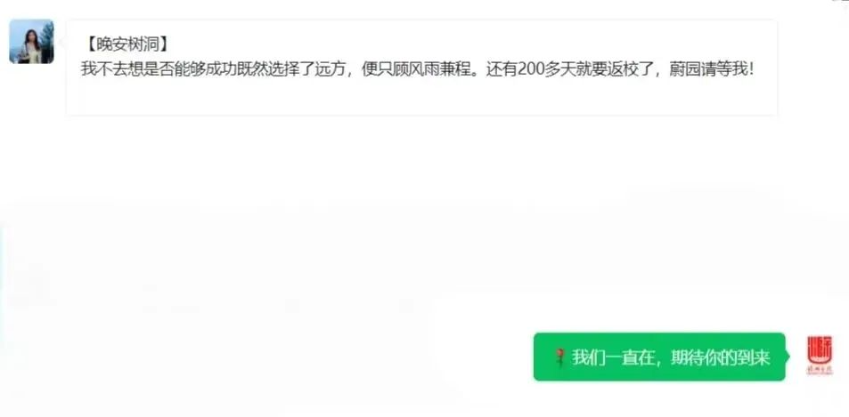??? 夜幕低垂 星语心愿 树洞深处 心灵归宿 在这里 每一句话都被温柔以待 每一颗心都能找到共鸣的岸 晚安 不仅是句告别 更是明天希望的序章 树洞等你 倾听你的故事 用温暖的记录 驱散冬天的寒意 迎接更好的2025 晚安计划 晚安计划 ???? 繁星点点 树洞深邃 愿每晚的晚安 都是心灵的慰藉 晚安树洞 晚安计划 你我共同的秘密花园 在这里 每一颗心都能找到 属于自己的安宁与力量 选择你想让收到短信的他/她——父母、家人、老师、恋人、朋友等。编辑好内容,备注联系方式(可匿名)。我们都将会进行发送,把你的“晚安”送至他/她的枕边。 点击回顾晚安计划 12月25日至31日 扫描下方二维码 填写报名信息 即可参与晚安计划 ~树洞给你回应心里的答案~ 在微信后台留下你想说的话(可匿名),分享你的快乐,讲述你的心事,传递你的祝福。在这里你的每一词、每一句都将有回应。我们为你排忧解难,或与你共享喜悦。 凡参与“晚安计划”活动,所有的温柔与美好的内容,我们都会在明年初精选展现。其中,可以选择匿名,涉及隐私的部分我们会进行处理,如有特殊要求,可以提前说明。 让我们走进”晚安计划” 用文字编织美梦 在即将到来的2025年 小然祝你平安喜乐 顺遂无忧 往期精彩回顾: 我校6项成果在省社科界第十九届年会征文中获奖 滁州学院道德模范事迹展播 蔚读 | 最难的自律,是不断突破自己! 冬至福至,一定上岸! 本期实习编辑:吴明徽 郑雯鑫 本期编辑:邹文豪 责任编辑:饶子怡 审核:陈沭文 审签:马报 备注:平台部分文章内容、图片或视频来源于网络,版权归原作者所有。本平台仅供学习交流用。如有侵权,请联系删除。![]()