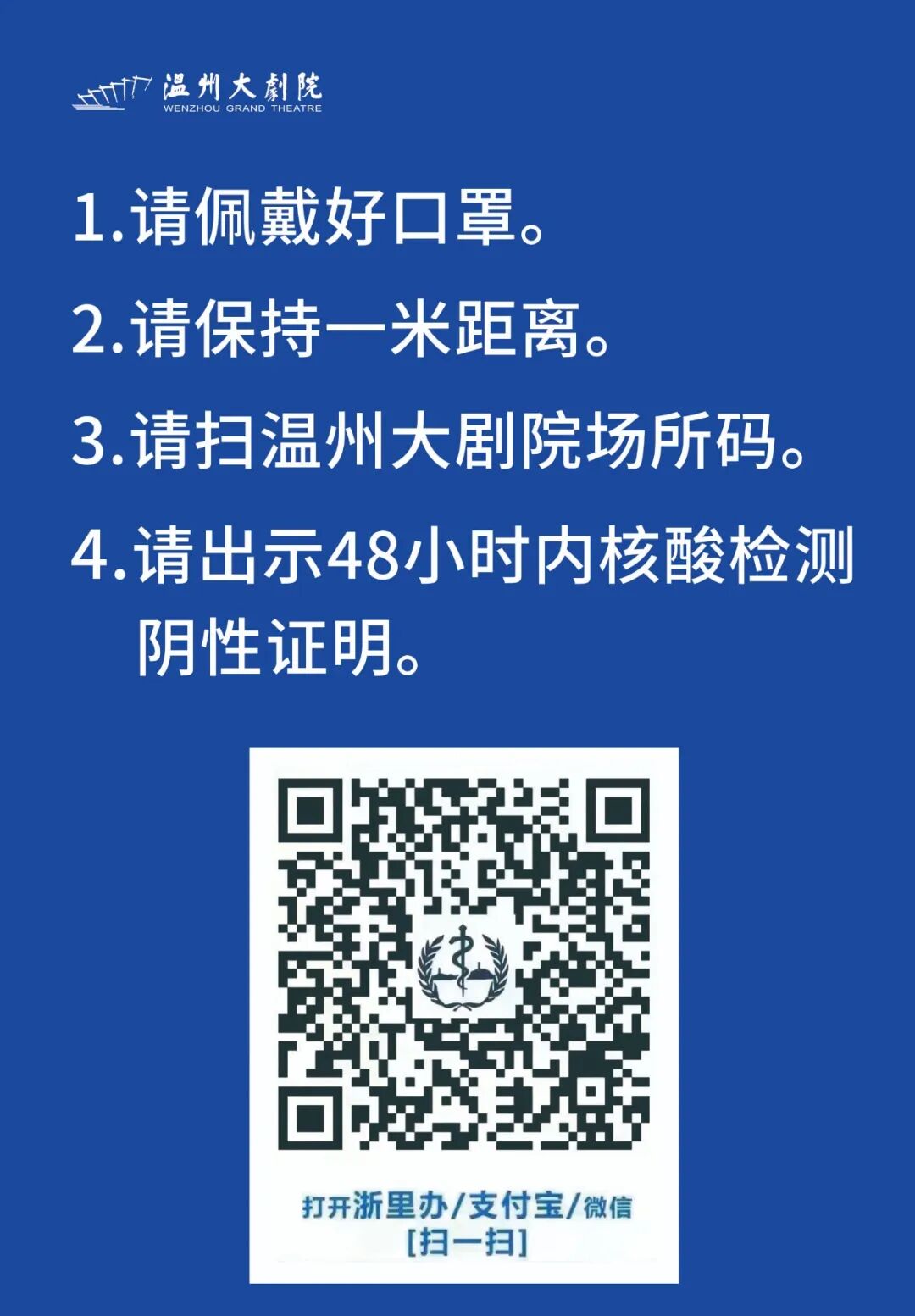 3.进入剧院,请扫“温州大剧院场所码”并主动出示“温州防疫码”,请观众提早取票,配合做好相关查验及登记工作。