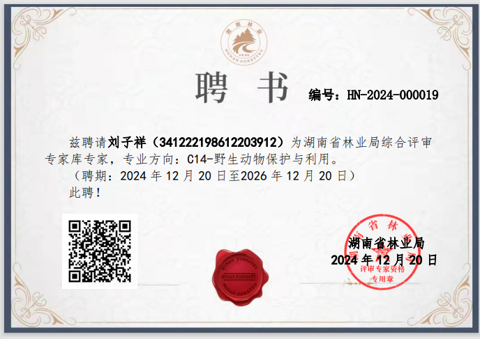 刘子祥,男,汉族,安徽太和人,2014年9月参加工作,湖南师范大学生命科学学院动物学专业毕业,全日制研究生学历,硕士学位,高级工程师。现任公司林业规划院规划设计部主任工程师。中国野生动物保护协会会员,安徽省珍稀鸟类保护工作者联合会理事,湖南省动物学会会员。湖南省林业局综合评审专家库专家和长沙市林业科技人才(专家)库专家。主要从事野生动物保护与利用、自然保护区和自然公园等领域的工程咨询、规划设计、调查监测、生态影响评价的工作。