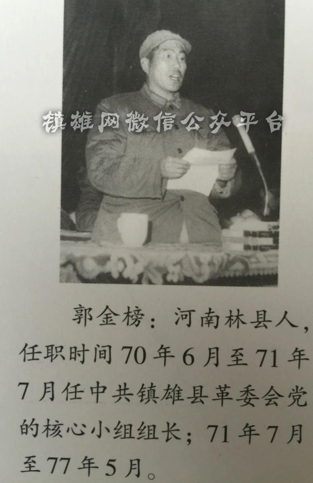 郭金榜:河南林县人,1970年6月至1971年7月任中共镇雄县革委会党的核心小组组长,1971年7月至1977年5月任书记。