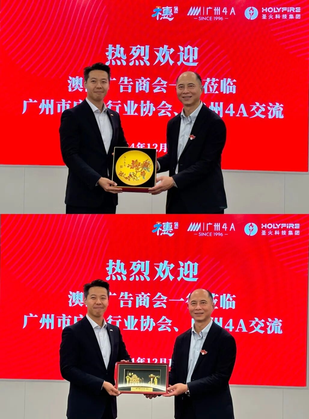 2024年12月13日,为深化穗澳合作交流、共促湾区协同发展,澳门广告商会一行在劳锦辉理事长、钟静仪副主席、黄少焜监事长的带领下,到广州市广告行业协会(以下简称“穗广协”)、广州4A,并与圣火科技集团、KIWI互动交流。 穗广协党支部第一书记、会长钟敏雄,穗广协副会长兼广州4A主席、圣火科技集团董事长钟坚,穗广协副会长兼大创会主席、圣达集团董事长杨垲思,穗广协秘书长常雅静,广州4A秘书长何榆一行在穗广协副会长、广州4A主席单位圣火科技集团热情接待澳门广告商会考察团,双方就推动粤港澳大湾区广告行业的协同发展开展交流。 钟敏雄会长在会上介绍了穗广协的整体情况,紧密结合当前广告行业的发展背景,他详细讲述了协会现有的组织架构、多元化的会员企业构成,并提到穗广协在推动广州市广告行业自律、促进广告产业创新升级、拓展业内广告交流合作等领域所发挥的积极作用与突出贡献。 钟坚主席在会中针对广州4A的发展历程、战略目标以及旗下会员的基本情况进行了详尽的介绍,不仅展示了广州4A在广告行业中的领先地位,还强调了会员单位的多样性和创新能力。圣火科技集团董事会秘书王欢也针对广州4A主席单位圣火科技集团的发展概况做了详细介绍。 杨垲思副会长向澳门广告商会一行介绍了穗广协大创会是立足湾区进行发展的,希望未来大创会的大学生品牌赛事能与澳门有更加紧密的合作,共同打造一个跨越区域、促进青年创意人才成长的高端平台。 澳门广告商会理事长劳锦辉、澳门广告商会会员大会副主席钟静仪在会上首先对澳门广告商会的发展情况展开详细介绍。劳锦辉理事长特别介绍澳门落实中央部署“一中心、一平台、一基地”建设目标的背景,希望未来穗澳两地能充分利用好澳门独特的区域优势,加强交流,探讨拓展广告业务国际版图;同时期待双方能进一步共享业界新趋势、创新经验及市场资源,发掘更多合作机会。 交流会现场 2024年是落实国家十四五规划的压轴之年,是澳门回归的二十五周年,同时也是粤港澳大湾区发展规划纲要发布的五周年。会上,为深化穗澳两地合作交流,穗广协与澳门广告商会进行了穗澳两地纪念品互赠仪式,寓意穗澳两地行业组织友谊长存、团结奋进,为今后实现合作关系奠定坚实基础。未来,穗澳两地将携手共促湾区行业协同、融合发展。 互赠仪式 与KIWI互动深度交流 澳门广告商会考察团到KIWI互动,与实效营销中的具有代表性的企业进行交流,了解广告业态新变化。KIWI互动创始人兼CEO李伟斌先生热情欢迎并接待澳门广告商会一行,常雅静秘书长陪同交流。 交流会上,常雅静秘书长介绍到澳门广告商会此行目的是与大湾区内优秀广告企业深度交流,探讨行业趋势。同时提到了KIWI互动在实效营销中的卓越表现,期待此次交流能加深双方了解,促进合作,共同推进粤港澳大湾区广告业的创新发展。 李伟斌先生详细地介绍了KIWI互动践行技术+创意双核驱动的营销理念为品牌提供“品效合一”的服务。双方针对具体的品牌案例实操效果展开交流,并提出未来穗澳两地企业应通过资源共享和优势互补,共同探索广告营销的新模式。 未来,穗广协与澳门广告商会将加强交流合作,建立长效沟通机制,推动理念创新、技术进步与市场拓展的协同发展。同时,穗澳两地广告企业将把握机遇,通过资源联动、项目合作等方式,为穗澳两地交流合作注入新活力,共促湾区广告业的高质量发展。 交流风采 圣火科技集团 圣火科技集团(股票代码:839953)成立于2013年,作为业内独树一帜的品效销全链路结合的践行者,致力于为企业集团提供战略咨询、数字化营销、品牌传播、元宇宙营销等整合服务。集团总部位于广州市,在全国13个城市设有大数据生产及数据采集基地,形成智慧数字产业群的综合服务机构,多地联动、多方位、多角度服务全球知名企业的个性化需求,深度服务五百强企业数十家。 旗下一物一码新零售消费大数据平台,以精准的用户数据收集,为零售企业解决产品的防伪、溯源、防窜货,和数字互动营销渠道动销等问题,是快消零售行业的私域流量建构者。 公司作为数字化营销的引领者和变革者,致力于新产品、新技术、新模式的开发,近年来在国内外诸多广告营销奖项中屡获殊荣,包括长城奖、虎啸奖、IAI传鉴国际广告奖、TMA移动营销大奖、 TOP DIGITAL营销奖等数十项行业大奖。自主研发共获得发明专利、实用新型专利、软件著作权等近百项。先后荣获国家高新技术企业、国家商务部中国数字服务零售领域领军企业、广东省专精特新企业、广州市两高四新(专精特新)企业、广州市科技创新小巨人,中国一级广告企业、广东省一级广告企业、A级纳税人、广州市广告行业信用等级 AAAAA级、广州市十佳公告公司等荣誉。 KIWI互动 广州奇异果互动科技股份有限公司(KIWI互动)成立于2012年,早在2015年获麦达数字集团上市公司数千万人民币A轮融资,其后于2016年再获比邻、青岛嘉鸿、河北美盈等机构数千万人民币B轮融资。2017年4月成功挂牌新三板(股票代码:871320),在广州(总部)、北京、上海均设有办公点,18年加入广州4A成为“实效营销中的4A广告公司”,提供媒体投放、运营优化、数据分析、创意策略等整合营销策略服务,致力以优质媒体资源、实效运营优化能力、创意独到的策略能力与品牌