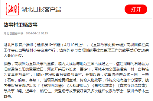 市政协文化文史和学习委员会、市政协高坝洲镇活动组在白鸭垴村召开宜都文史《宜都故事史料专辑》高坝洲镇征集工作会。