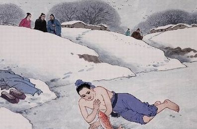王祥少年丧母,父亲又娶了个姓朱的女人。后母对王祥非常刻薄,王祥孝心不改,逆来顺受。有一年冬天,后母心血来潮要吃鲤鱼,王祥就到河里去捉。河水已结成了厚厚的冰,王祥就用铁锨去铲,冰层裂开,从水里蹦出来两条鲜活的鲤鱼。传说至此,人们又加入了自己美好的意愿,后来就改成了卧冰求鲤。王祥跪在冰上,要用自己的体温融化寒冰,天地为之感动,冰层自行裂开,两条鲤鱼跃了出来。