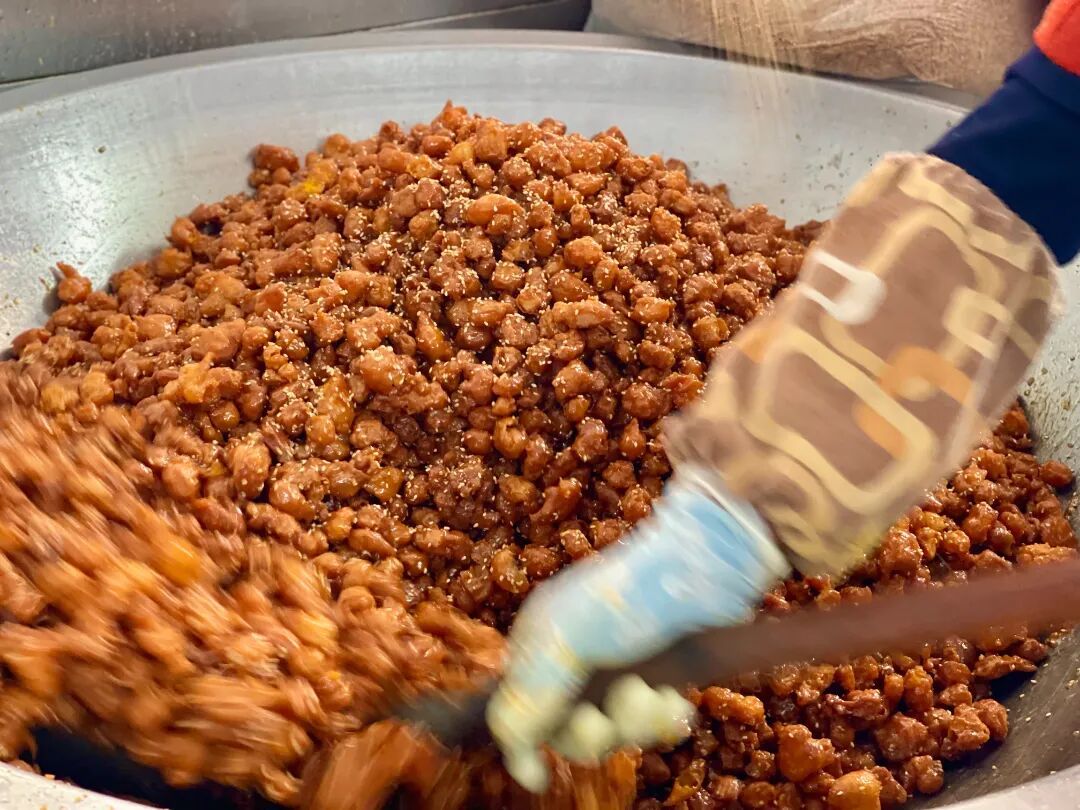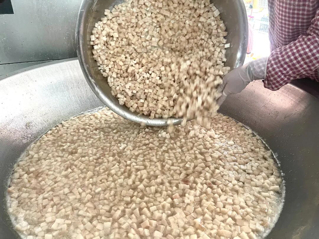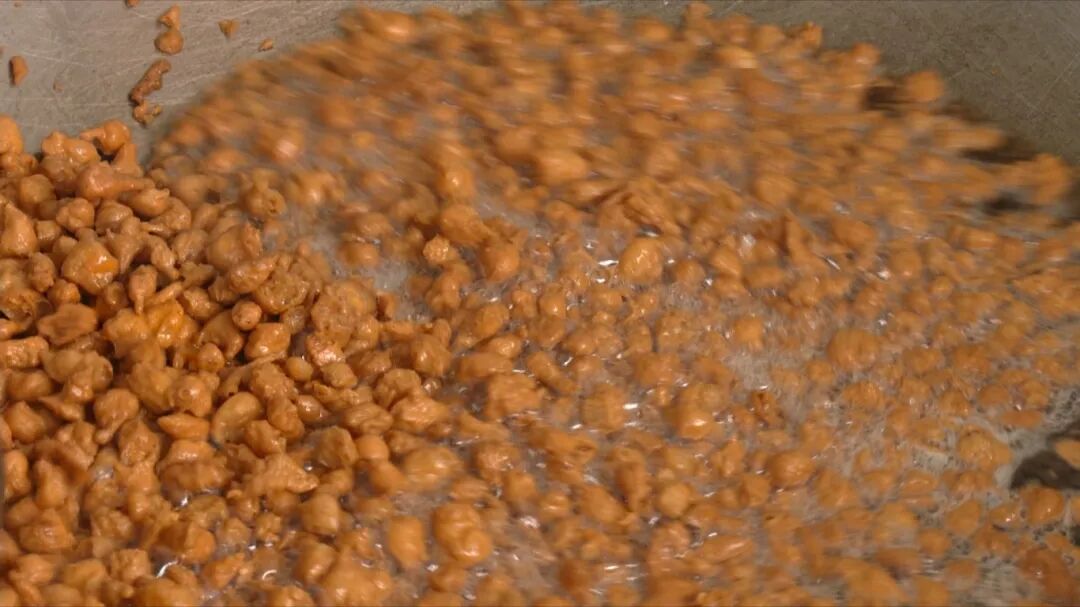 来自鹤庆县云鹤镇的张大姐做高高丽肉丽肉已经很多年,只见她将煮好的猪肥膘肉切成小块状,然后焯水去除油脂;接着,放入调好的鸡蛋和面粉,使其表面裹上一层薄薄的糊。之后,将油加热至适宜温度,慢慢炸,直到肥肉内部油脂被抽干,表面金黄酥脆。此时,撒上芝麻、陈皮等食料,再将熬制好的红糖浆放入肥肉中翻炒,使其均匀裹上糖浆,即可出锅。