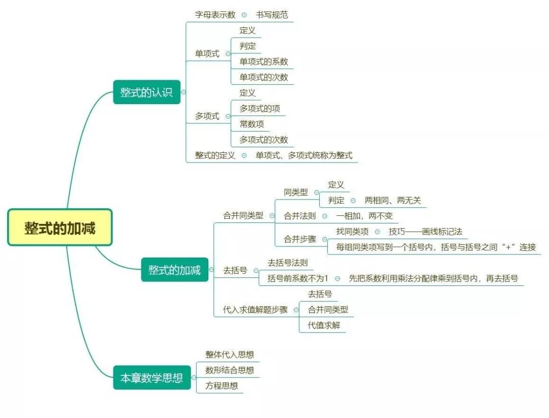 5.整式的加减运算法则:几个整式相加减,通常用括号把每一个整式括起来,再用加、减号连接,然后去括号,合并同类项。