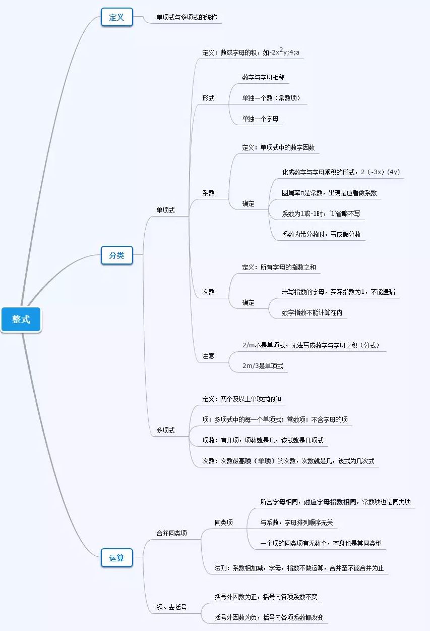 ①单项式:都是数字和字母乘积的形式的代数式叫做单项式。单项式中,所有字母的指数之和叫做这个单项式的次数;数字因数叫做这个单项式的系数。