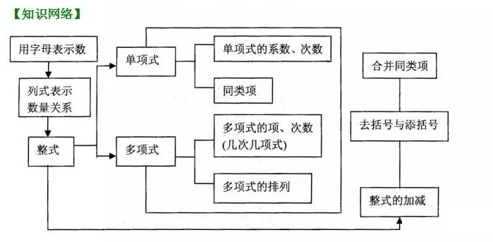 ②多项式:几个单项式的和叫做多项式。多项式中,每个单项式叫做多项式的项;次数最高的项的次数叫做多项式的次数。