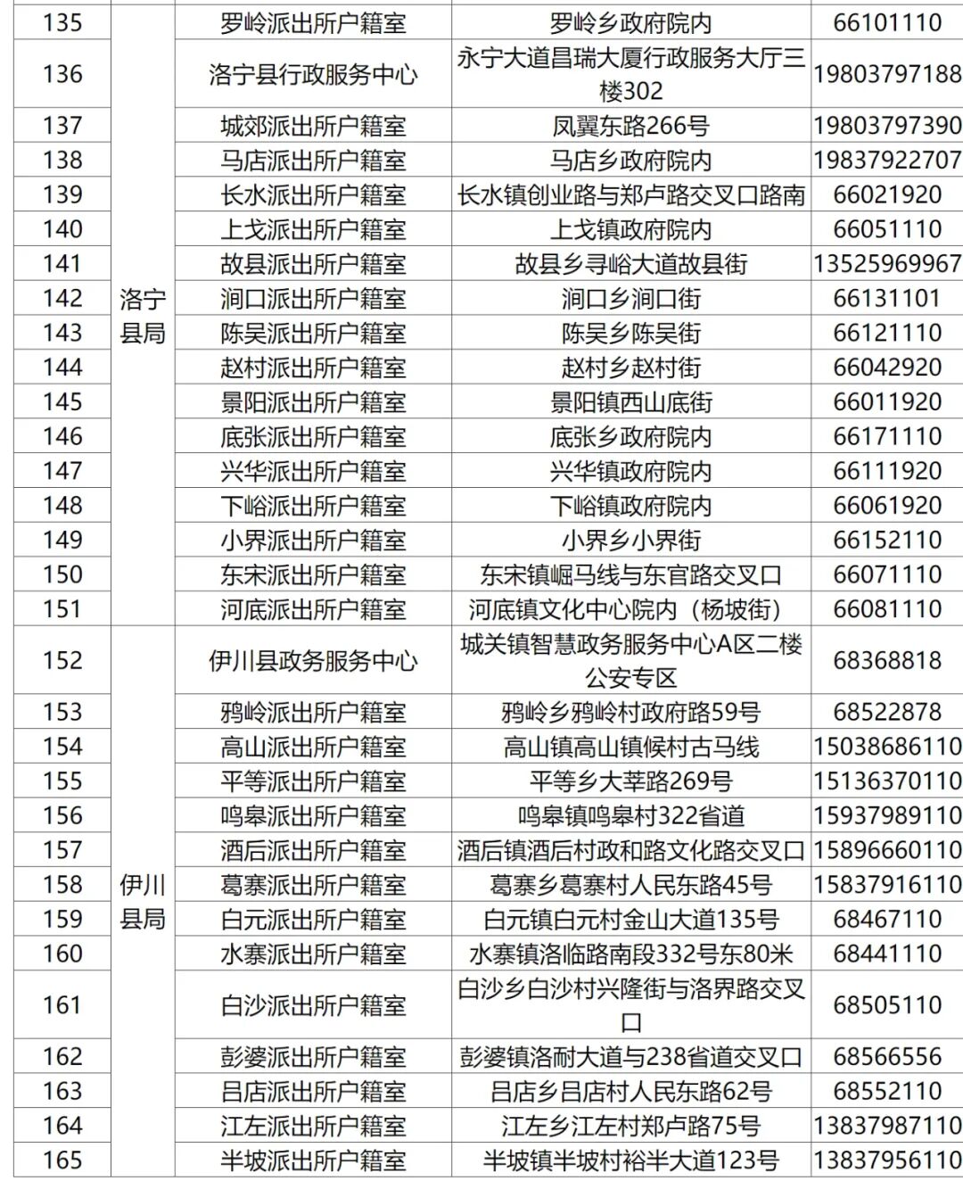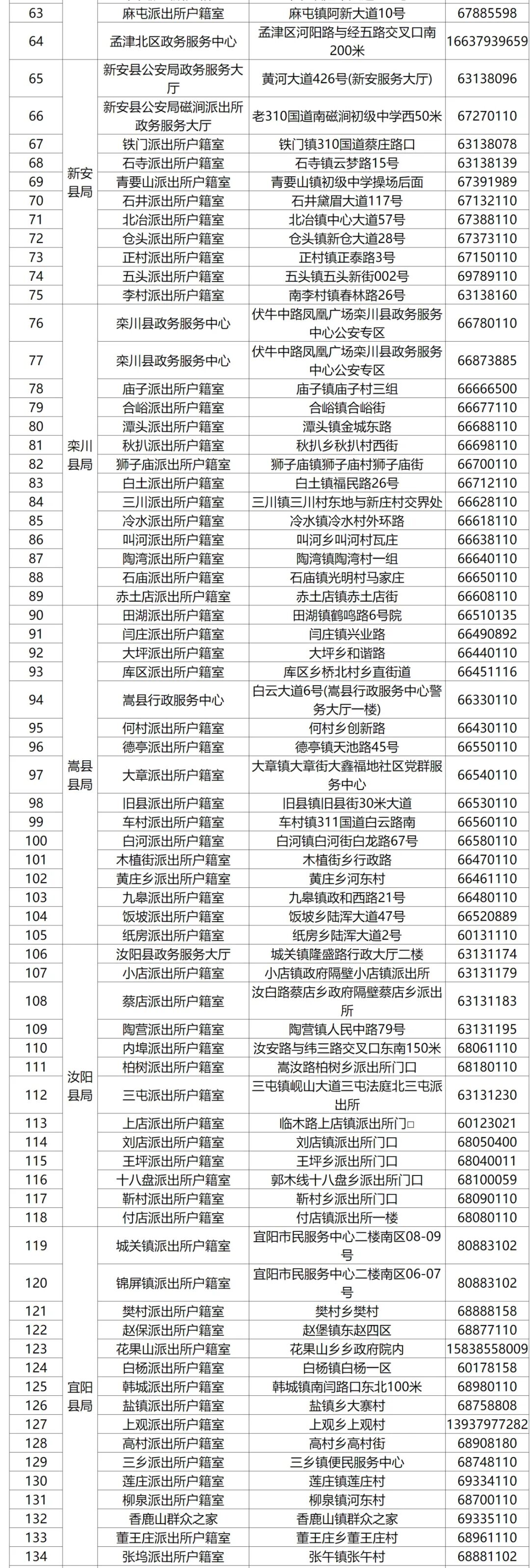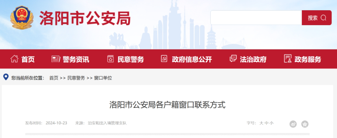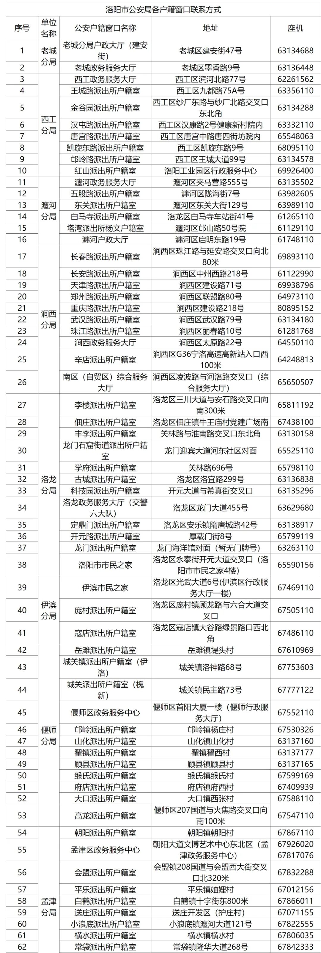 洛阳市公安局各户籍窗口联系方式