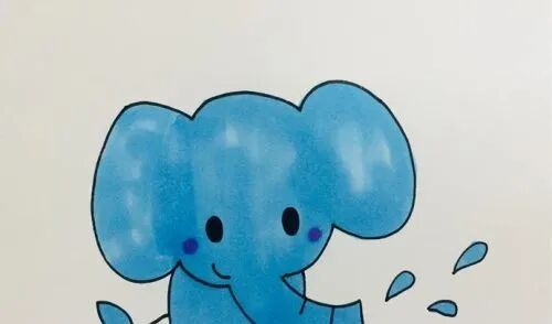 6.最终给画好的小象全身上下涂蓝色,双眼涂黑色,面颊涂两个个浅紫色的腮红,一个超萌的小象简笔画就画好了。