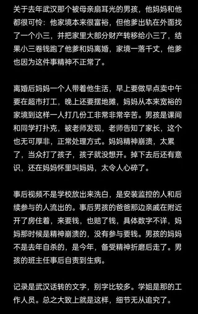 反倒是男孩的父亲,与自己亲戚一起,大闹学校,拿到了一笔不菲的赔偿金。看到这样的结果,很多人表示不能接受,为什么三个人中导致家庭破碎的最坏的那个男人却成为了利益既得者?明明他才是一切悲剧的源头啊?!可怜这位母亲,她拼死拼活、一天打三份工,就为了自己儿子能过得好一点儿,儿子没了也等于把妈妈的命要走了……