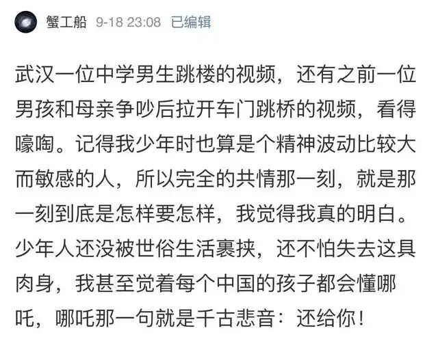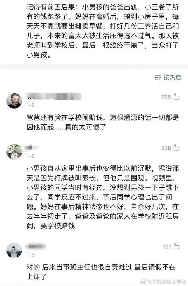 武汉跳楼之后嘴里还一直不停的骂着男孩,这样她还是不解气,最后居然用手摁着孩子的脖子,直到班主任老师赶到,将这位母亲劝走;整个被母亲打骂的期间,男生始终靠着走廊上的一根柱子上,一言不发,任凭母亲发泄着愤怒。 武汉跳楼