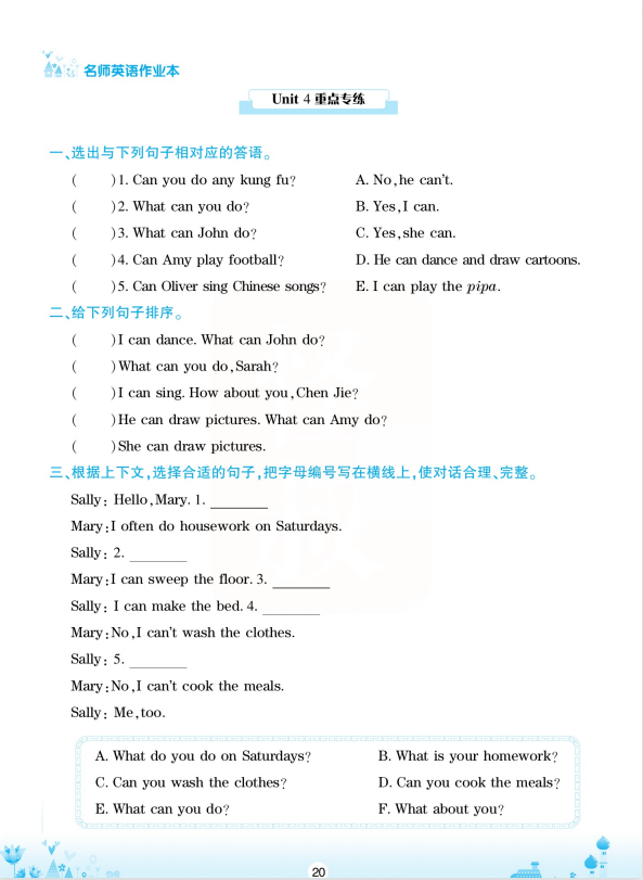 这是询问某人能做什么的问句及答语,用来询问某人的能力。