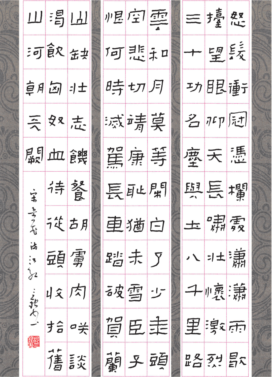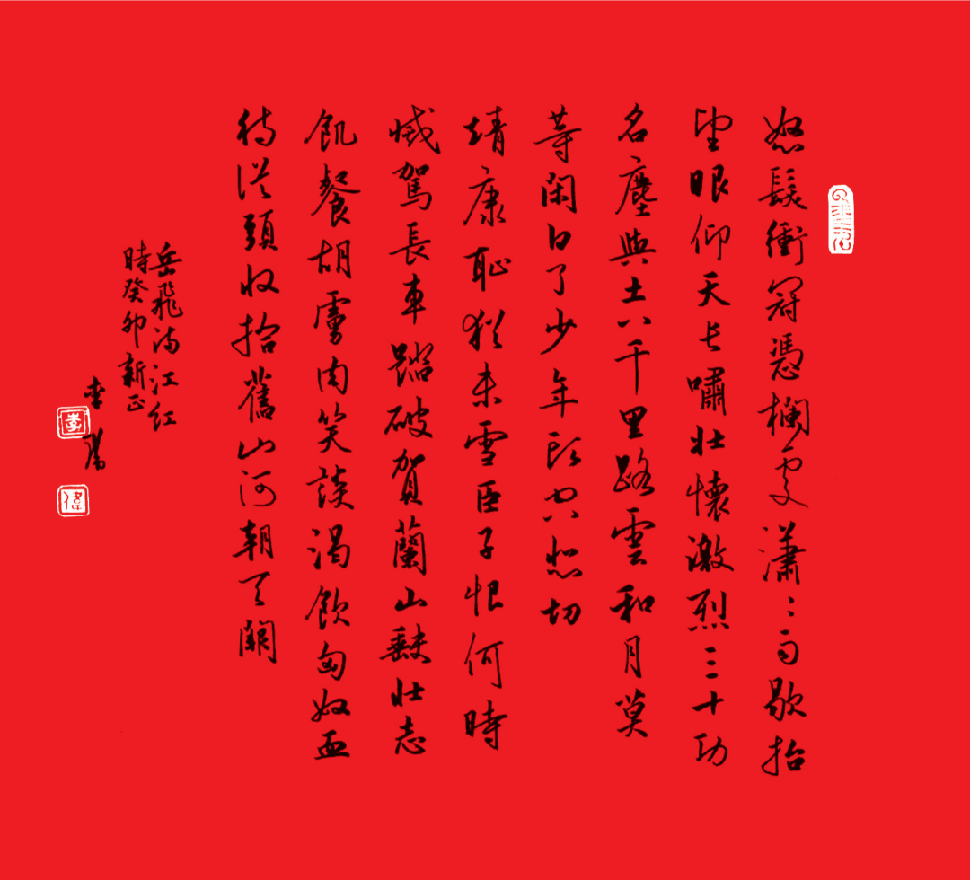 靖康耻,犹未雪。臣子恨,何时灭!驾长车,踏破贺兰山缺。壮志饥餐胡虏肉,笑谈渴饮匈奴血。待从头、收拾旧山河,朝天阙。