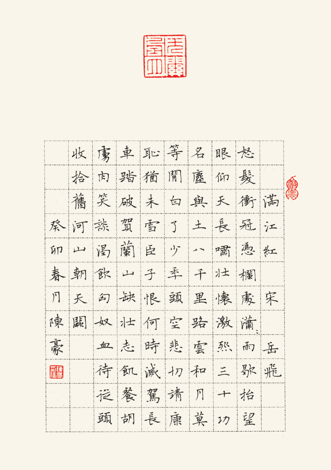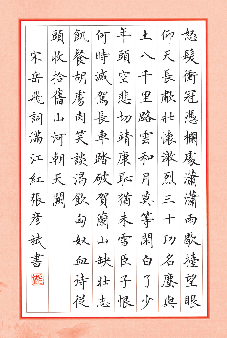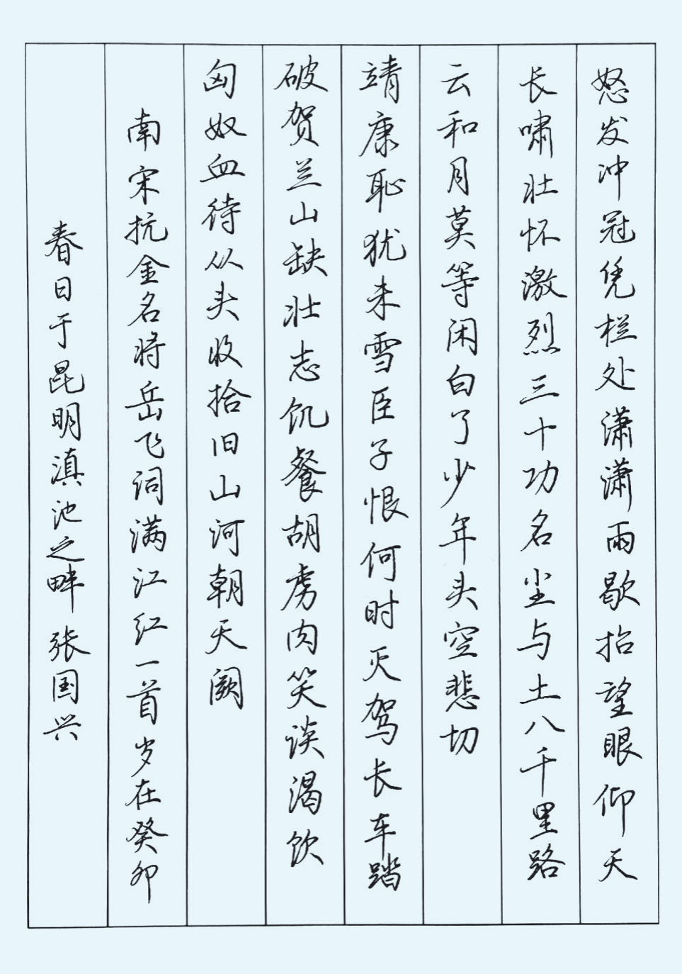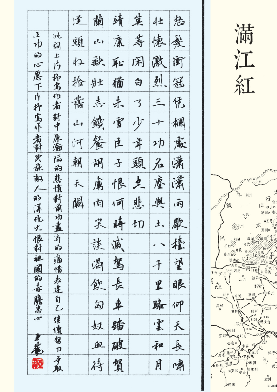 怒发冲冠,凭栏处、潇潇雨歇。抬望眼,仰天长啸,壮怀激烈。三十功名尘与土,八千里路云和月。莫等闲,白了少年头,空悲切!
