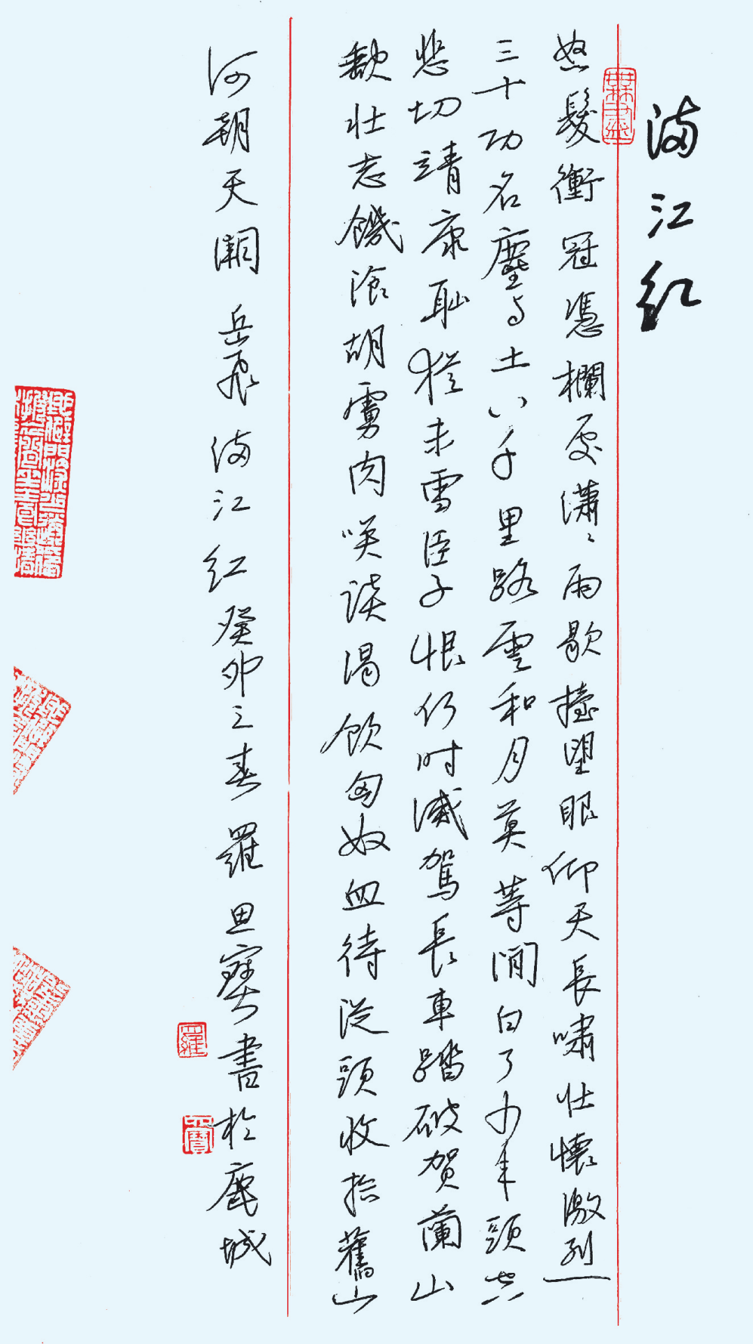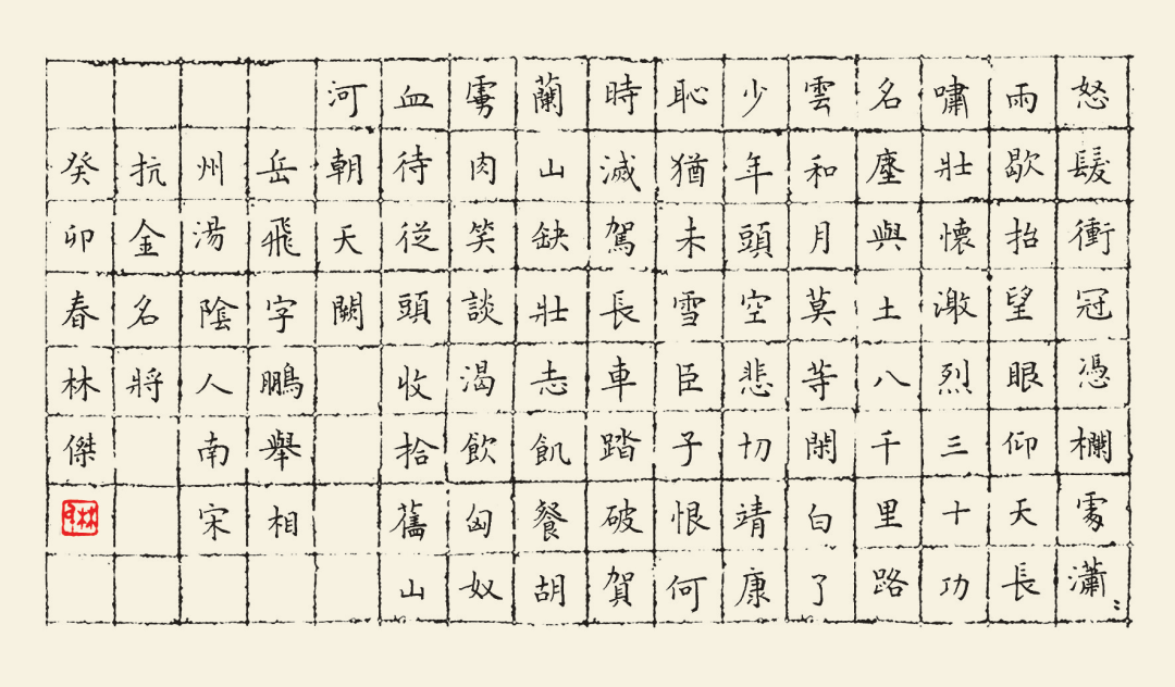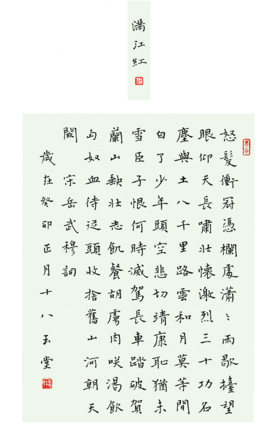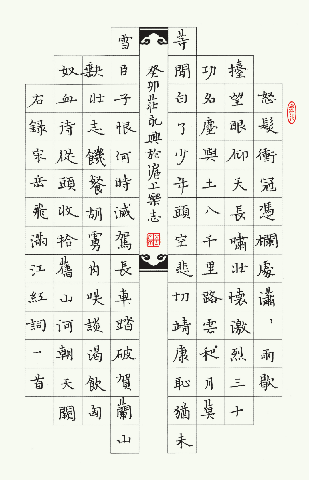 怒发冲冠,凭栏处、潇潇雨歇。抬望眼,仰天长啸,壮怀激烈。三十功名尘与土,八千里路云和月。莫等闲,白了少年头,空悲切!