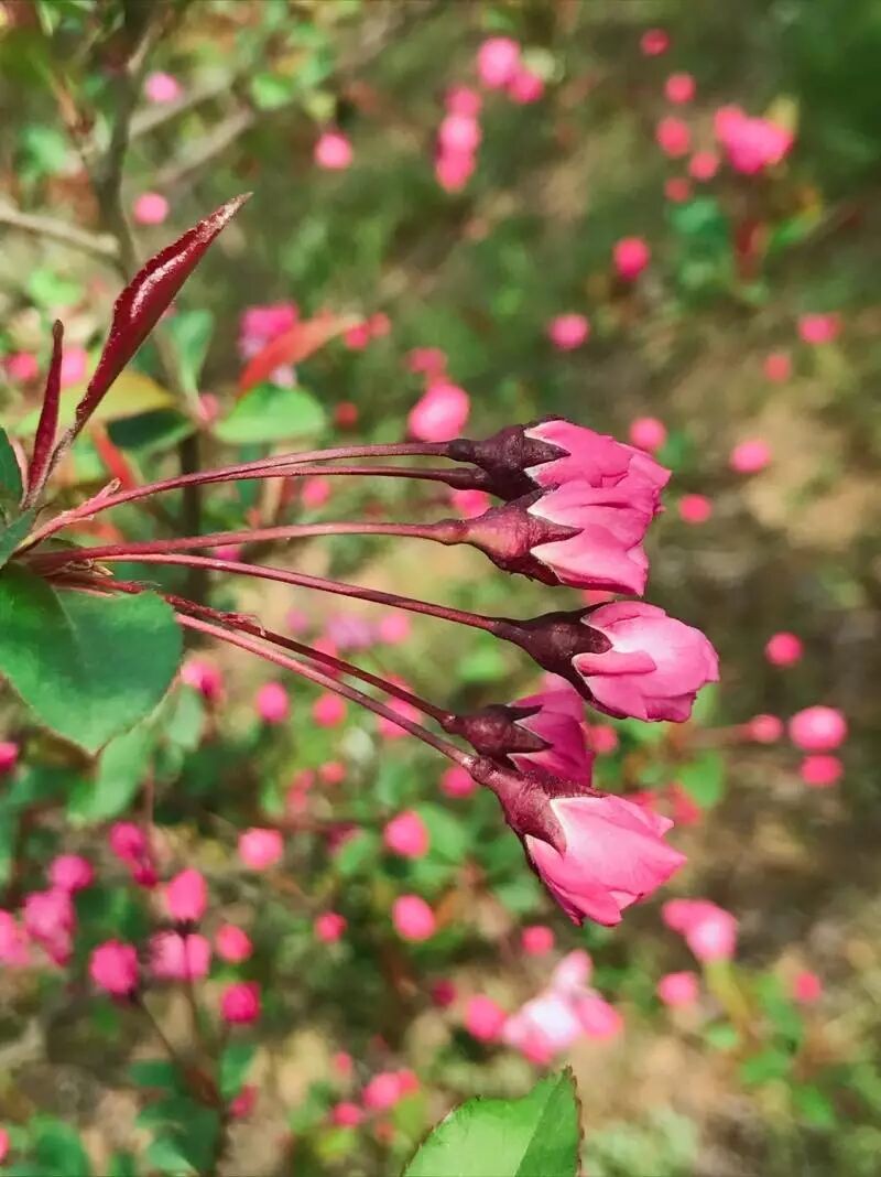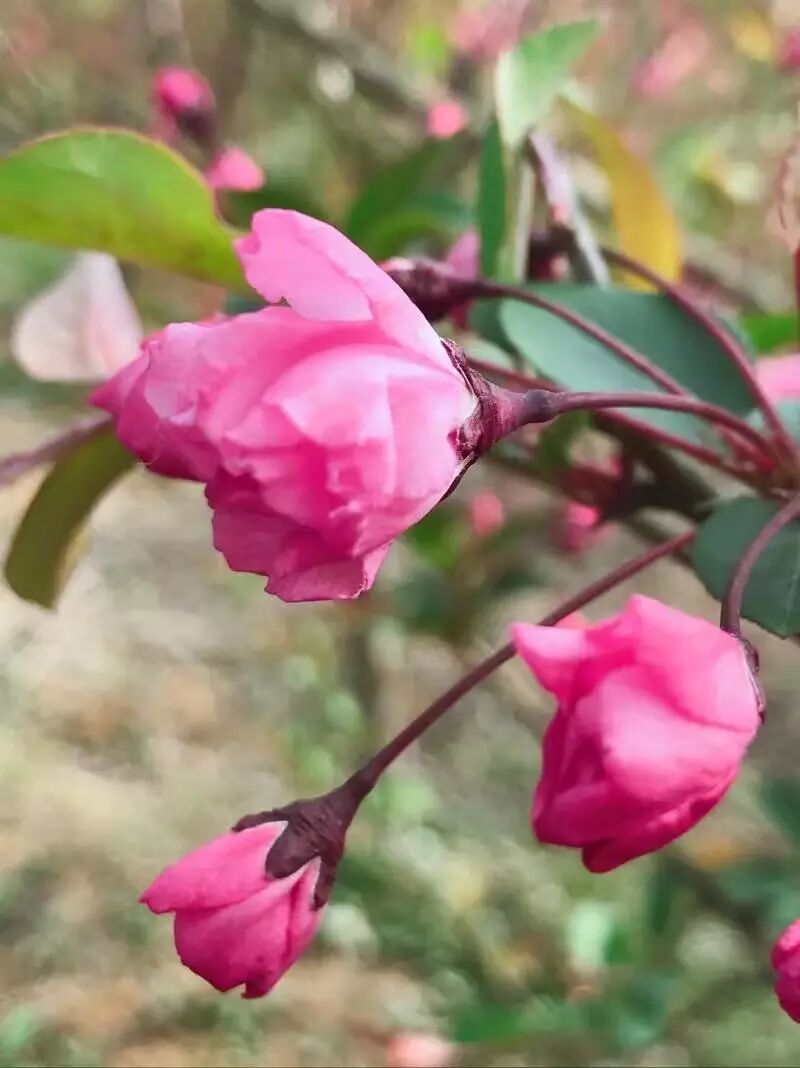 “秾丽最宜新著雨,娇娆全在欲开时。”海棠花最美时,是早春著雨后的花蕊,一颗颗晶莹剔透的雨珠徜徉在花苞上,像宝石、像樱桃、像胭脂,娇艳欲滴,妩媚动人,含情脉脉。海棠的风韵,也让古人“朝醉暮吟看不足”,甚至羡慕缀在枝头的蝴蝶,可以一整天欣赏海棠的美丽!