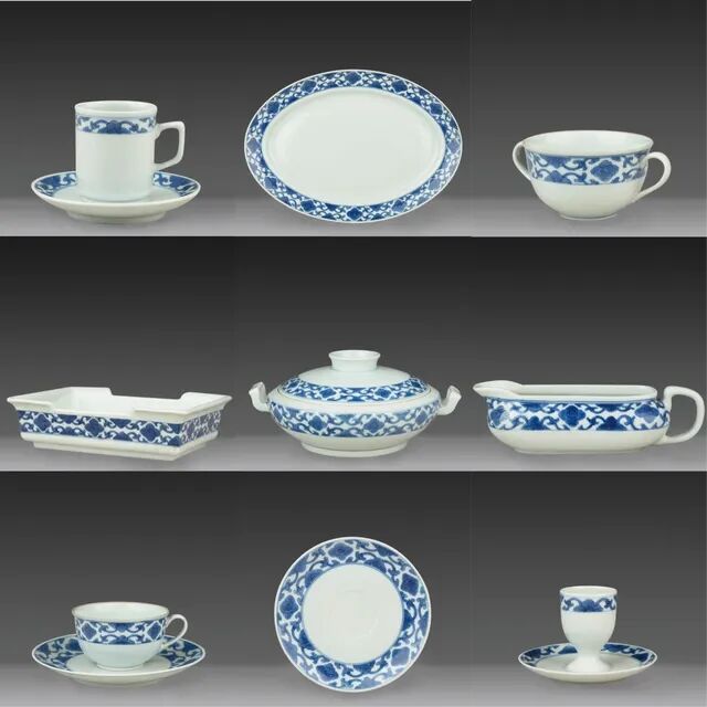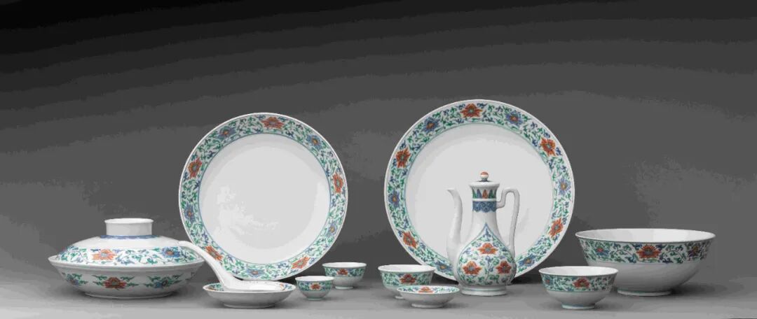 祝大年是中国现代陶瓷艺术的开拓者之一。1935年,他经同乡蔡元培推荐赴日本留学专研陶瓷艺术。在日本期间,祝大年接触到了正在兴起的现代艺术和包豪斯设计思想,这些典型的现代工业社会的审美意识深深地影响了祝大年。 青花斗彩缠枝花牡丹纹中餐具“建国瓷”,1954年 瓷 大美无言