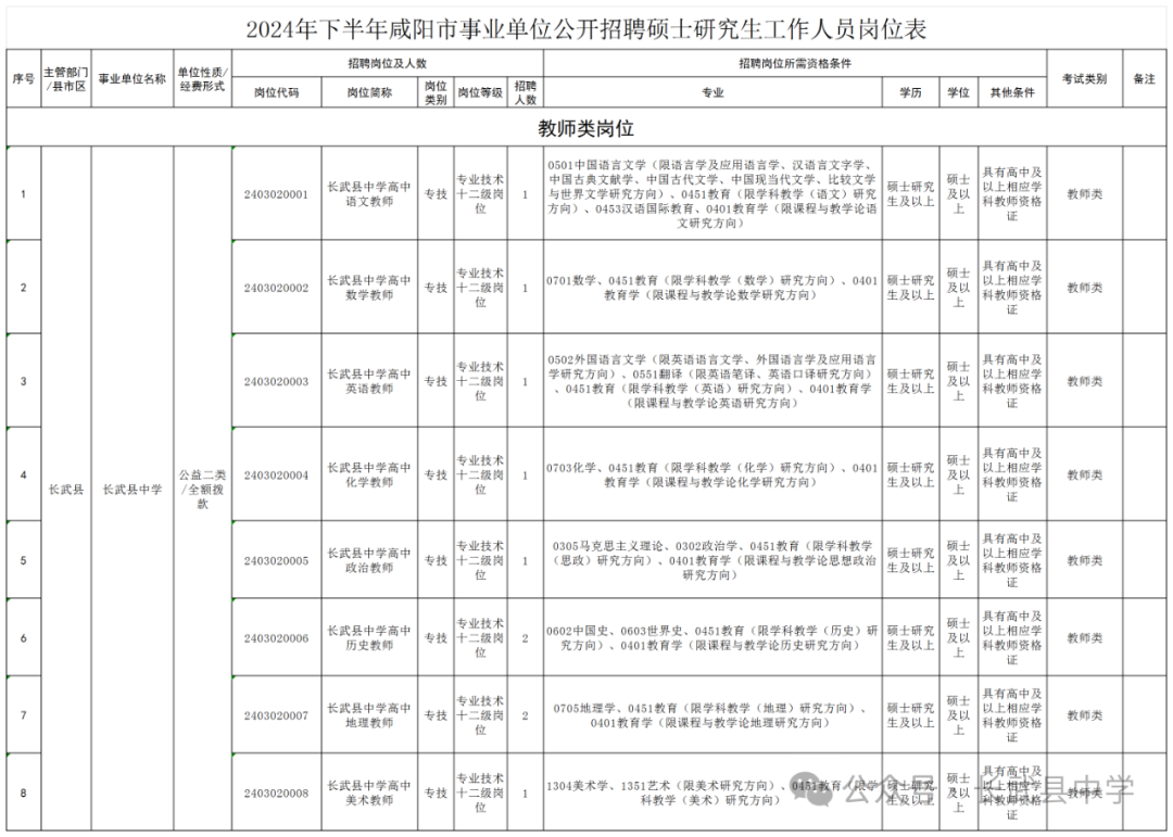 长武县中学 公开招聘硕士研究生以上学历10人 根据《事业单位人事管理条例》《陕西省事业单位公开招聘工作人员实施办法》及相关规定,现面向社会公开招聘硕士研究生工作人员52名,(其中:长武县中学招聘硕士研究生以上学历高中语文、数学、英语、化学、政治、历史、地理、美术教师10名)。现将有关事项公告如下: 一 招聘条件 (一)应聘基本条件 1.具有中华人民共和国国籍; 长武县中学2.拥护中华人民共和国宪法和法律法规,拥护中国共产党领导和社会主义制度,品行端正,遵纪守法; 3.年龄为18周岁以上,35周岁以下(1988年10月21日至2006年10月20日期间出生); 4.具有招聘岗位所需的学历、专业或技能条件。其中,学历为国家教育行政主管部门认可的研究生及以上文化程度;专业以国家教育行政主管部门公布的研究生专业目录为准。留学归国等应聘人员所学学科专业与资格条件要求的学科专业相近但不在选定参考目录的,由资格审查部门(单位)结合所学课程、研究方向等进行审查。毕业证、学位证以及招聘岗位所要求的各类证书2024年10月31日(含)前均须取得; 5.适应招聘岗位要求的身体条件和心理素质; 6.具备招聘岗位所需的其他条件; ????招聘岗位等级及资格条件由事业单位设置,具体以《2024年下半年咸阳市事业单位公开招聘硕士研究生工作人员岗位表》的要求为准。 ????在招聘岗位表中,专业为一级学科(或专业类别)的,该一级学科(或专业类别)下所属的单个专业均可报考;专业名称加括号限研究方向的,仅限括号内的二级学科专业或专业领域专业可以报考。 (二)不符合报名应聘的主要情形 1.2024年10月20日(含)前,已被招聘为2024年事业单位正式工作人员的(以发文为准); 2.曾因犯罪受过刑事处罚或曾受过开除处分;在立案审查期间或未解除党纪、政纪处分的; 3.曾在公务员招录、事业单位公开招聘中被认定有舞弊等严重违反纪律行为的; 4.现役军人和在读的非2024年应届毕业生,以及在读的非2024年应届毕业生用以往取得的学历报名的; 5.事业单位人事管理需要回避的; 6.事业单位工作人员、公务员(含参照公务员法管理单位工作人员)有服务年限规定且服务年限未满的;特岗教师、“三支一扶”人员在服务期内的;服务期计算截止时间为2024年12月31日; 7.失信被执行人; 8.法律、法规规定不符合本次招聘要求的。 二 招聘程序 (一)招聘公告 ????招聘公告在咸阳市人民政府网站(网址:www.xianyang.gov.cn)和咸阳市人力资源和社会保障局网站(网址:xyrs.xianyang.gov.cn)发布。 (二)网上报名与资格初审???? ????报名采取网络报名和网上资格审查的方式进行,资格审查由市人社局组织实施。报名网站为咸阳市人力资源和社会保障局网站(网址:xyrs.xianyang.gov.cn)。 ????报名时间:2024年10月21日08:00至10月25日18:00。 ????应聘人员只能报考一个岗位。在报名期间,资格审查未通过前可以更改报考信息,资格审查通过后,报考信息不得更改。本次报名不收取报名费。 ????根据省卫健委等四部门《关于贯彻落实住院医师规范化培训“两个同等对待”政策的通知》(陕卫科教发〔2021〕66号)规定:“经住培合格的本科学历临床医师,按临床医学、口腔医学、中医专业学位硕士研究生同等对待”。 ????为便于应聘人员选报岗位,10月24日18:00之前,报名系统将实时显示各岗位的报名人数。10月24日18:00之后,报名系统将不再显示各岗位报名人数。 ????资格审查时间:2024年10月21日08:00至10月26日12:00。 ????报名结束后(2024年10月25日18:00至10月26日12:00),应聘人员可以查询审核状况,但不能修改任何报名信息。 ????已网上资格审查通过的应聘人员应及时打印《2024年下半年咸阳市事业单位公开招聘硕士研究生工作人员报名登记表》并妥善保管,以备后续各有关环节使用。 ????对应聘人员的资格审查贯穿于招聘工作全过程,无论在哪个环节发现应聘人员与岗位条件要求不符,均可取消应聘资格。 三 招聘岗位 长武县中学简介 简介 长武县中学创建于1941年,是一所办学历史悠久、文化积淀深厚的省级标准化高中。建校八十余年来,学校秉育才之宗旨,怀兴邦之宏愿,为国家培养了一大批德才兼备、卓有建树的优秀人才。新校于2013年9月投入使用,占地150亩,建筑面积60757平方米,投资2.3亿元,新校建成使用从根本上提升了我县高中教育的办学条件。学校现有59个教学班,学生3200余名,教职员工279名,高级职称79人,中级职称123人,特级教师1人,研究生13人。省级师德师风先进个人3人,省级优秀教师5人,省级学科带头人1人,省级教学能手5人,市级教学能手、“三五”人才,市级学科带头人和骨干教师等40余人。 学校始终坚持“为学生一生奠基,为民族未来负责”的办学理念,依法施教,以德治学,形成了“爱国、博学、励志、进取”的校风,“敬业、严谨、务实、求精”的教风和“自强、团结、勤勉、善学”的学风,教育质量连年攀升,为国家培养了一大批德才兼备的优秀人才。近年来,高考一本上线率保持在30%左右,二本上线率稳定在80%左右,考入国内一流名校学生人数不断增加,得到了各级领导的肯定和全县人民的赞扬,在周边县区也赢得了良好的声誉。 学校先后荣获“全国学校体育工作示范校”“全国篮球特色学校”、“全国足球特色学校”、国家“节约型公共机构示范单位”、“陕西省文明校园”、咸阳市先进集体、咸阳市“园林式校