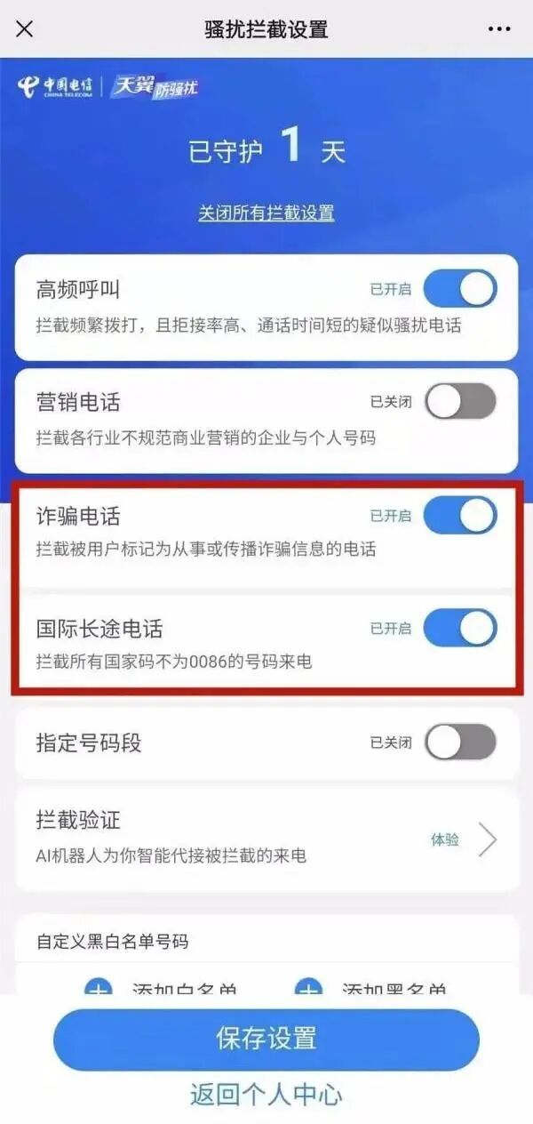 3. 登录后开启“国际长途电话”、“诈骗电话”拦截功能。