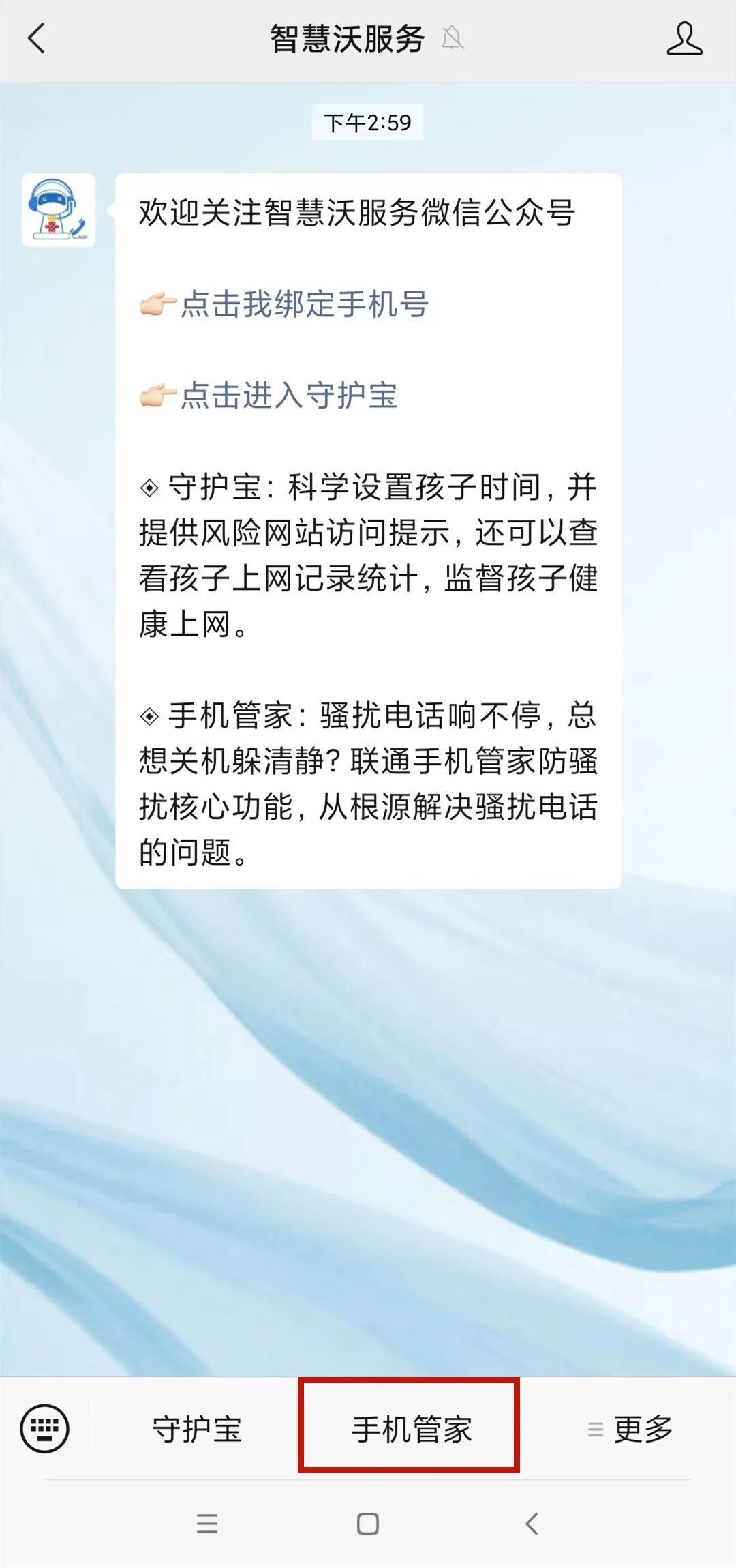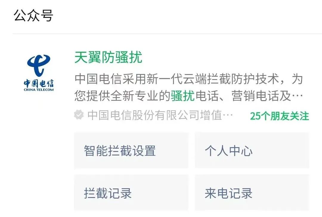 1. 中国电信用户打开手机微信搜索并关注公众号“天翼防骚扰”。